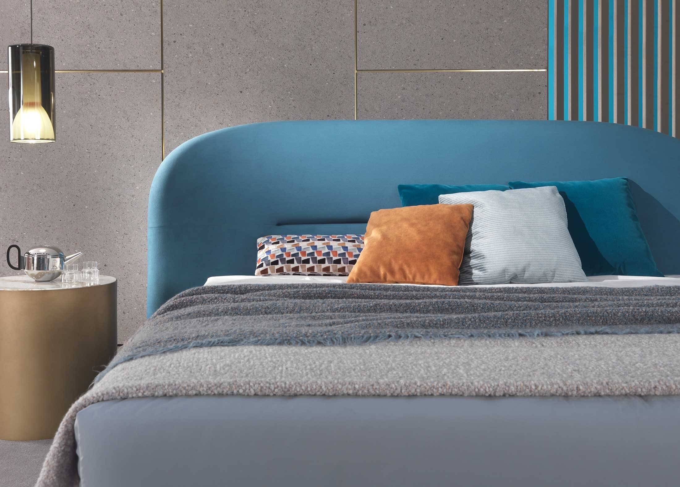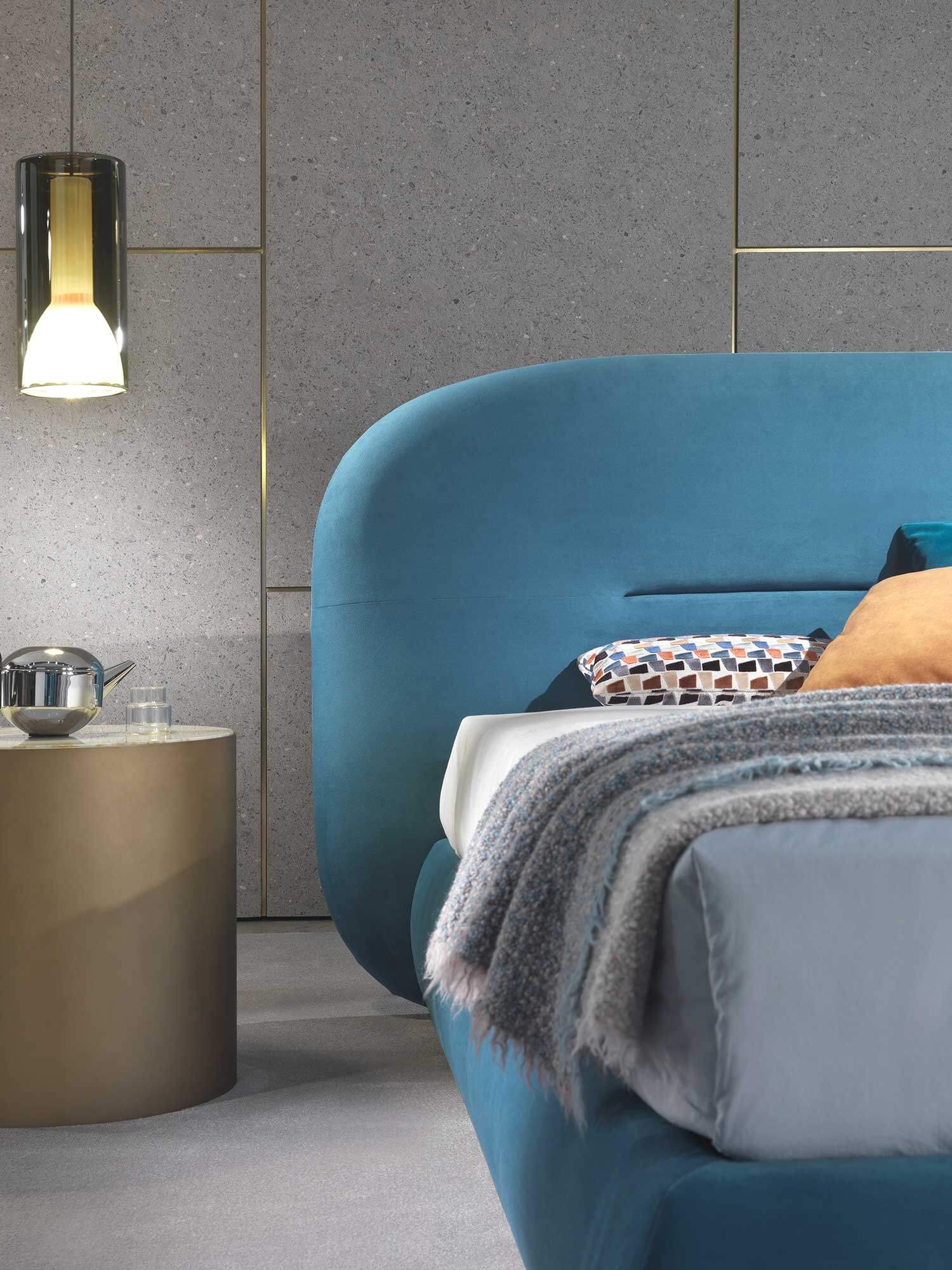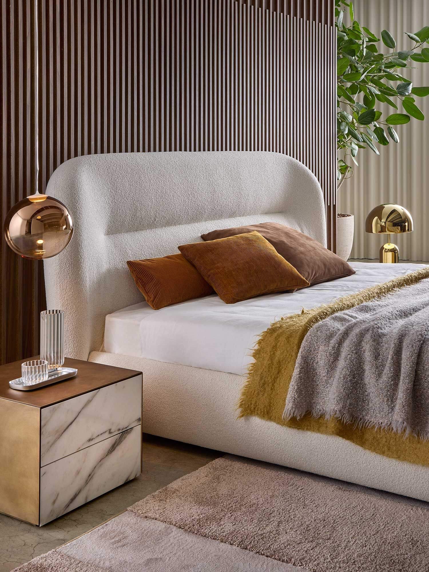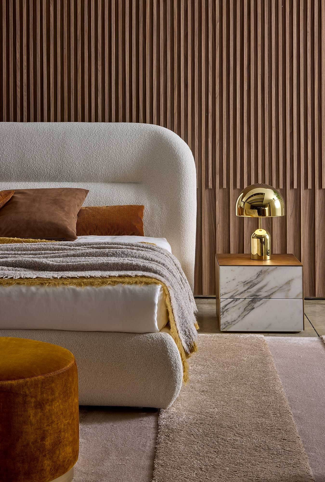 The Noah bed was inspired by the curved, sinuous and enveloping lines of the back of the sofa of the same name, creating a design that recalls the organic charm of the 1970s. This bed transforms any space into a warm and homely environment, offering a pleasant feeling of home comfort. Its distinctive lines give the headboard a strong personality, making it suitable not only for residential environments, but also for contract use, such as luxury hotels, offering guests a high-quality sleep and rest experience.