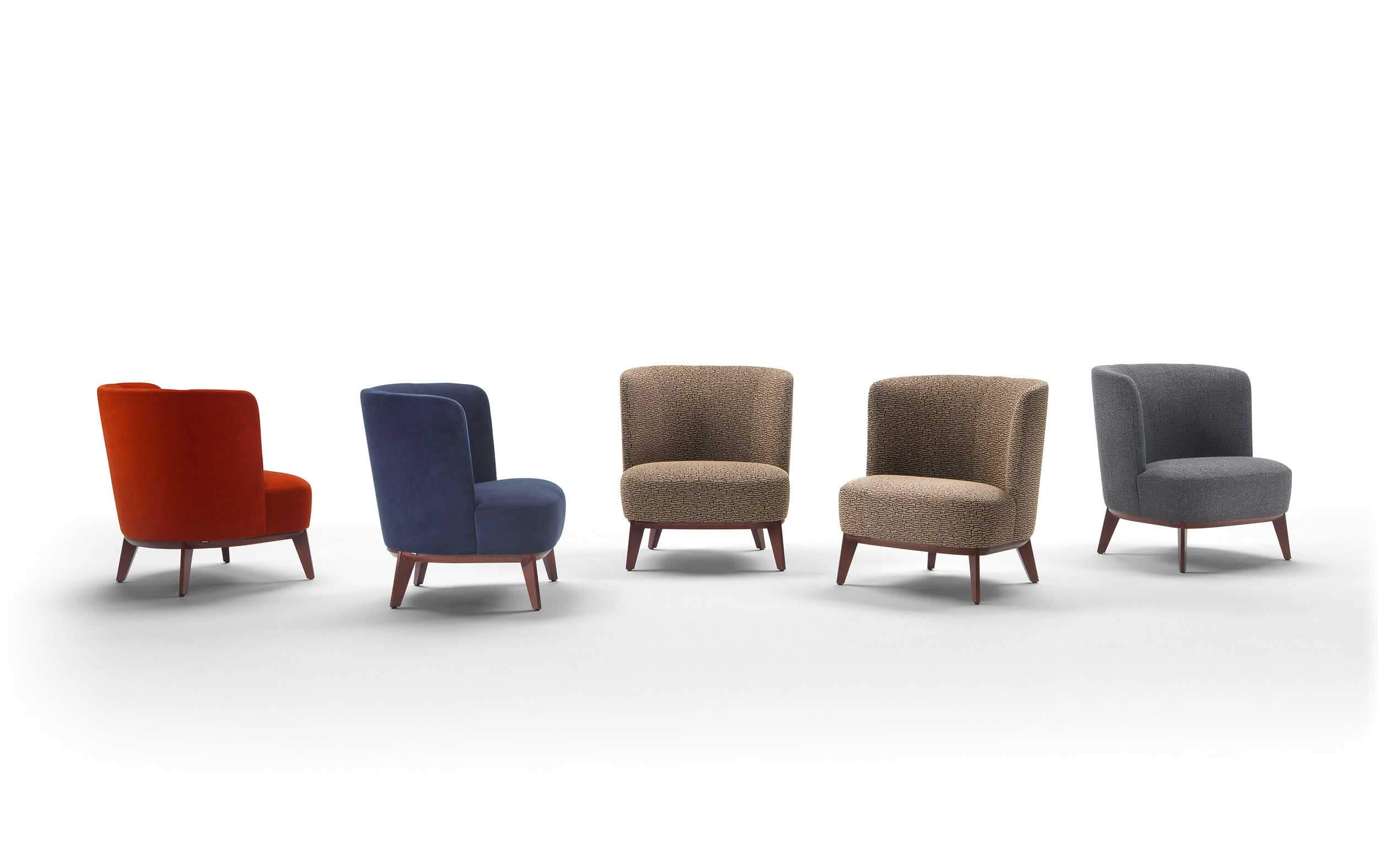 Derek is a family of armchairs and sofas characterised by soft, simple and fresh lines. This furniture has a clean look and can be customised with a metal or wooden base, depending on preference. The wide choice of fabrics, leathers and faux leathers allows them to be adapted to different projects and environments.