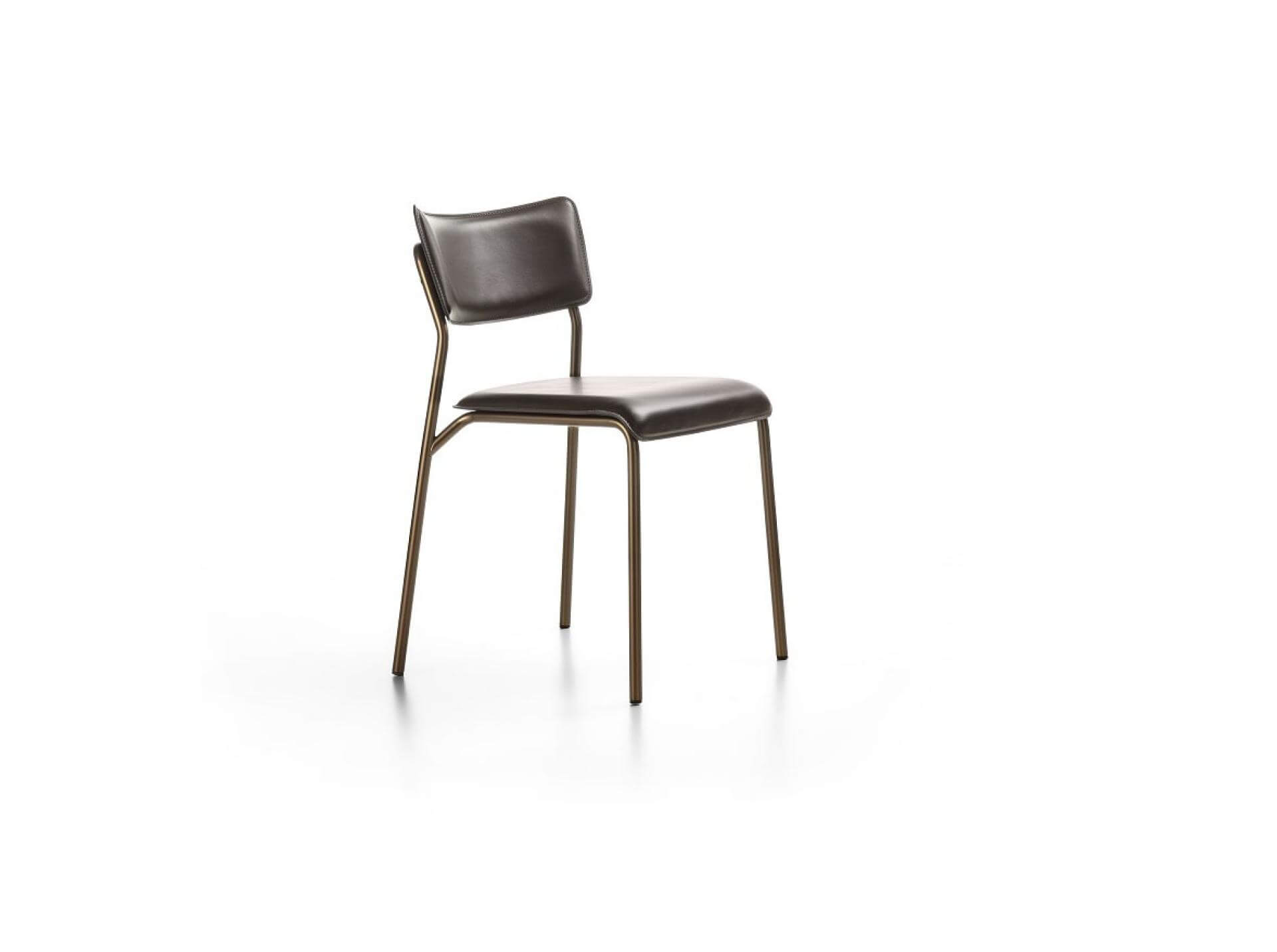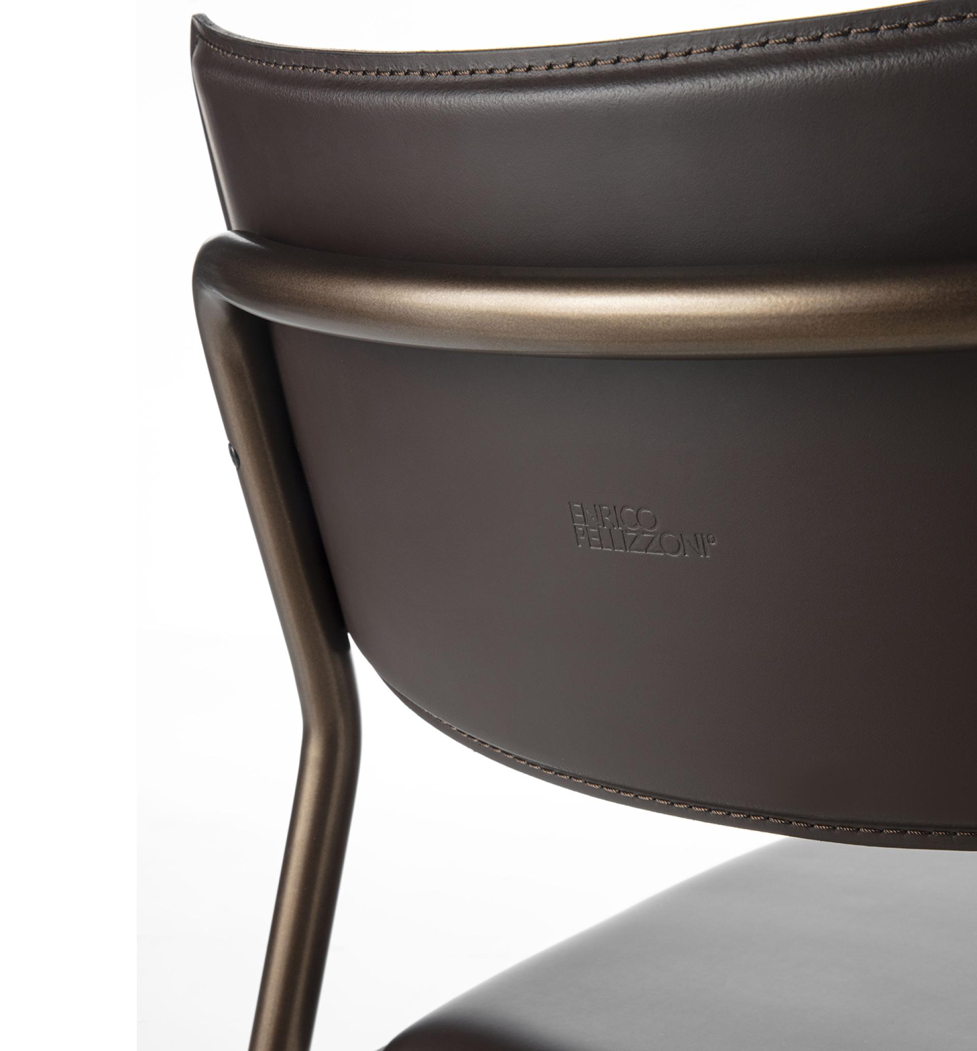Round section metal tubular structure with seat and back in ply wood covered in leather. A light, comfortable, versatile, handy seat with an elegant combination of materials.