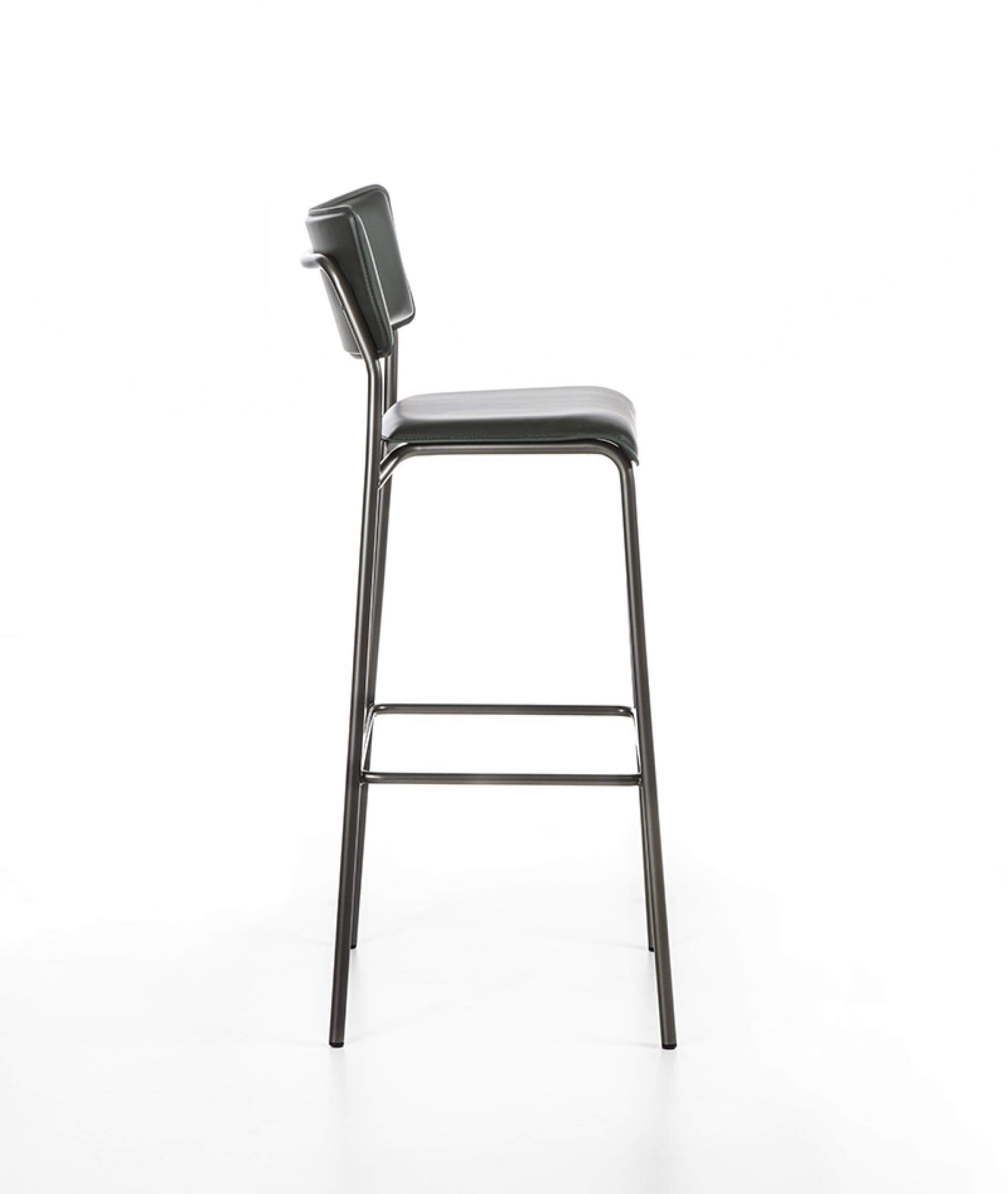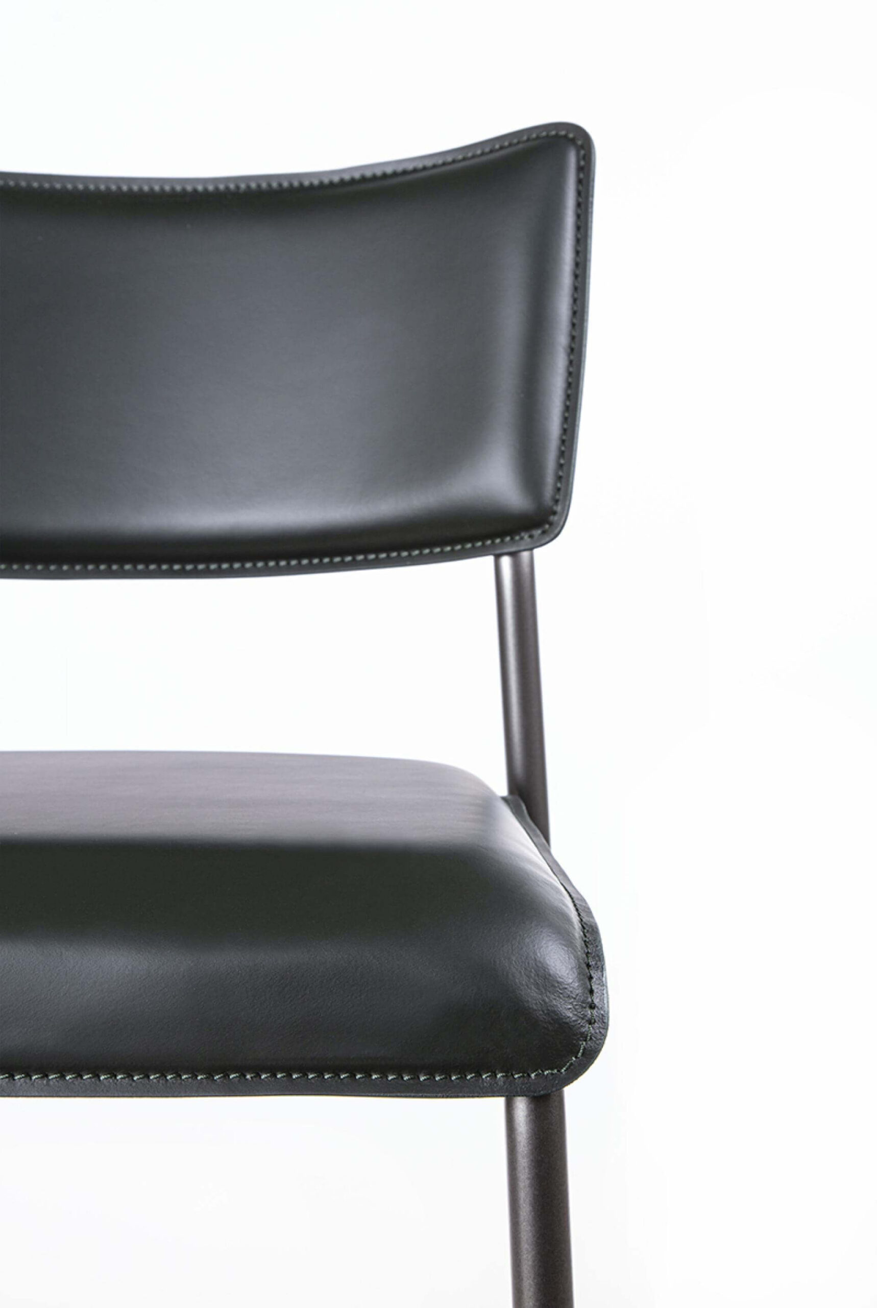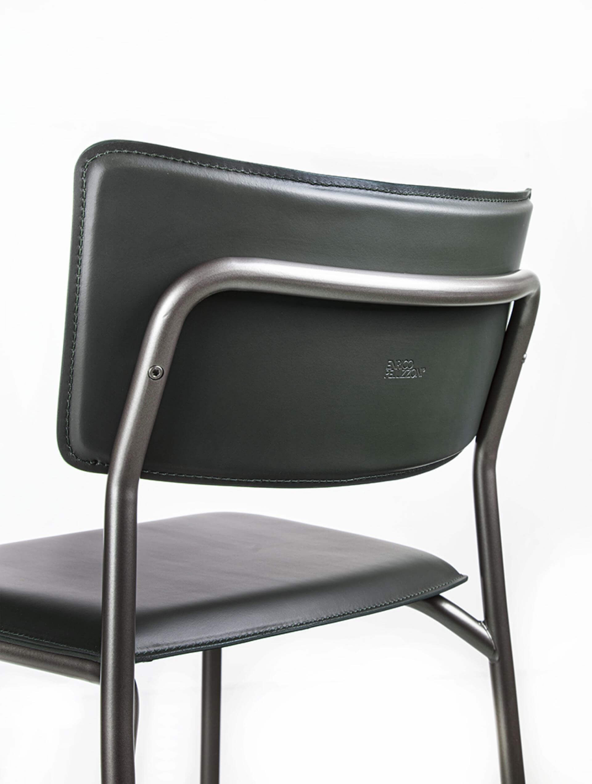 Round section metal tubular structure available in various painted colors. Seat and back in curved multy ply beech covered in leather.
