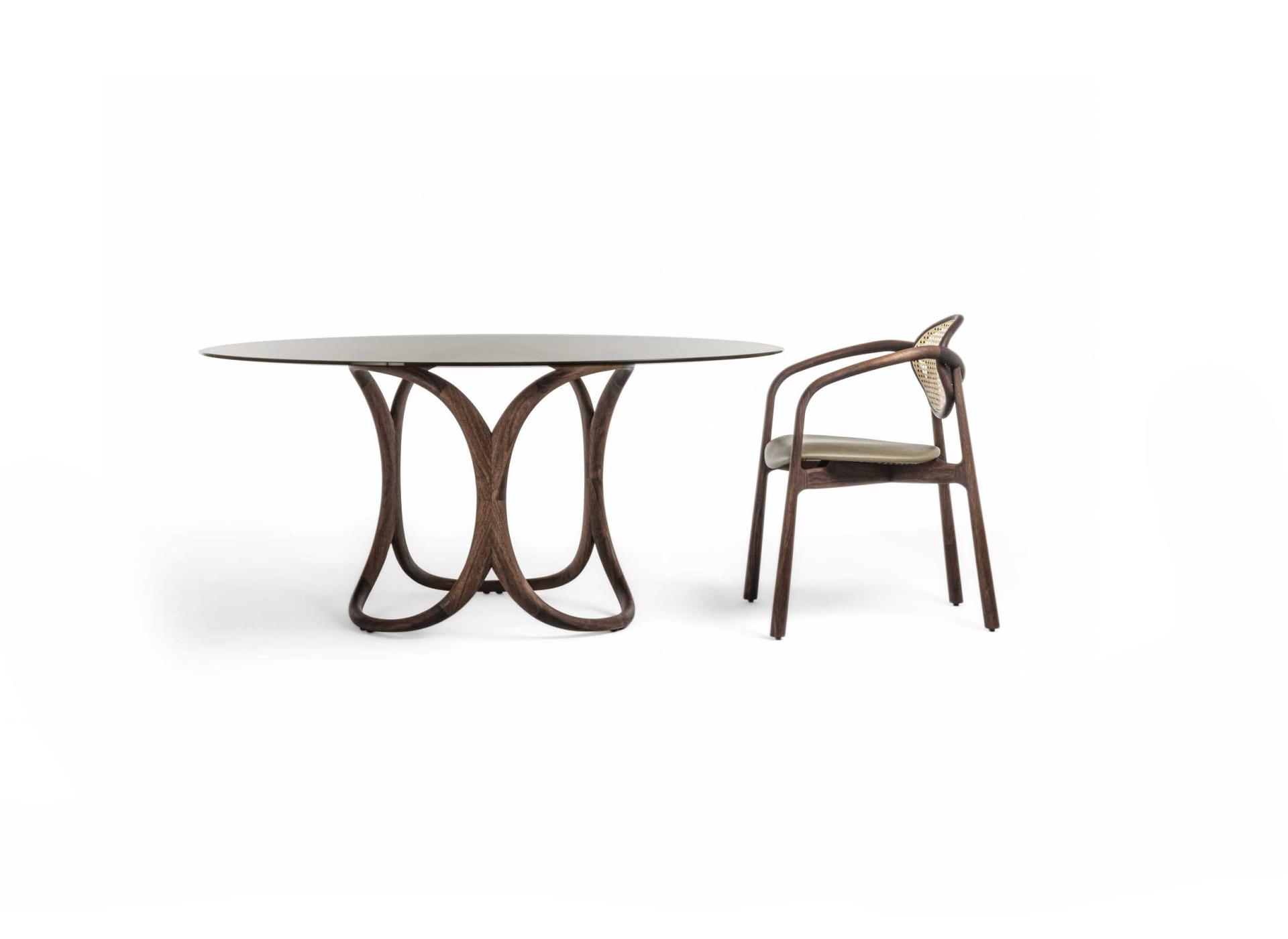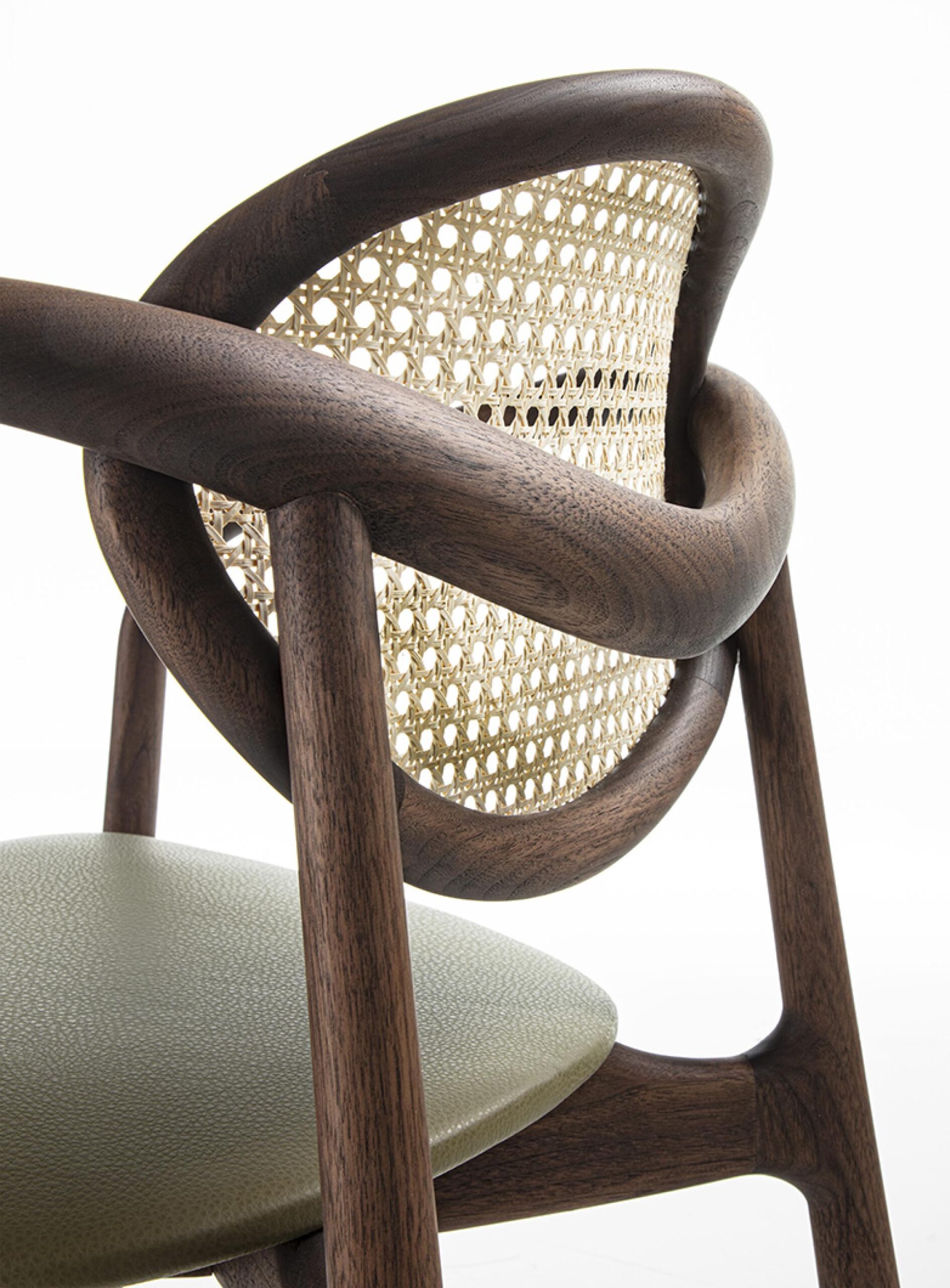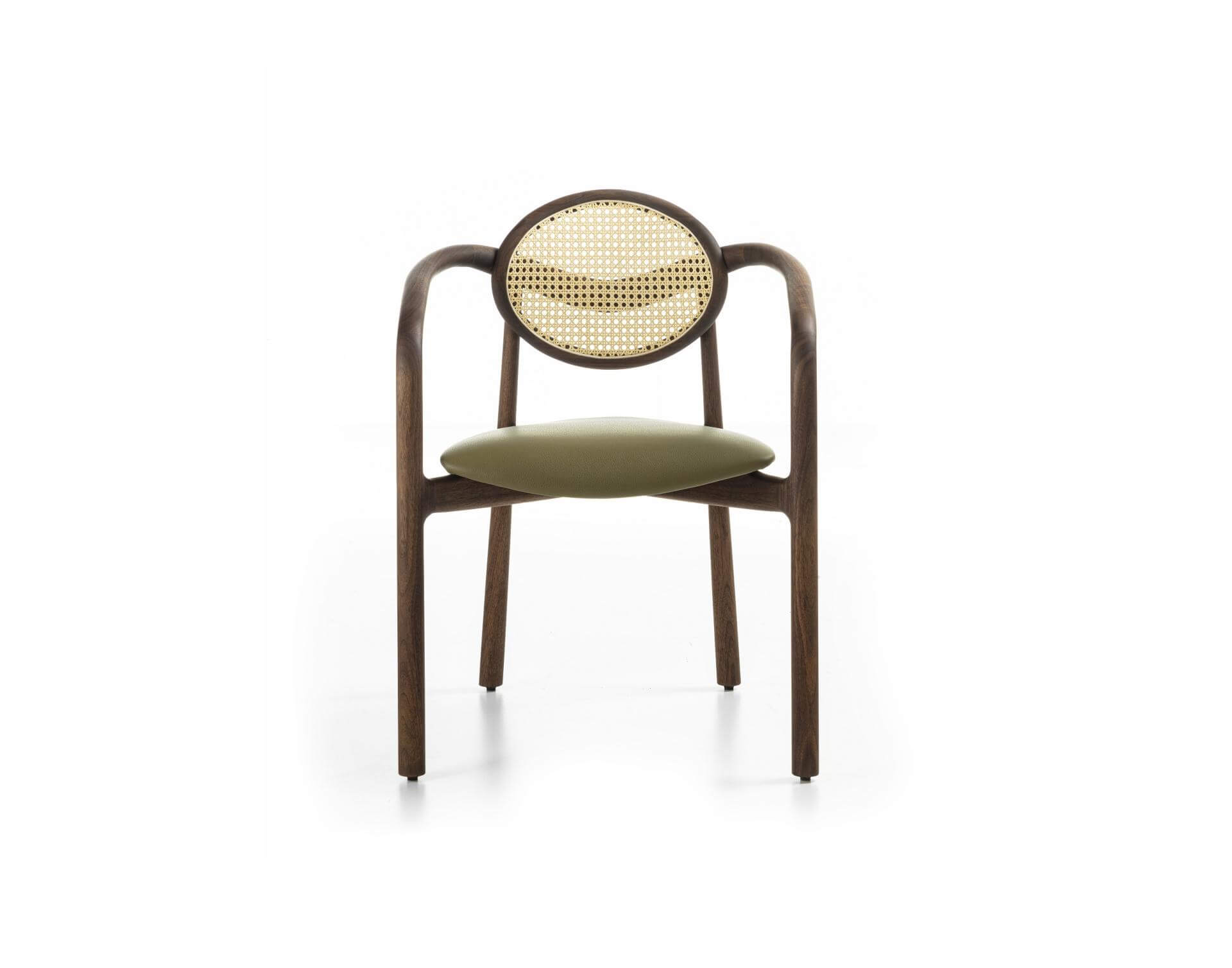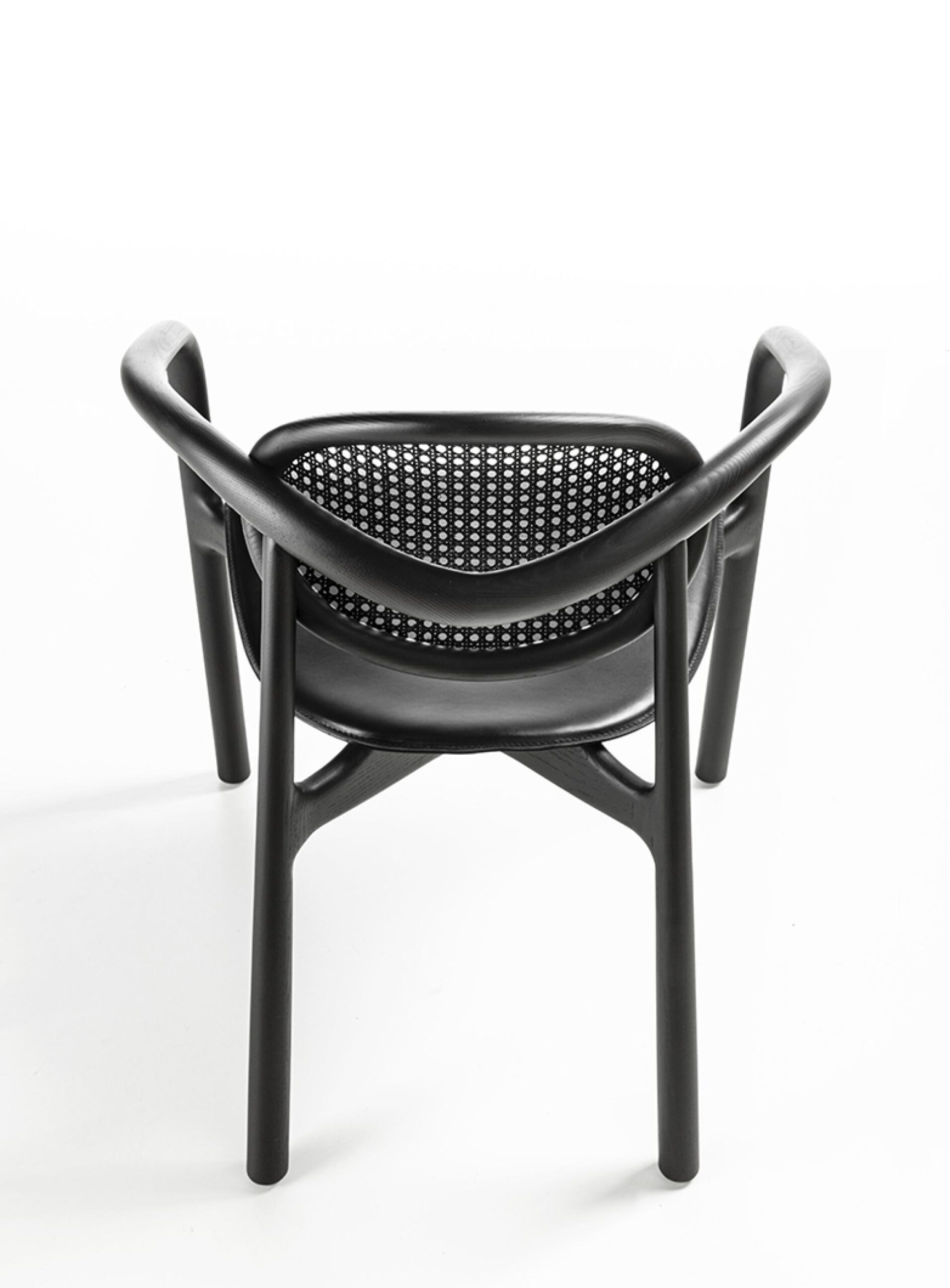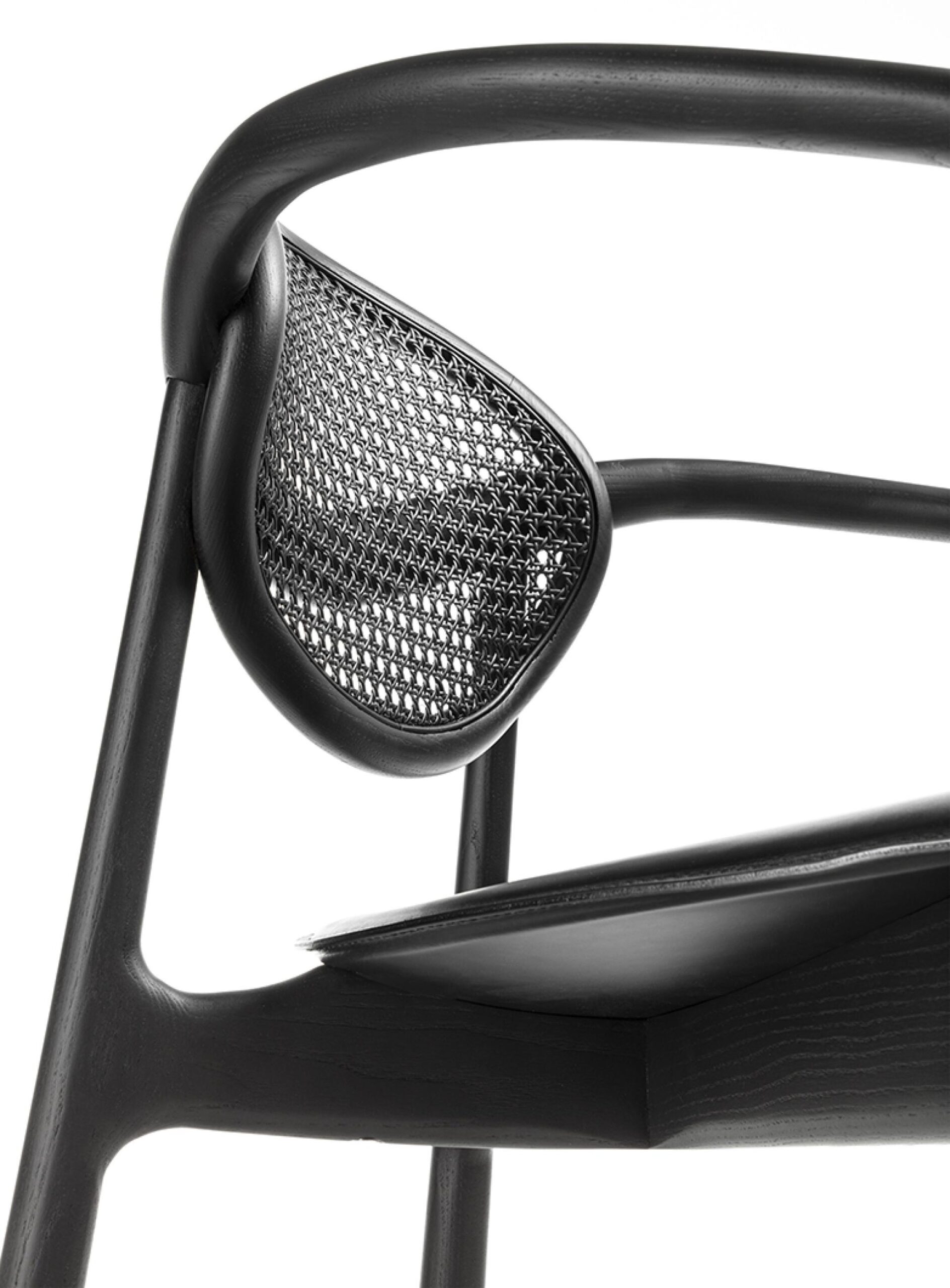 Armchair with solid wood frame with irregular section available in ash or canaletto walnut. Vienna straw backrest available natural or black. Seat upholstered in different materials available.