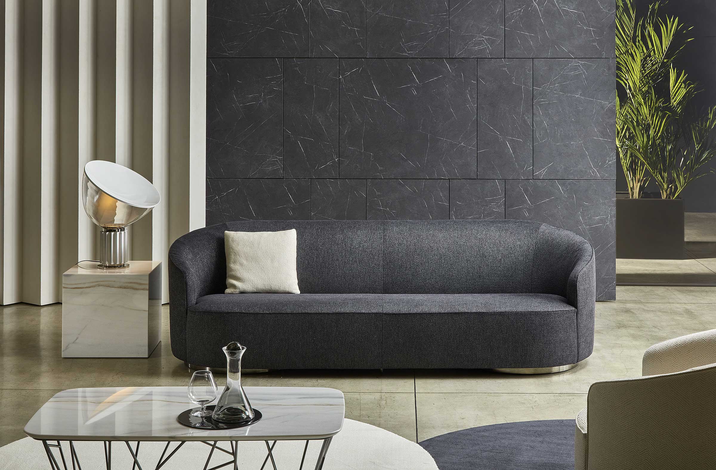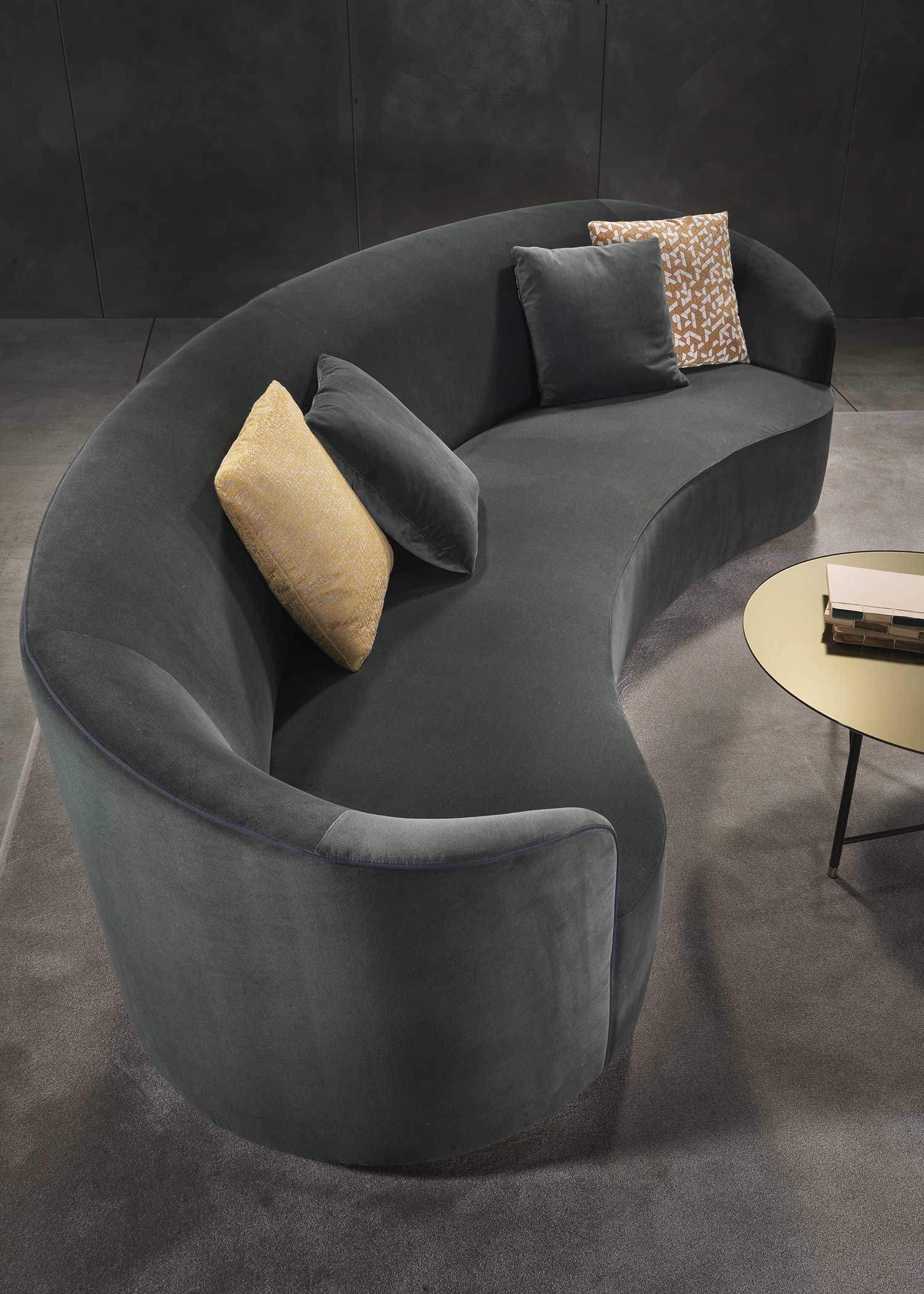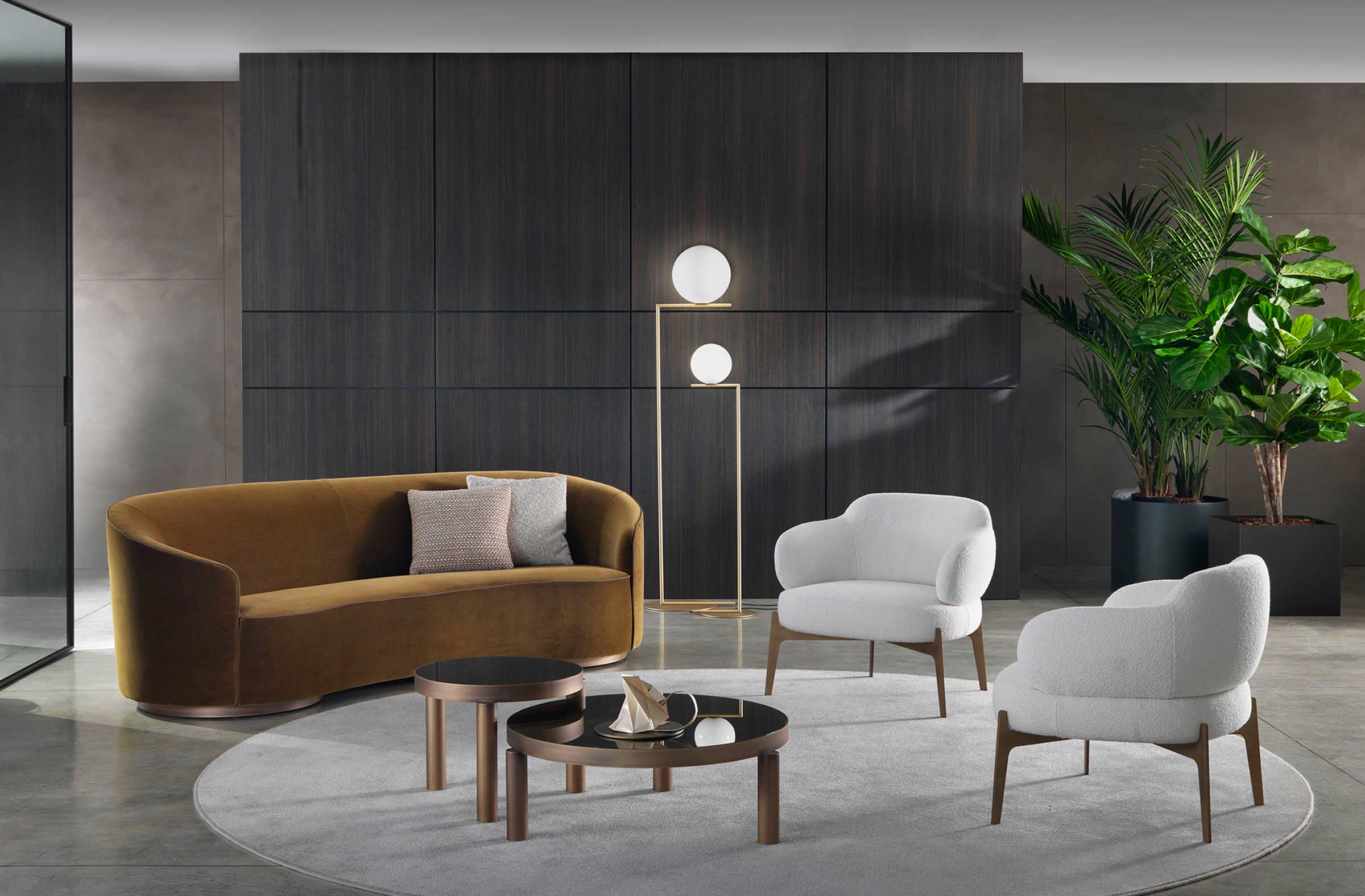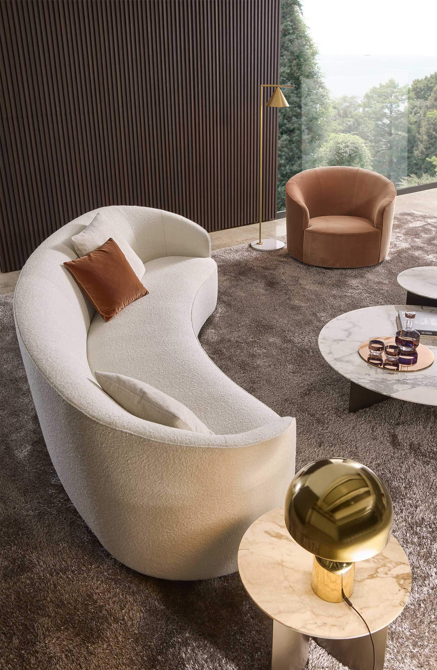 The sofas, armchairs and ottomans in the Moon collection are characterised by curved, elegant lines, with soft, rounded volumes in the upholstered parts and a light metal base on which they rest. This combination offers a design that is distinguished by its lightness, while at the same time presenting solid and compact volumes.