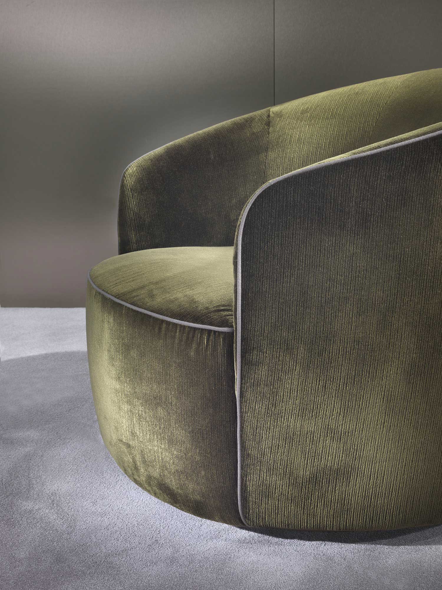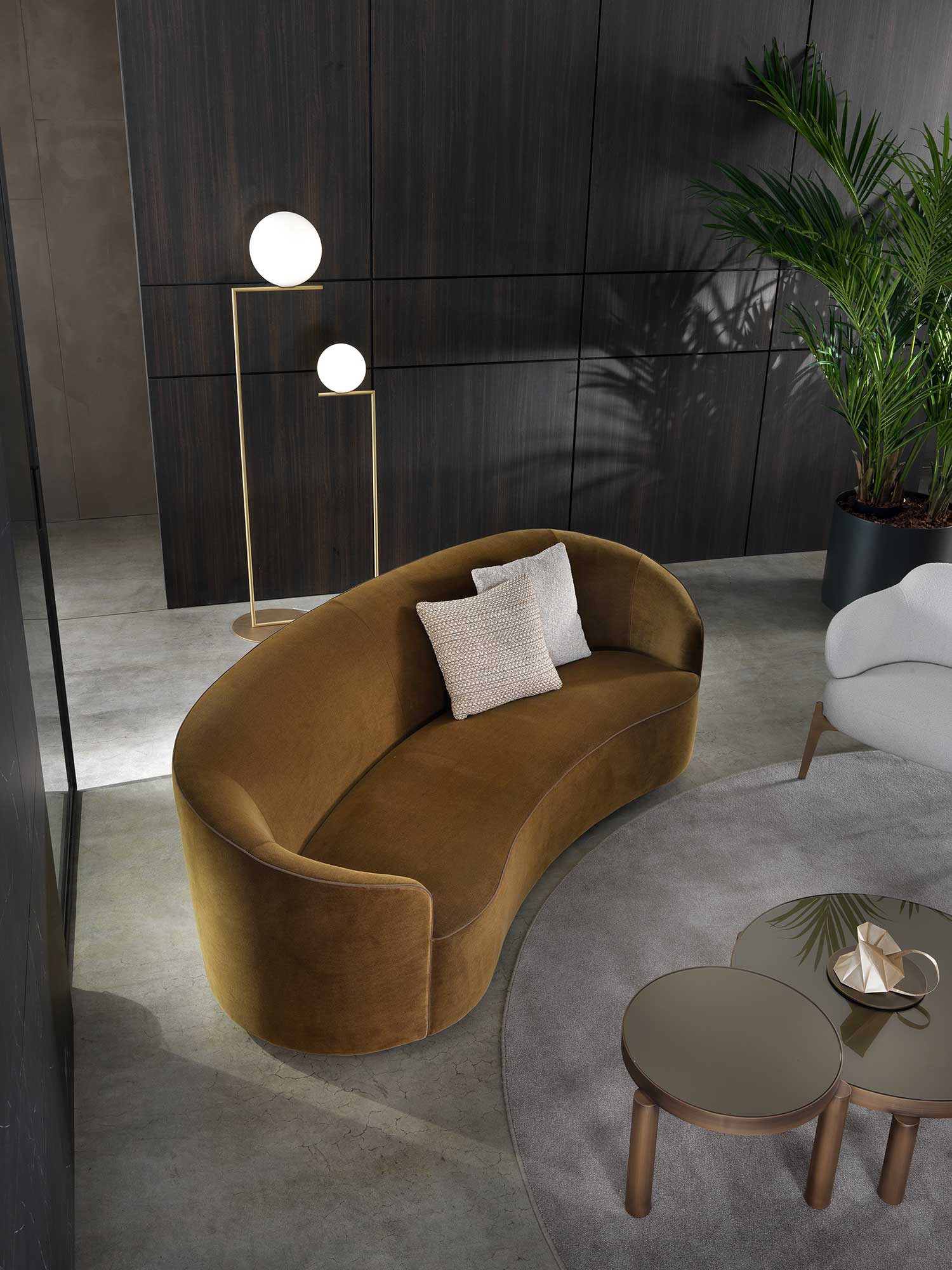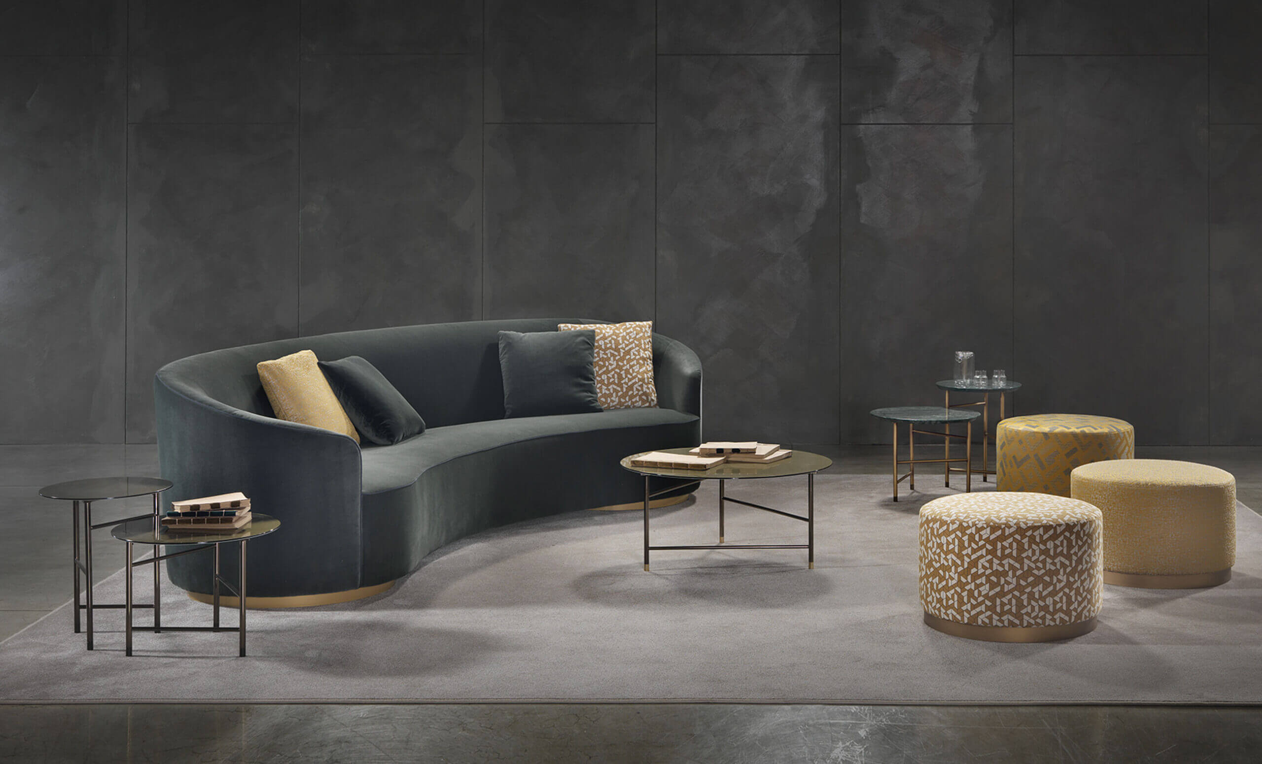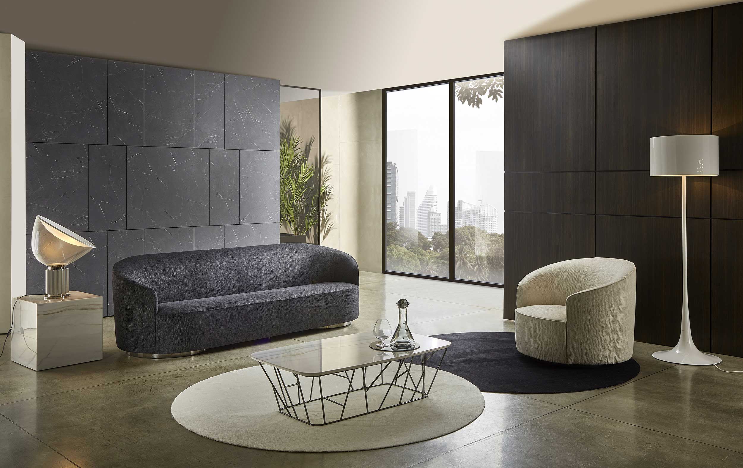 The sofas, armchairs and ottomans in the Moon collection are characterised by curved, elegant lines, with soft, rounded volumes in the upholstered parts and a light metal base on which they rest. This combination offers a design that is distinguished by its lightness, while at the same time presenting solid and compact volumes.