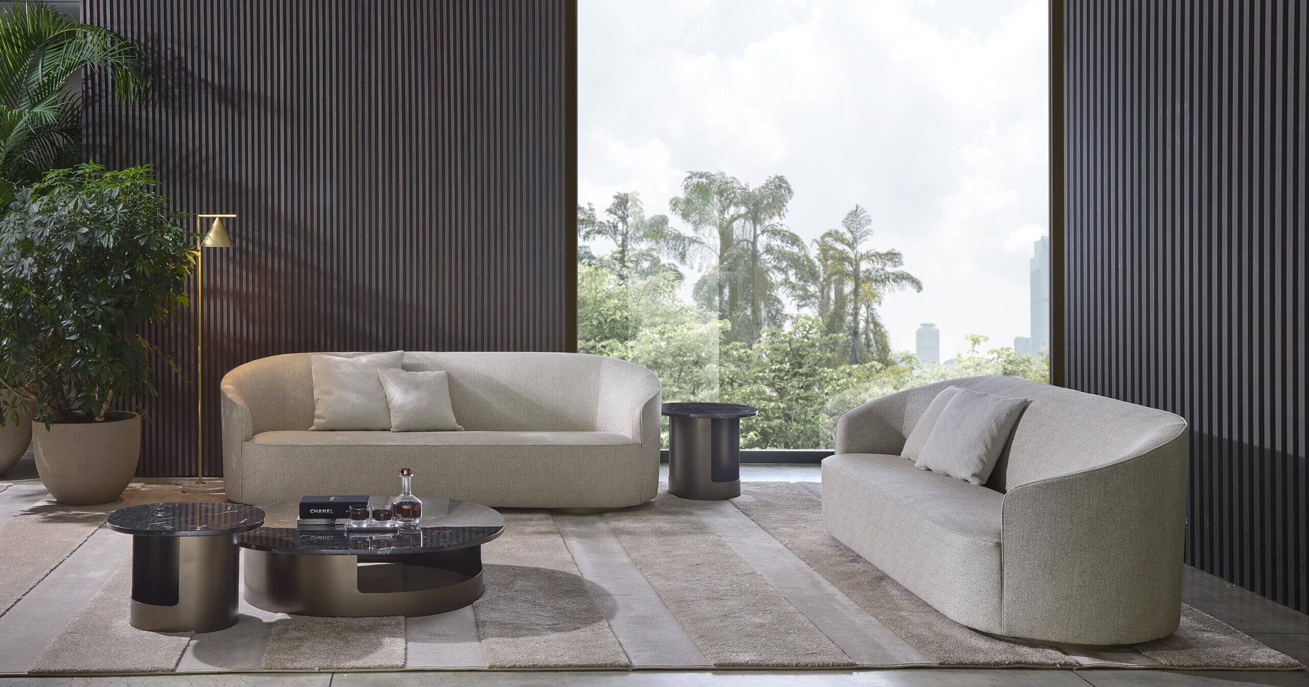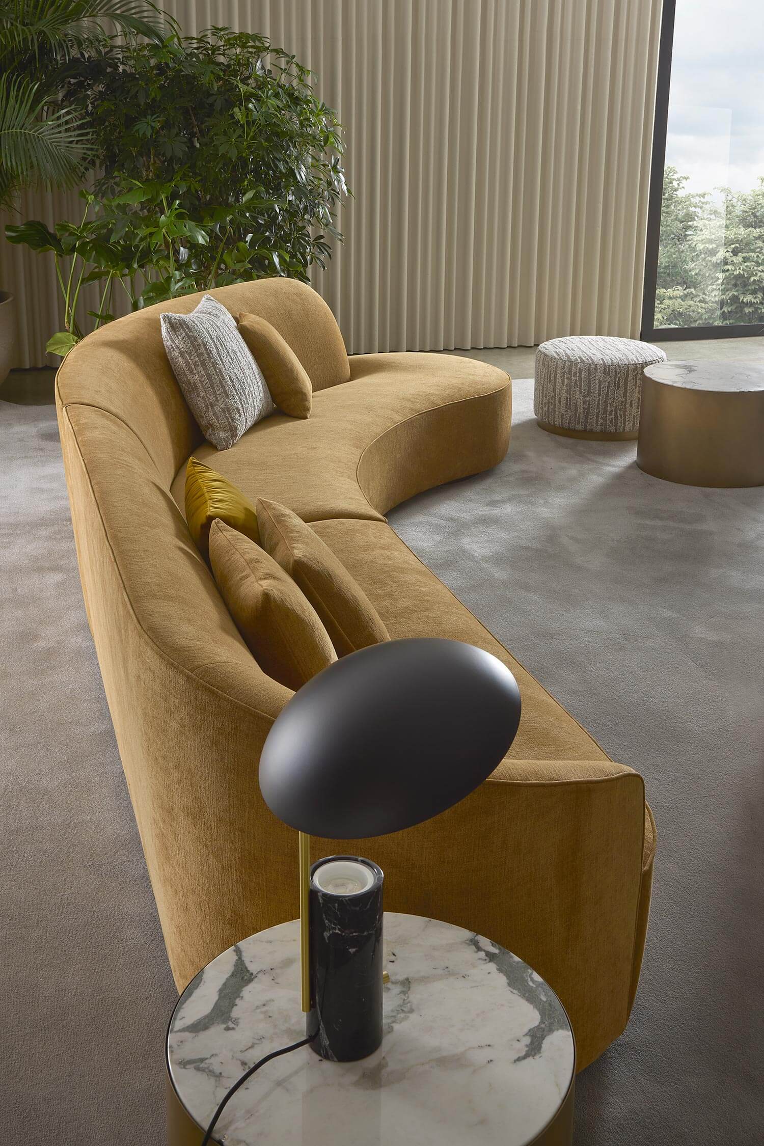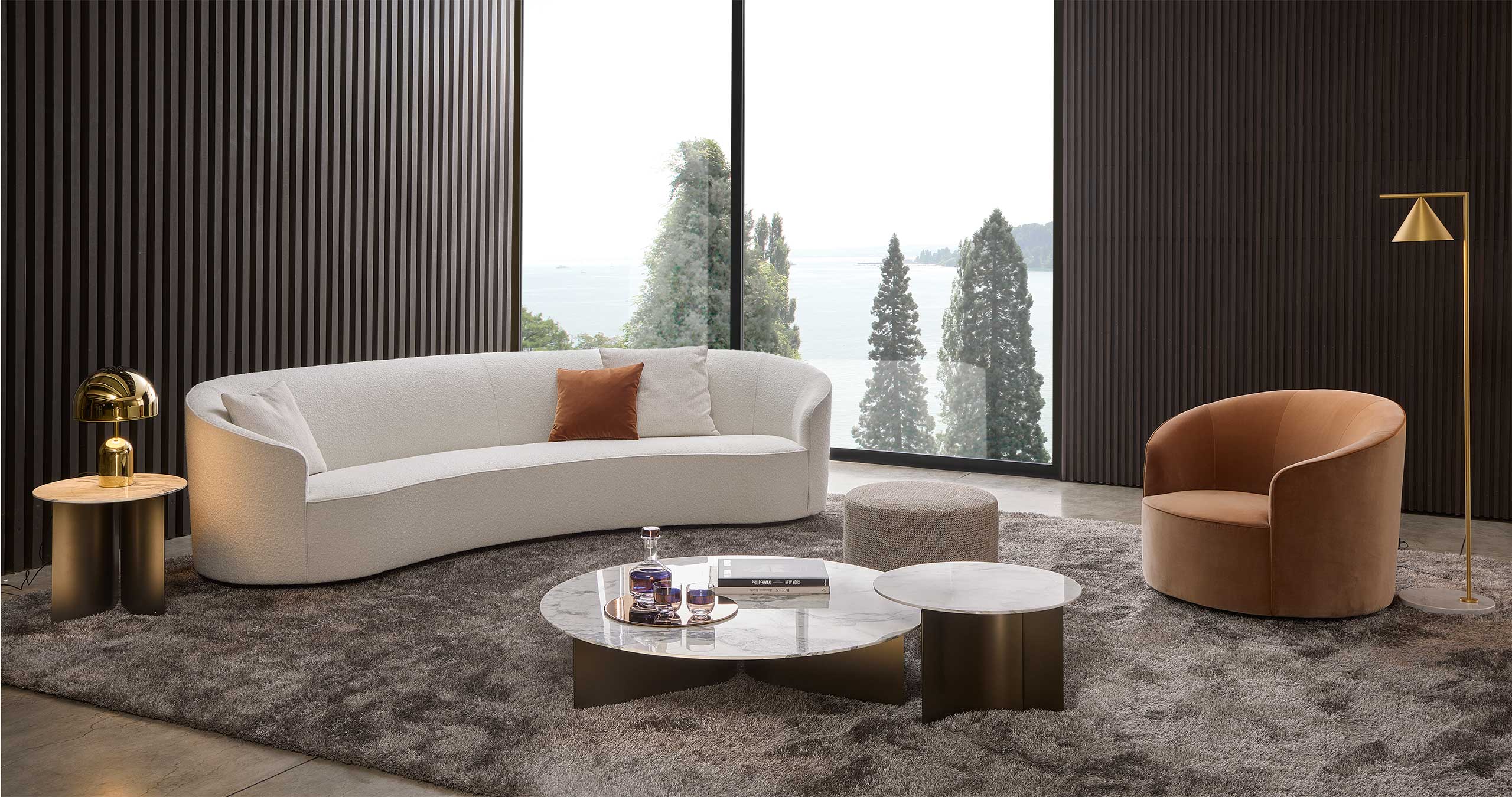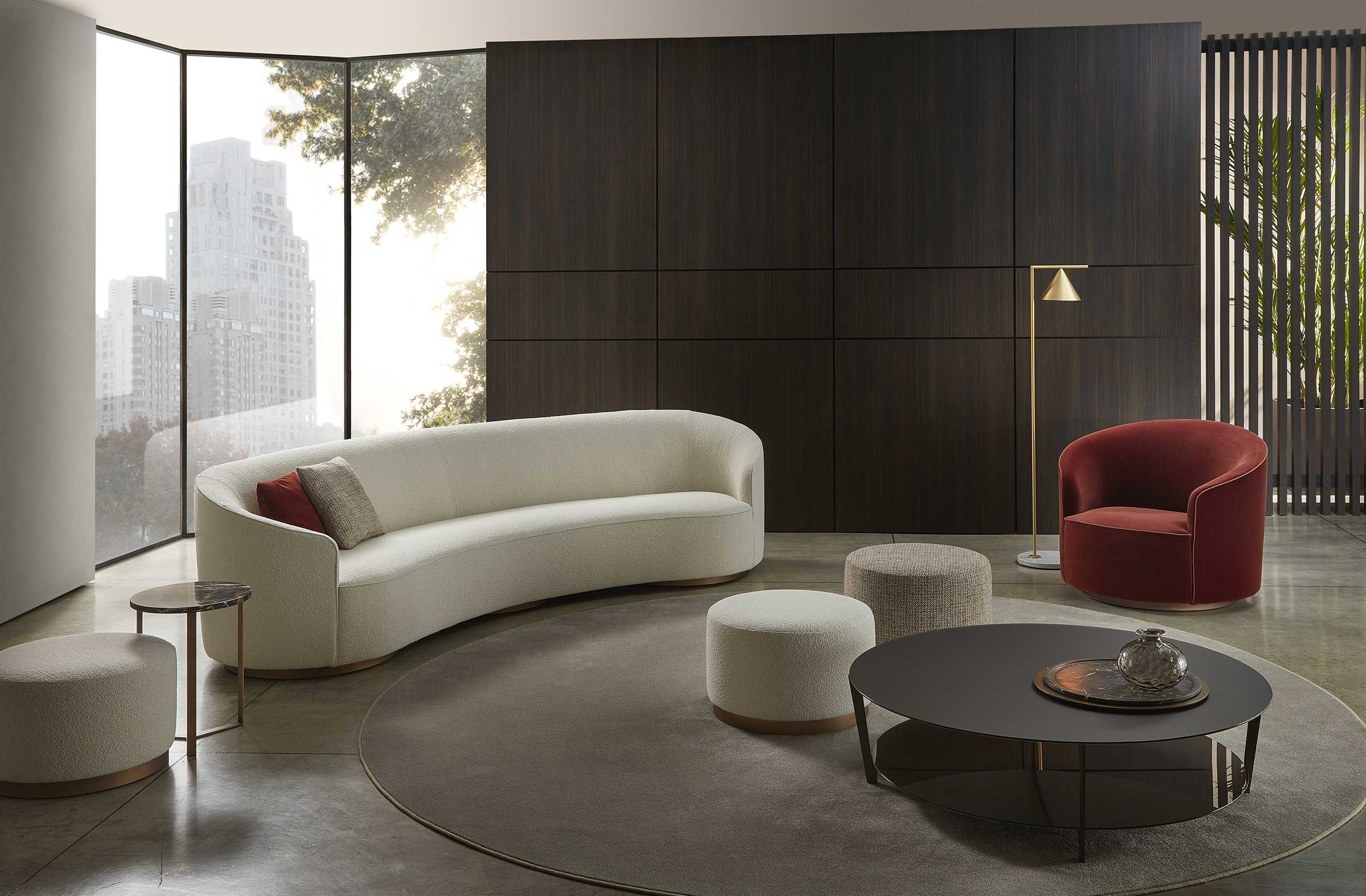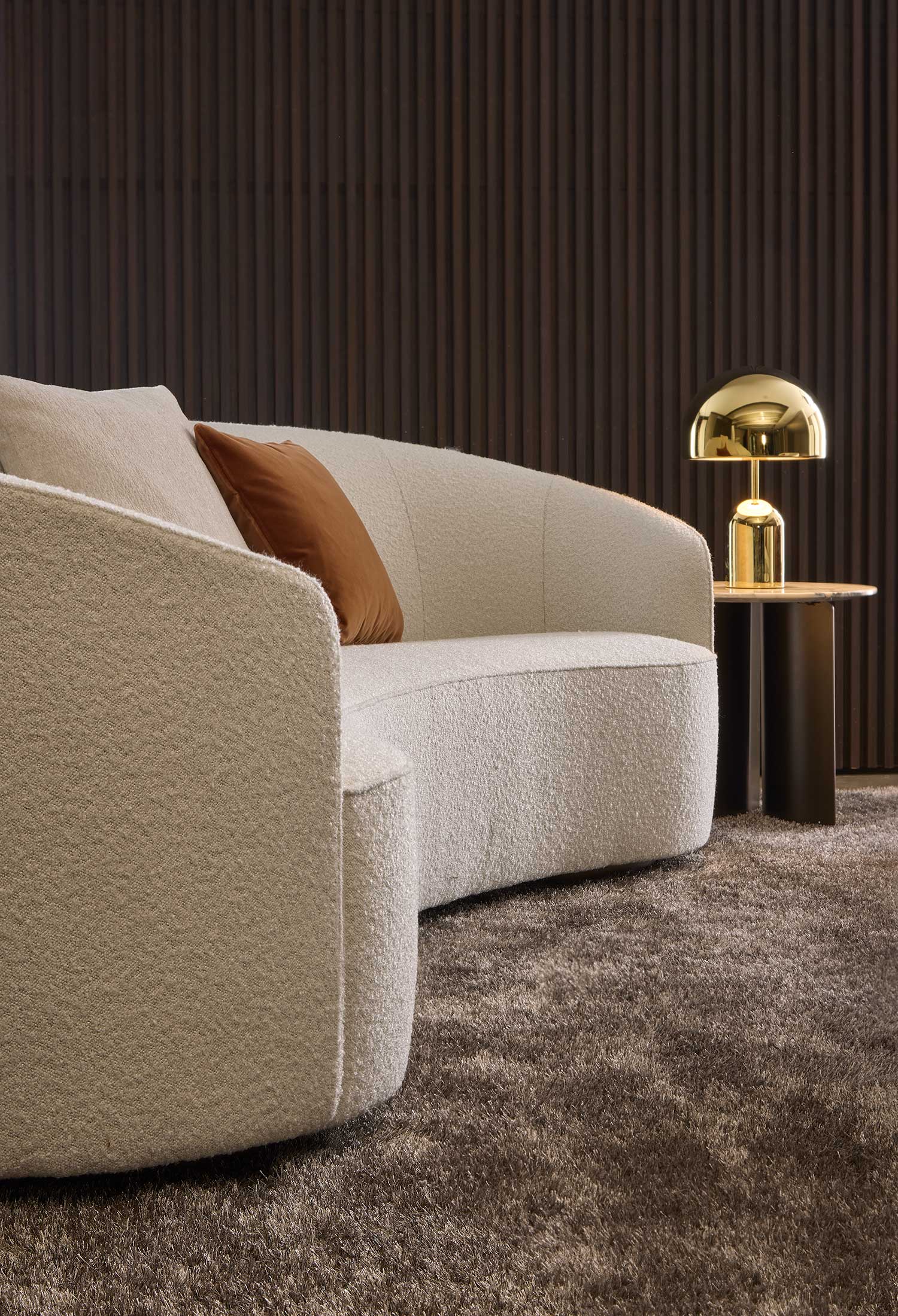 The sofas, armchairs and ottomans in the Moon collection are characterised by curved, elegant lines, with soft, rounded volumes in the upholstered parts and a light metal base on which they rest. This combination offers a design that is distinguished by its lightness, while at the same time presenting solid and compact volumes.