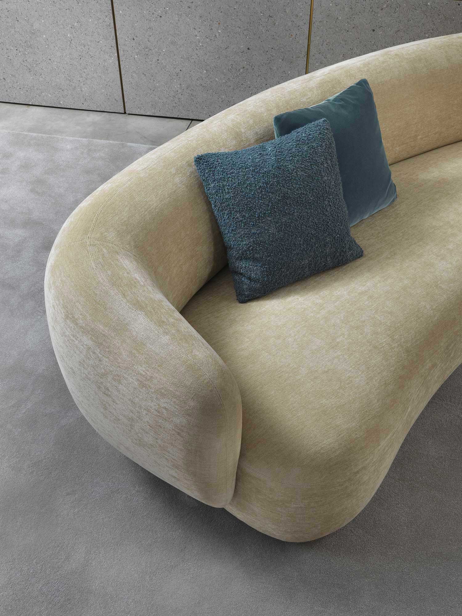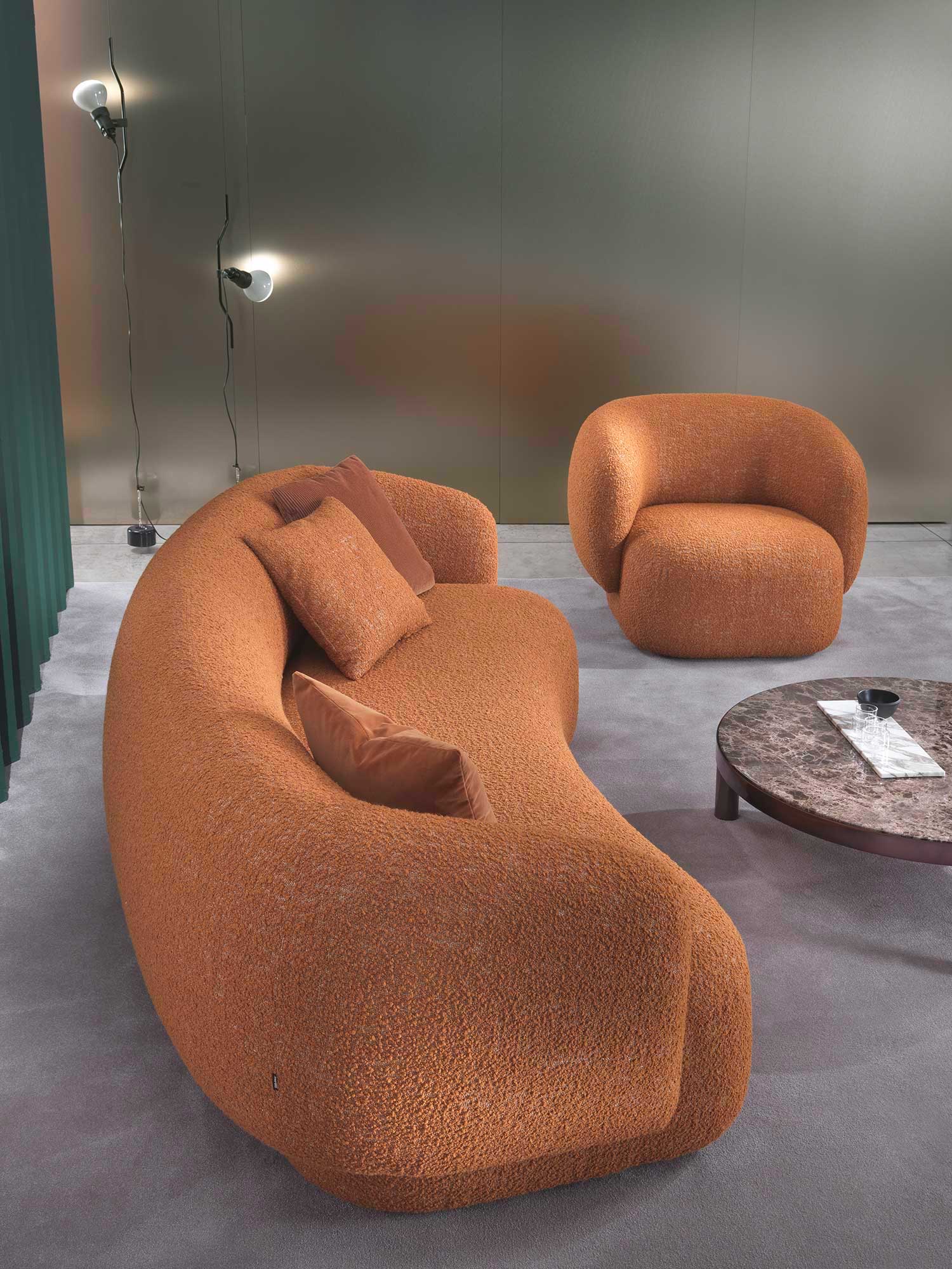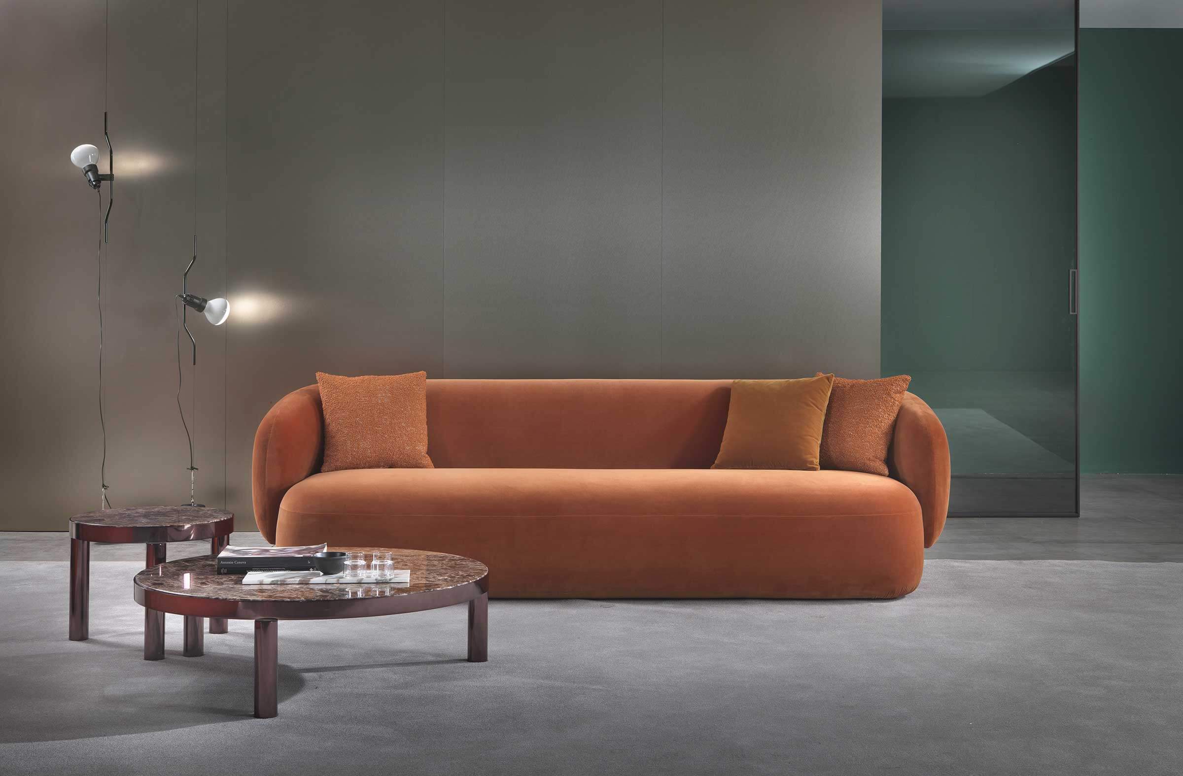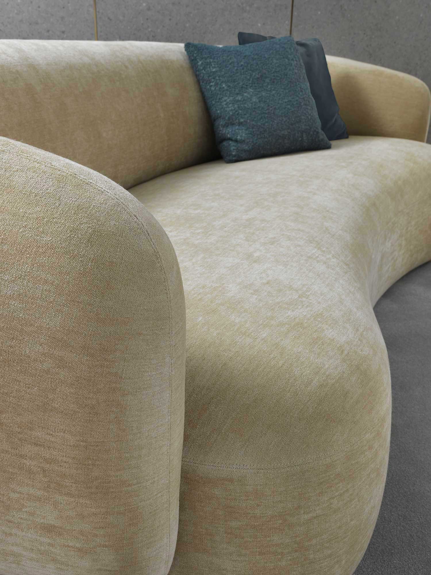 Noah sofas and armchairs are characterised by a sinuous, enveloping design with soft lines inspired by the charm of the 1970s. This style gives them a cosy and homely feel, perfect for creating a warm and comfortable ambience. The range of available sizes includes both curved and straight sofas, allowing them to adapt to different spaces and layouts.