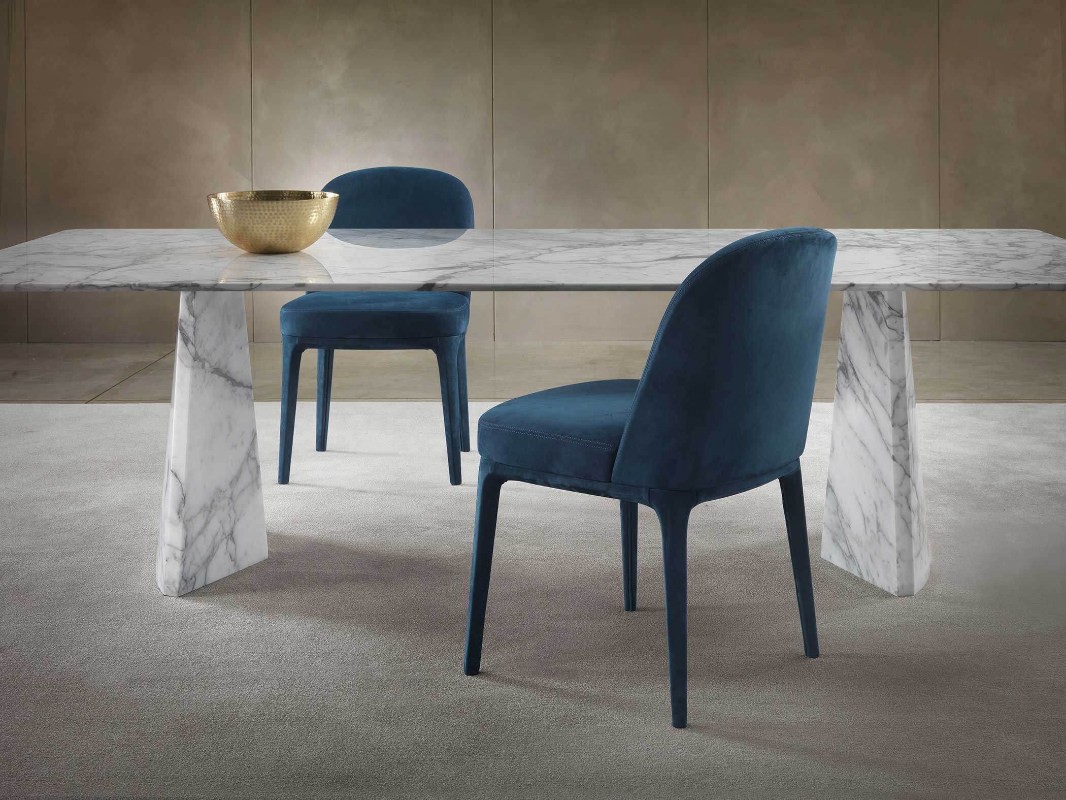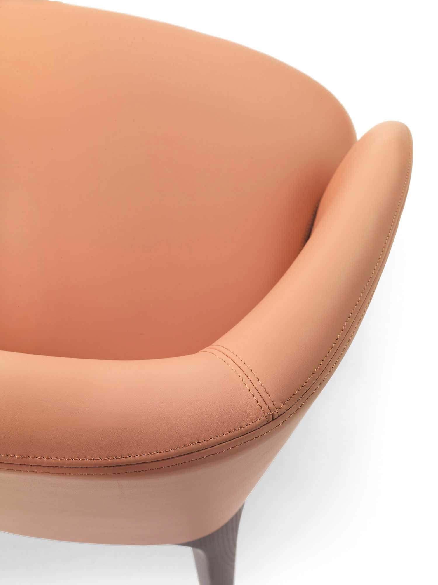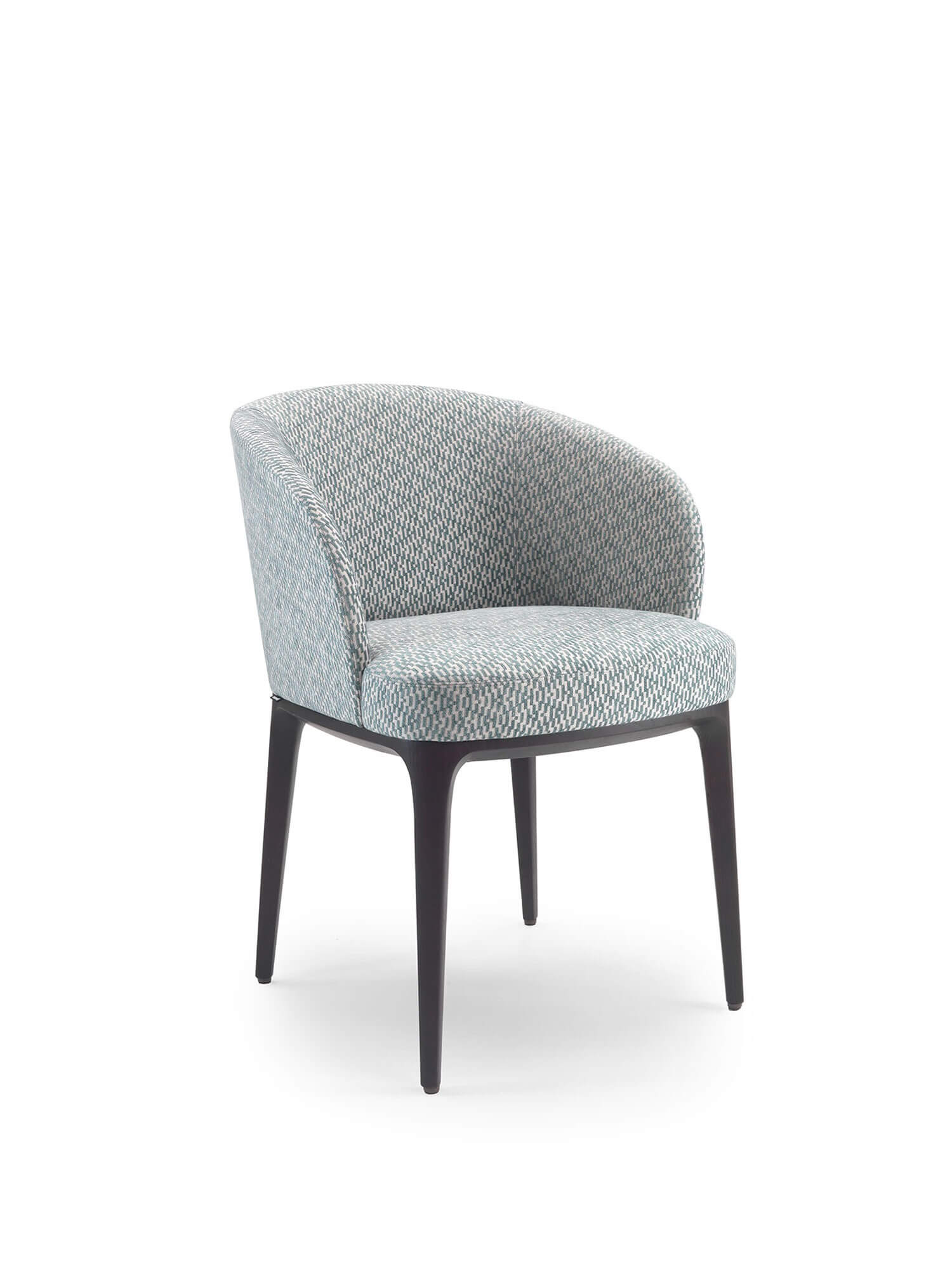 The base of the seats is made of wood; if desired, it can be upholstered with the same material chosen for the upholstered part. A further customisation option is the two-tone/bimaterial option that allows you to combine two different materials, e.g. fabric for the inner part and leather for the outer part of the backrest.