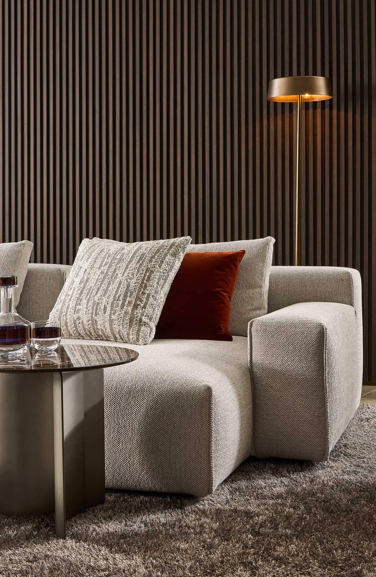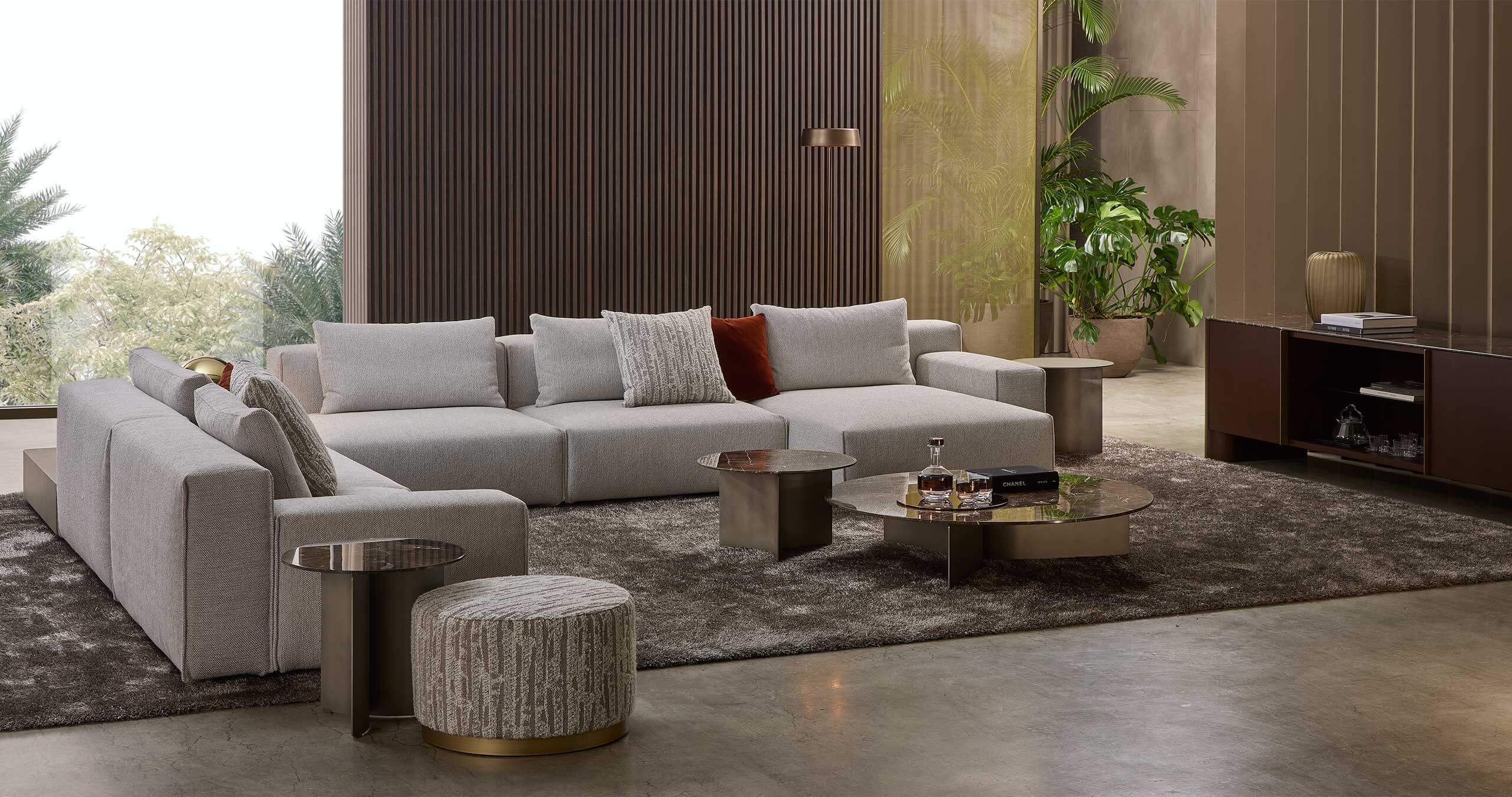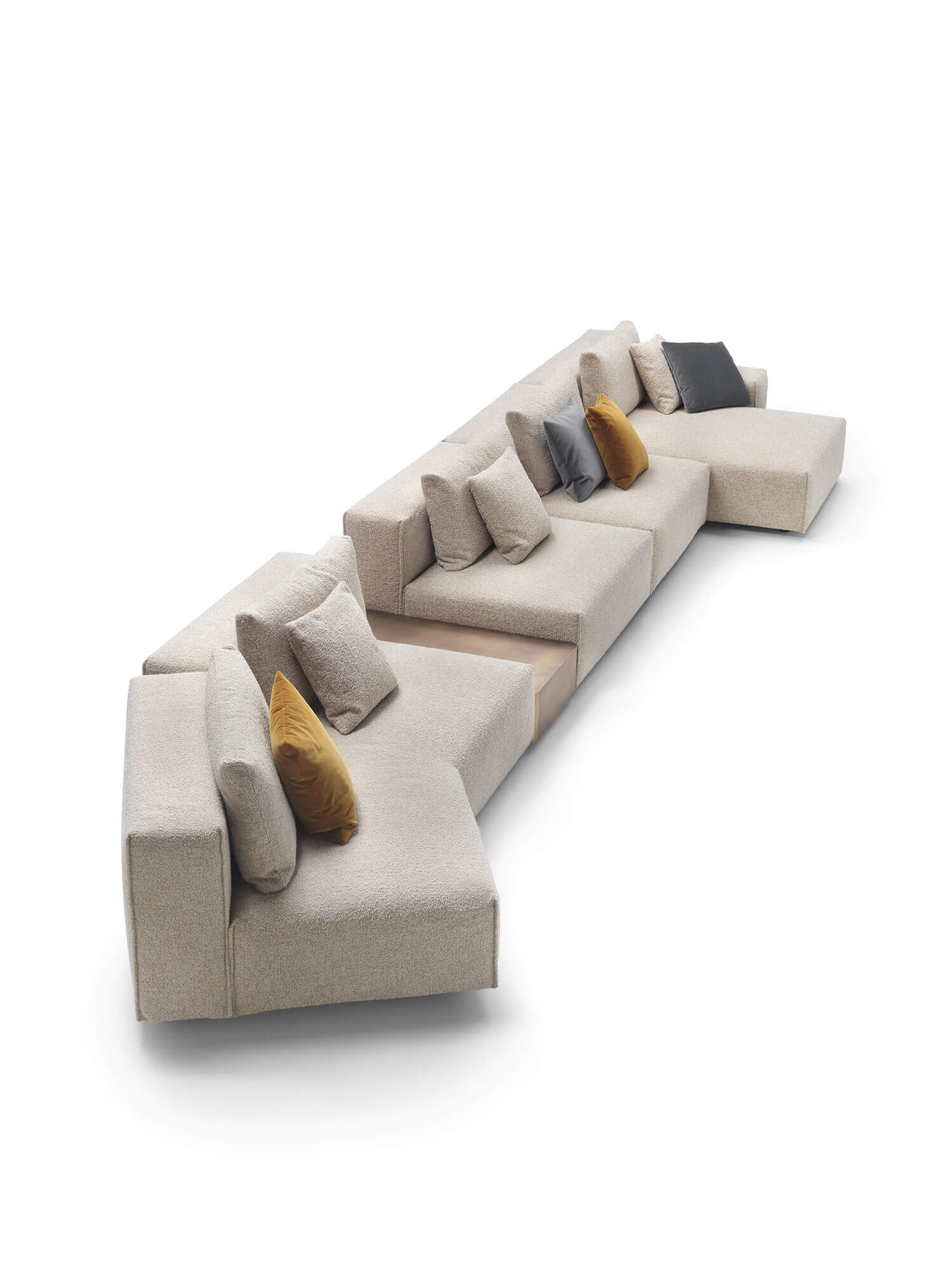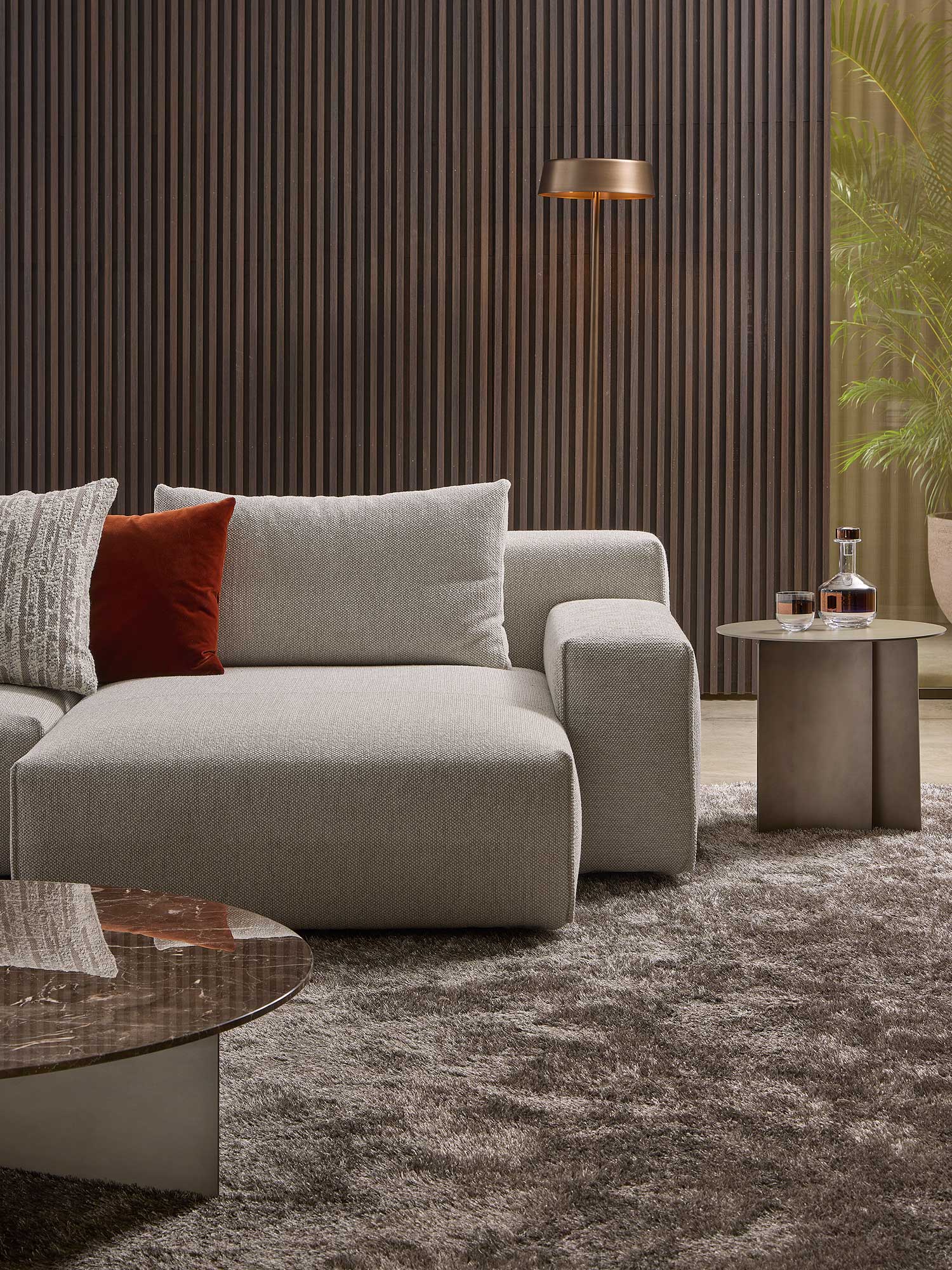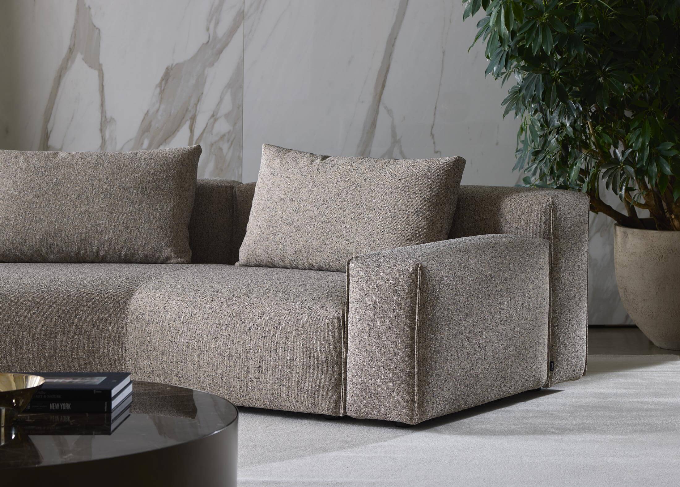 Yann stands out for its high level of comfort and meticulous attention to detail. A distinctive element is the vertical edged seam, which enhances the design with a sartorial touch. For those who want even more original solutions, it is possible to configure the sofa with non-straight corner elements, creating dynamic compositions with a strong visual impact.