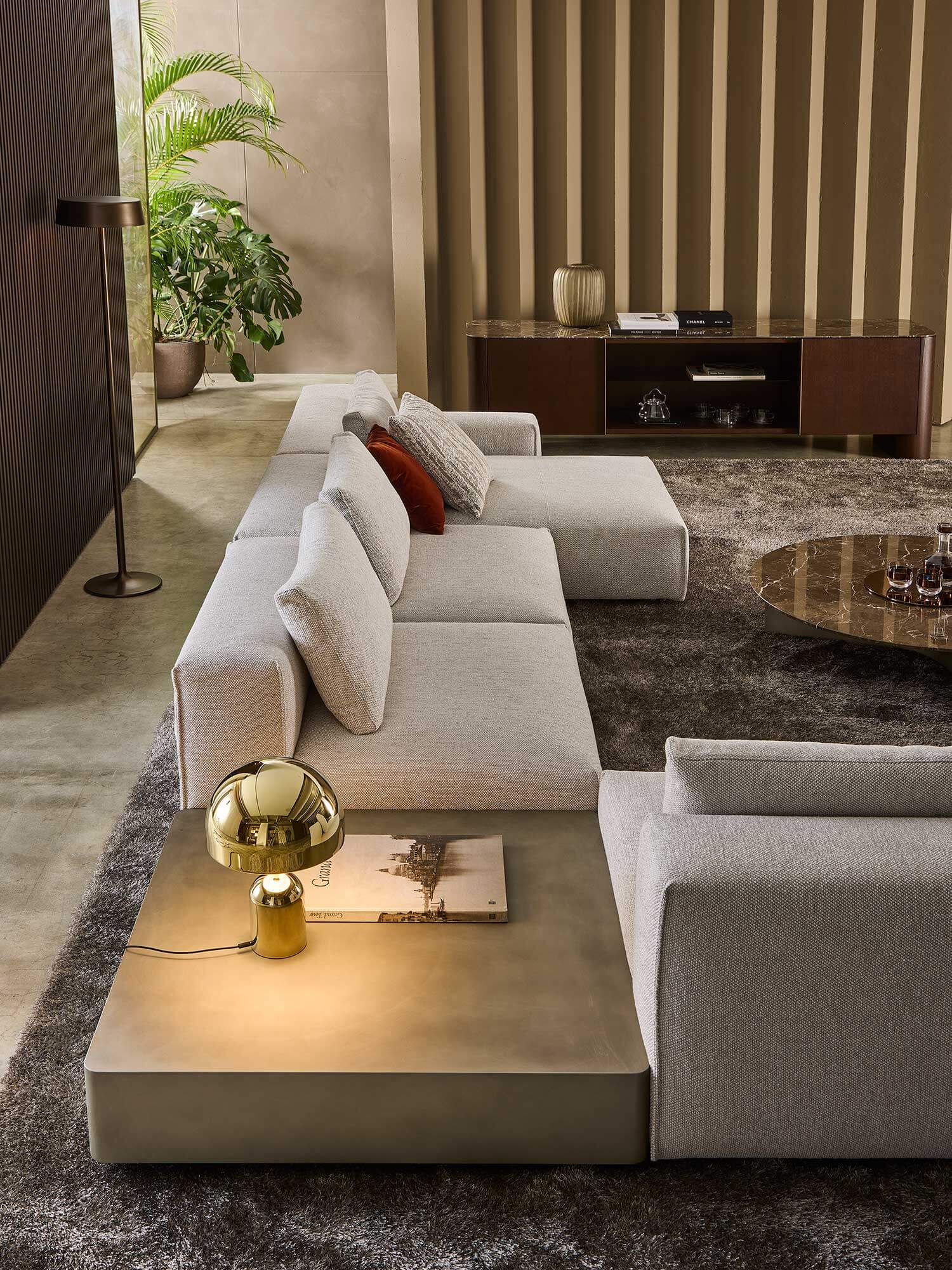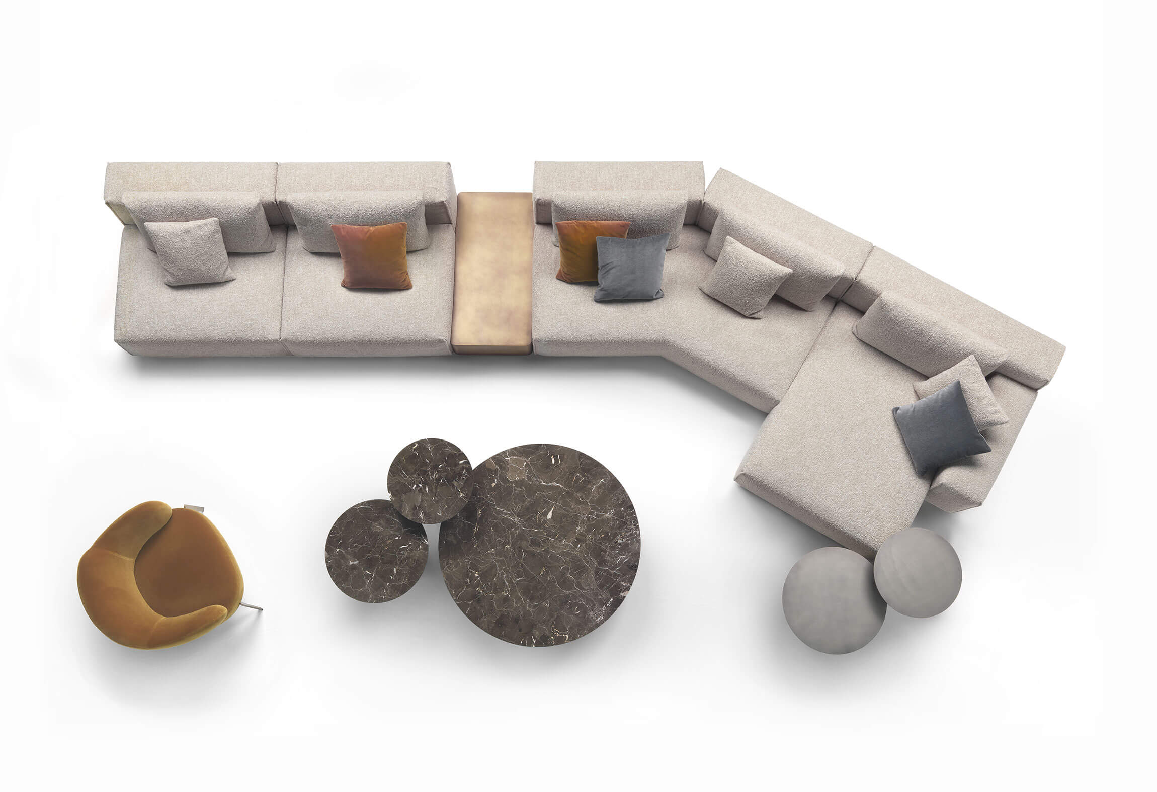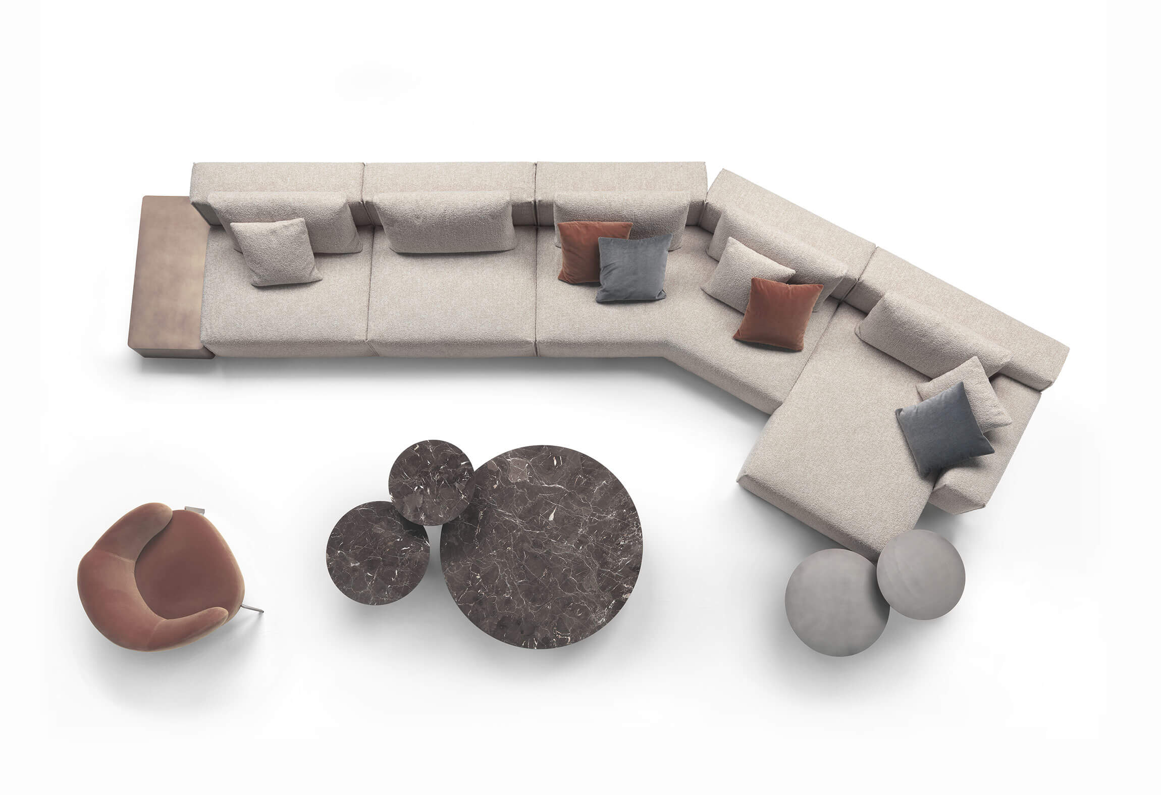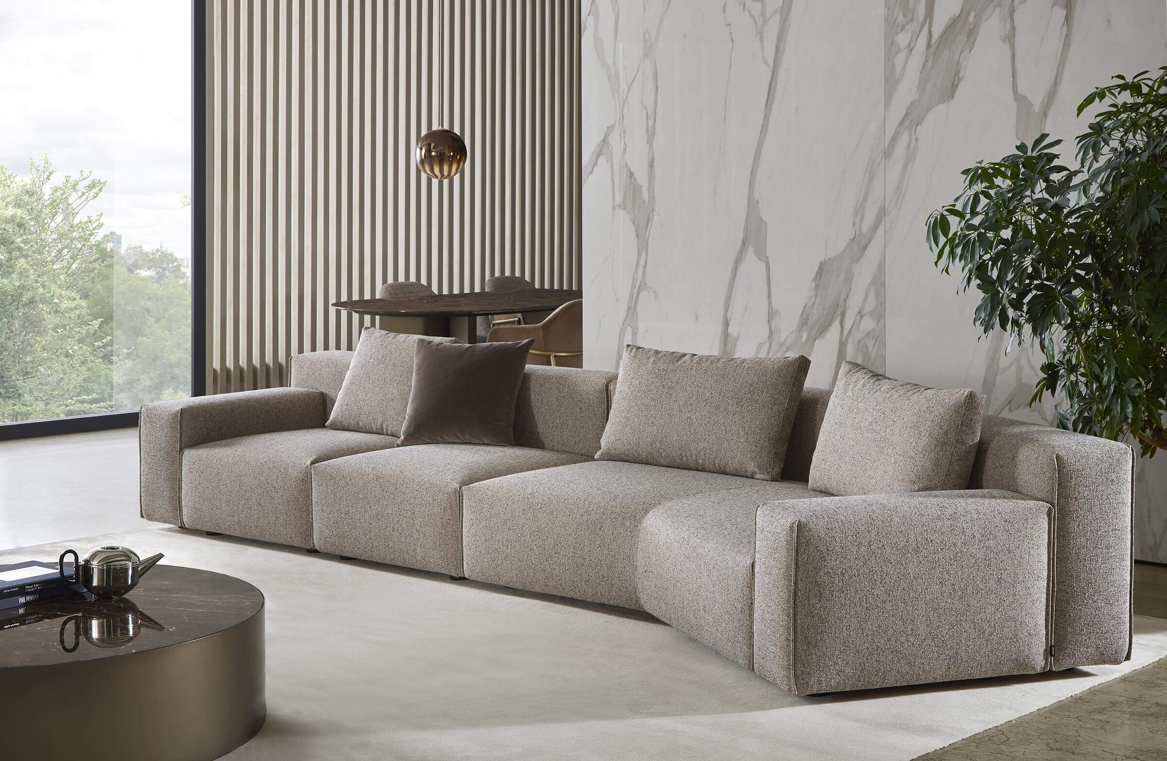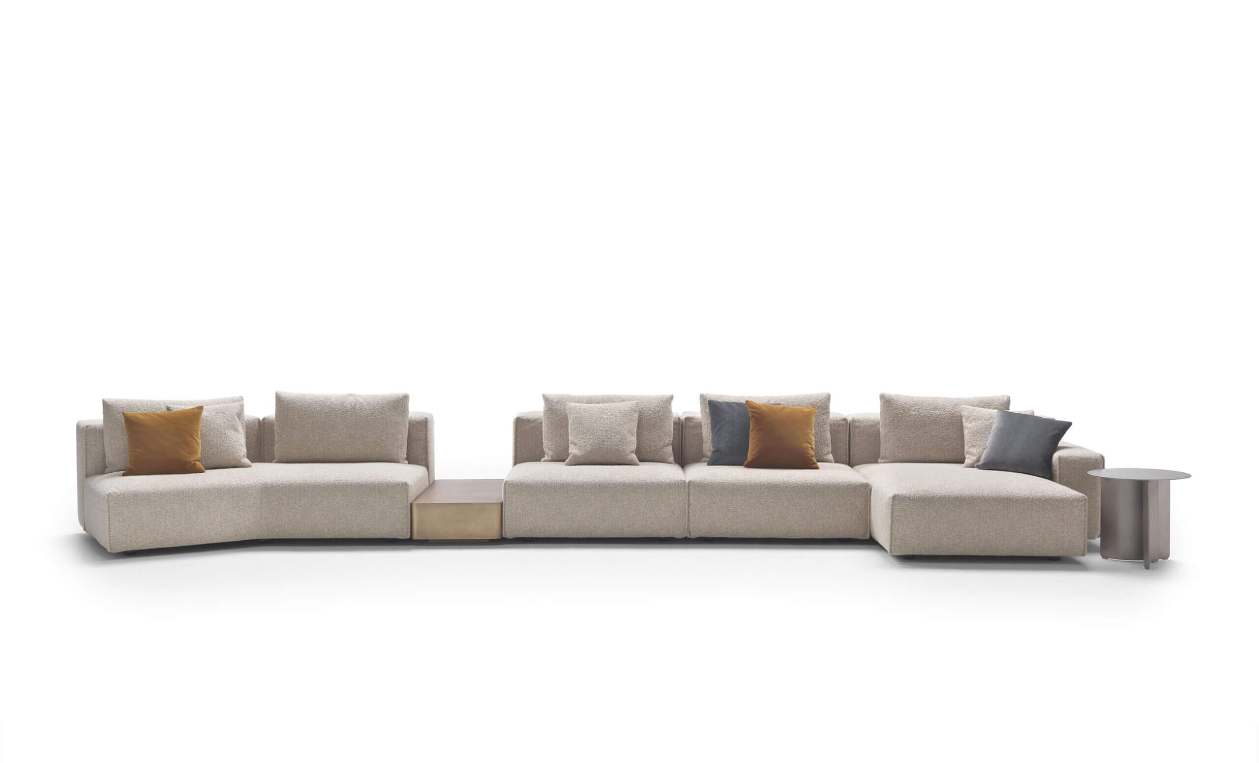 Yann stands out for its high level of comfort and meticulous attention to detail. A distinctive element is the vertical edged seam, which enhances the design with a sartorial touch. For those who want even more original solutions, it is possible to configure the sofa with non-straight corner elements, creating dynamic compositions with a strong visual impact.