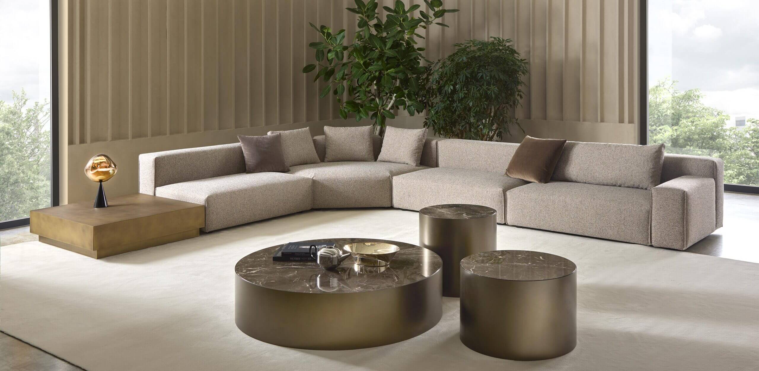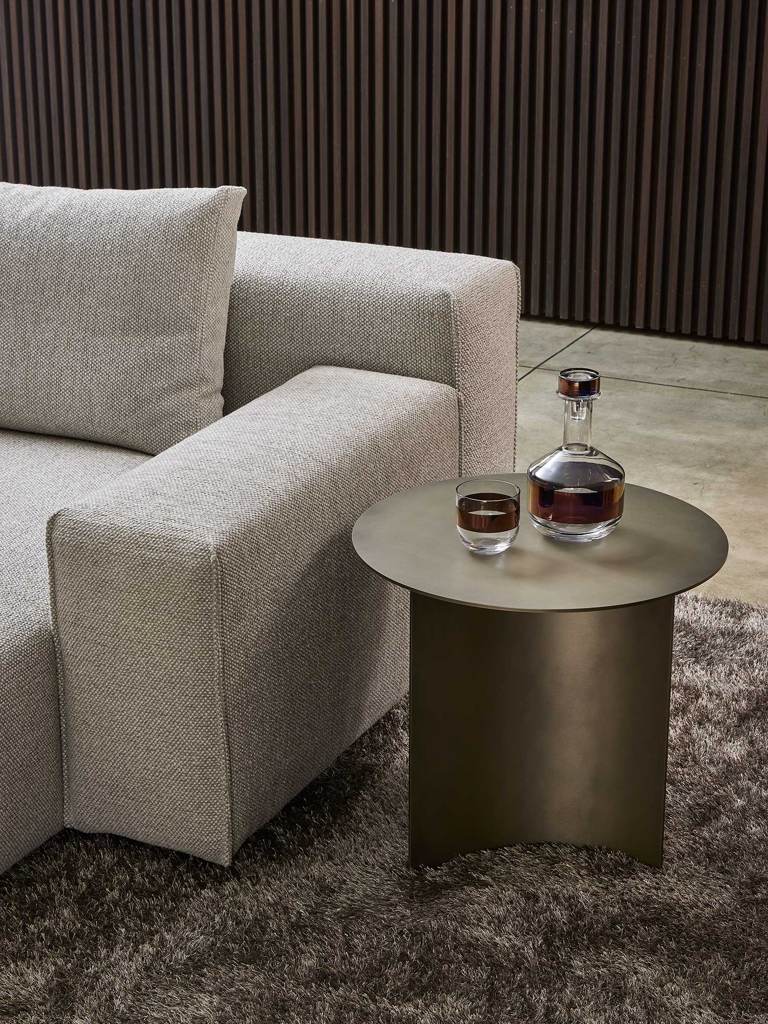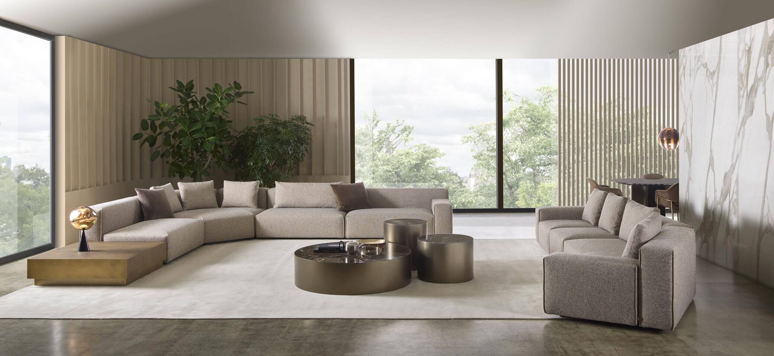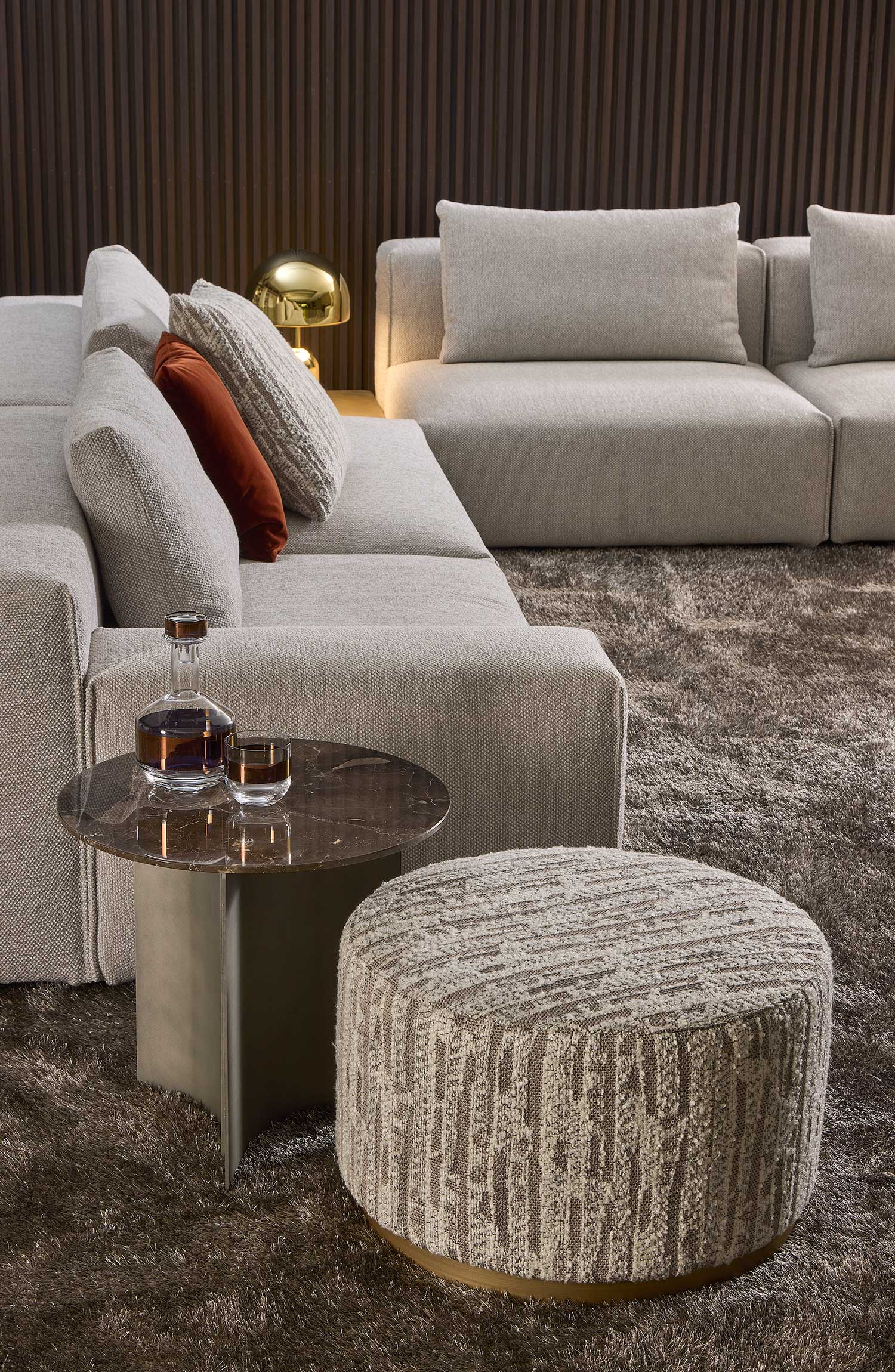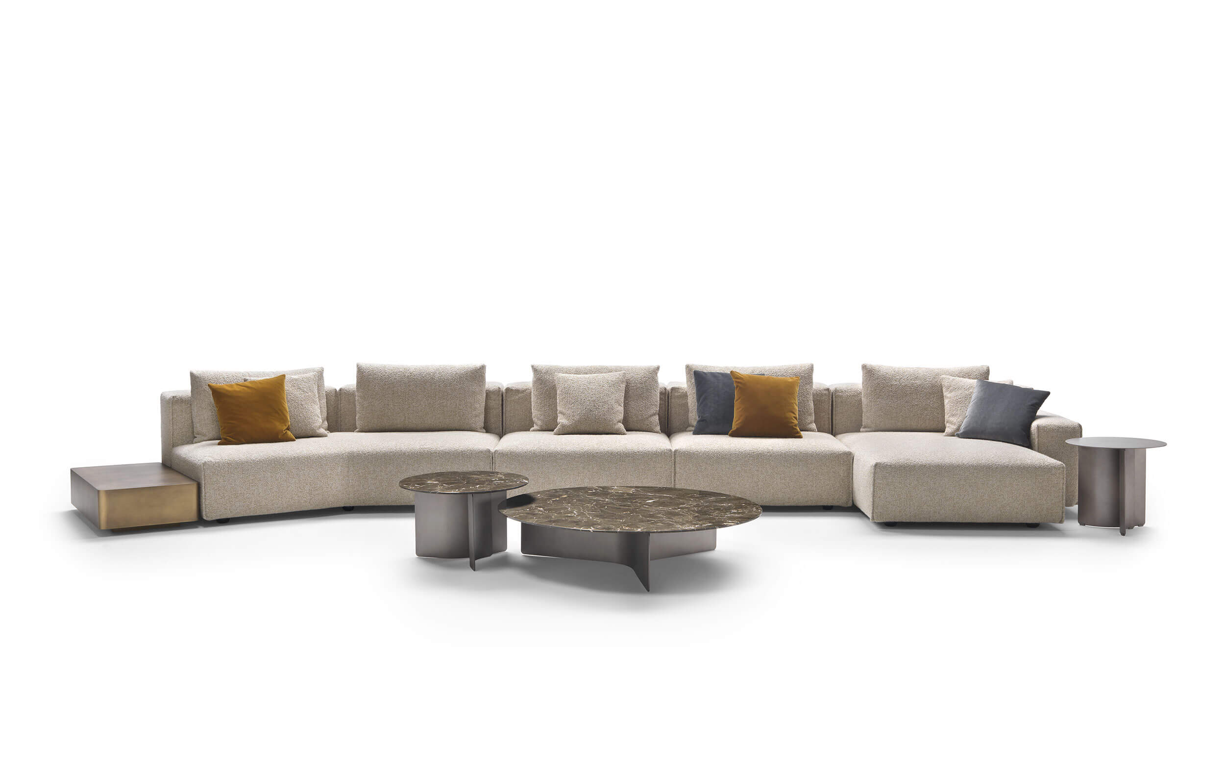 Yann stands out for its high level of comfort and meticulous attention to detail. A distinctive element is the vertical edged seam, which enhances the design with a sartorial touch. For those who want even more original solutions, it is possible to configure the sofa with non-straight corner elements, creating dynamic compositions with a strong visual impact.