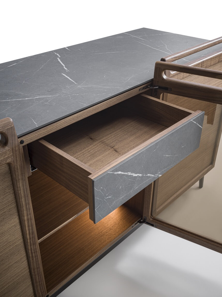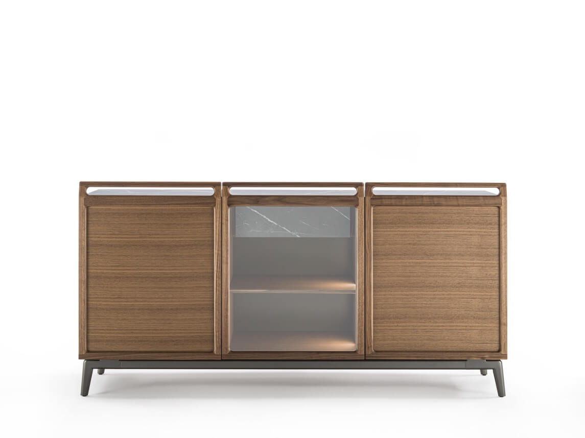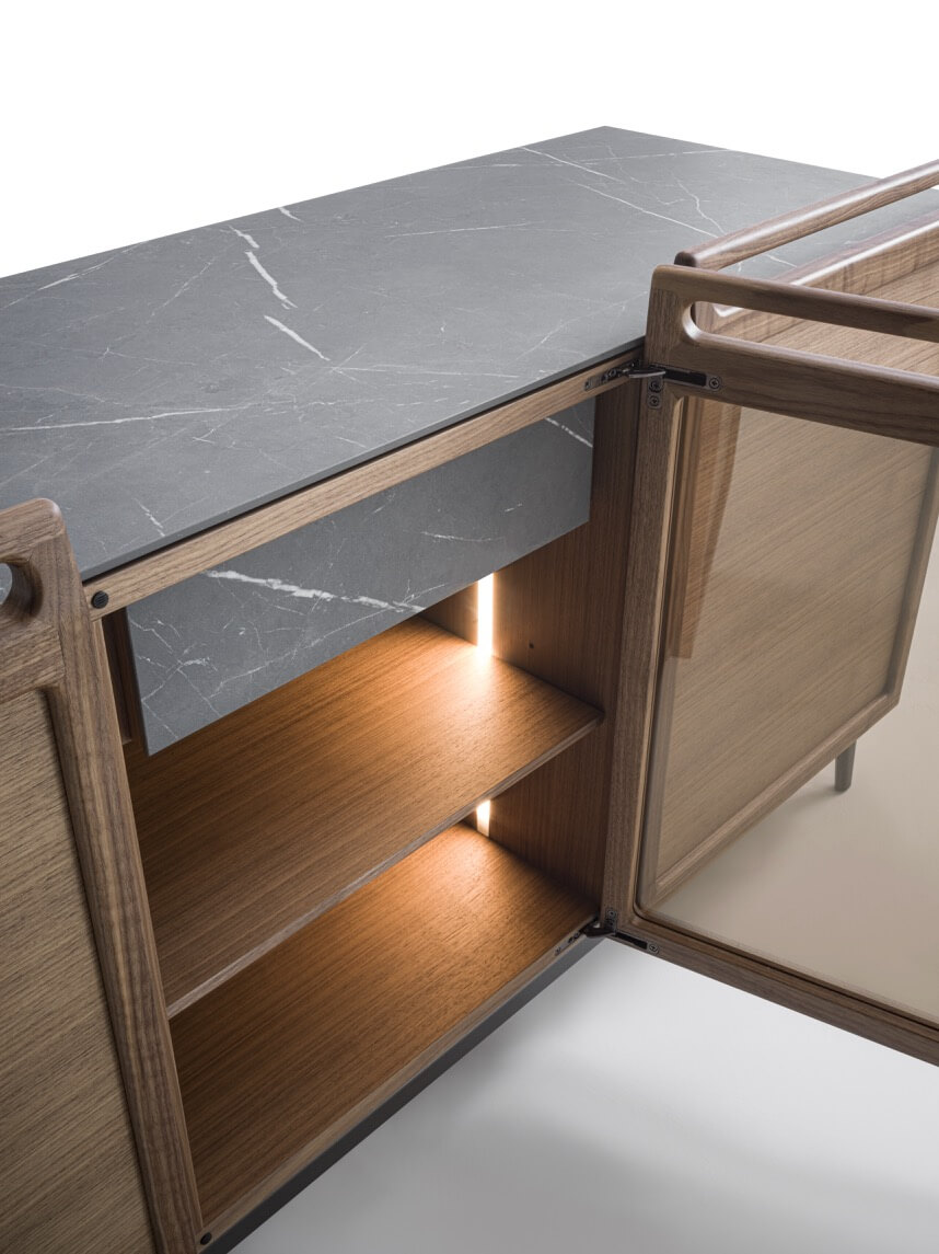 Cupboard in wood with three/four wooden and crystal doors, with solid wood handle. The top is in wood or porcelain stoneware and the base in metal. The internal division is characterized by wooden shelves, drawer (optional) with front as the top and led lighting.