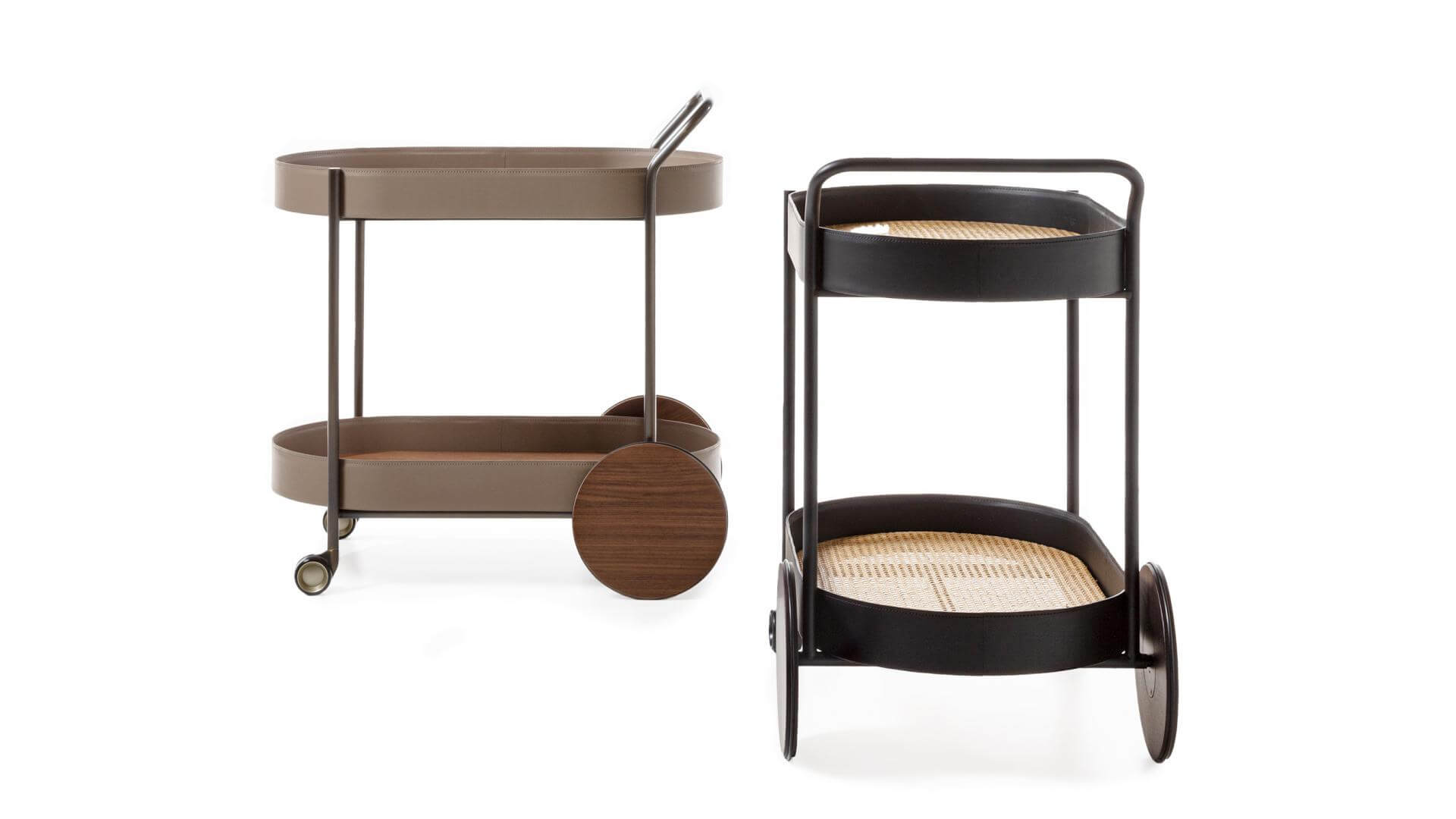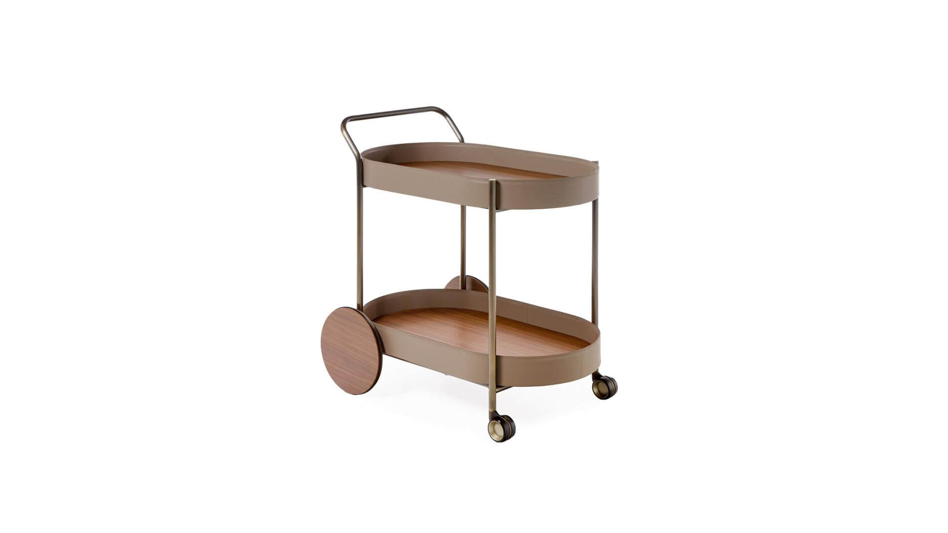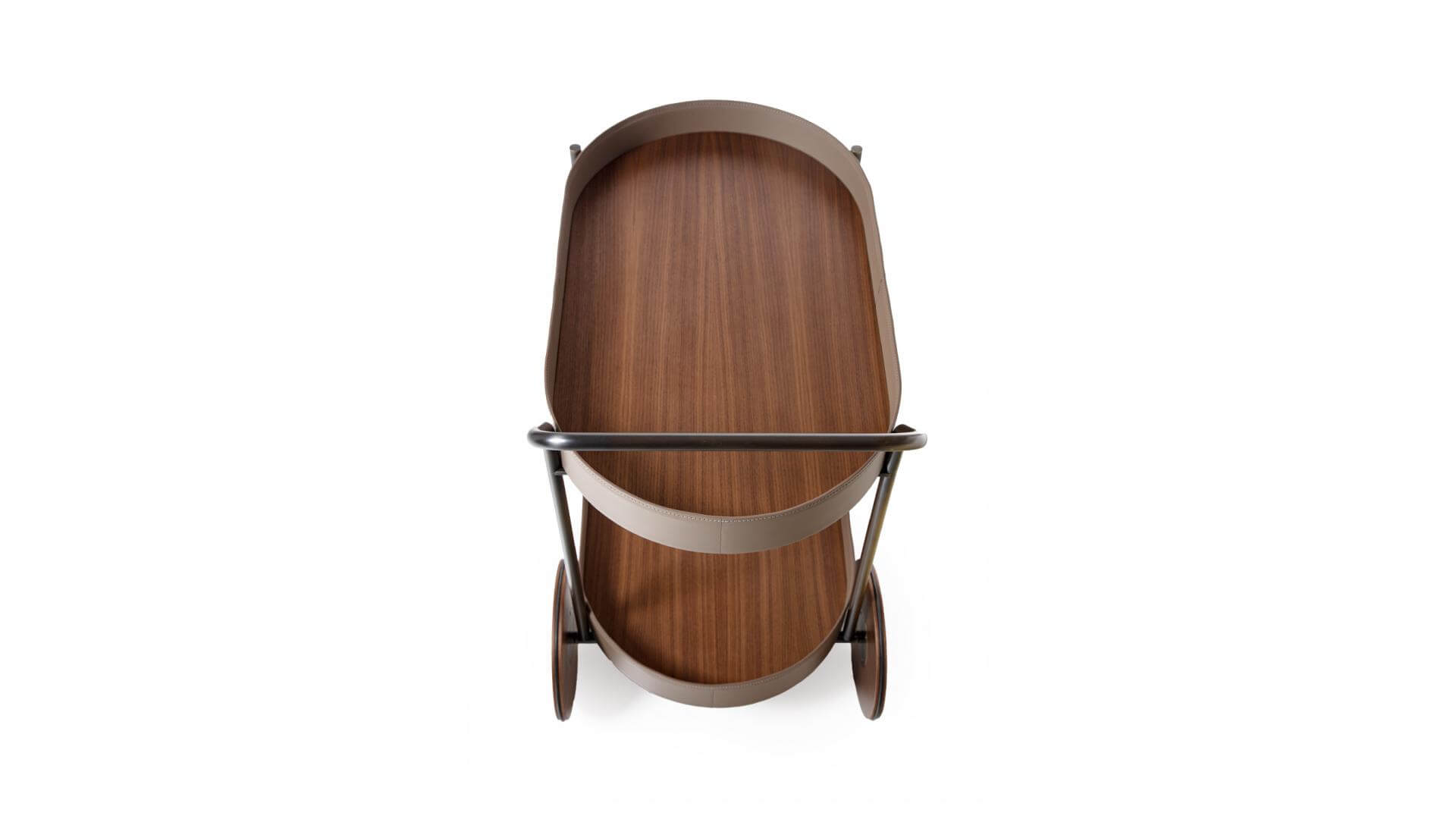 Cart with painted tubolar metal structure. Wheels and trays in wood, edge covered in leather.