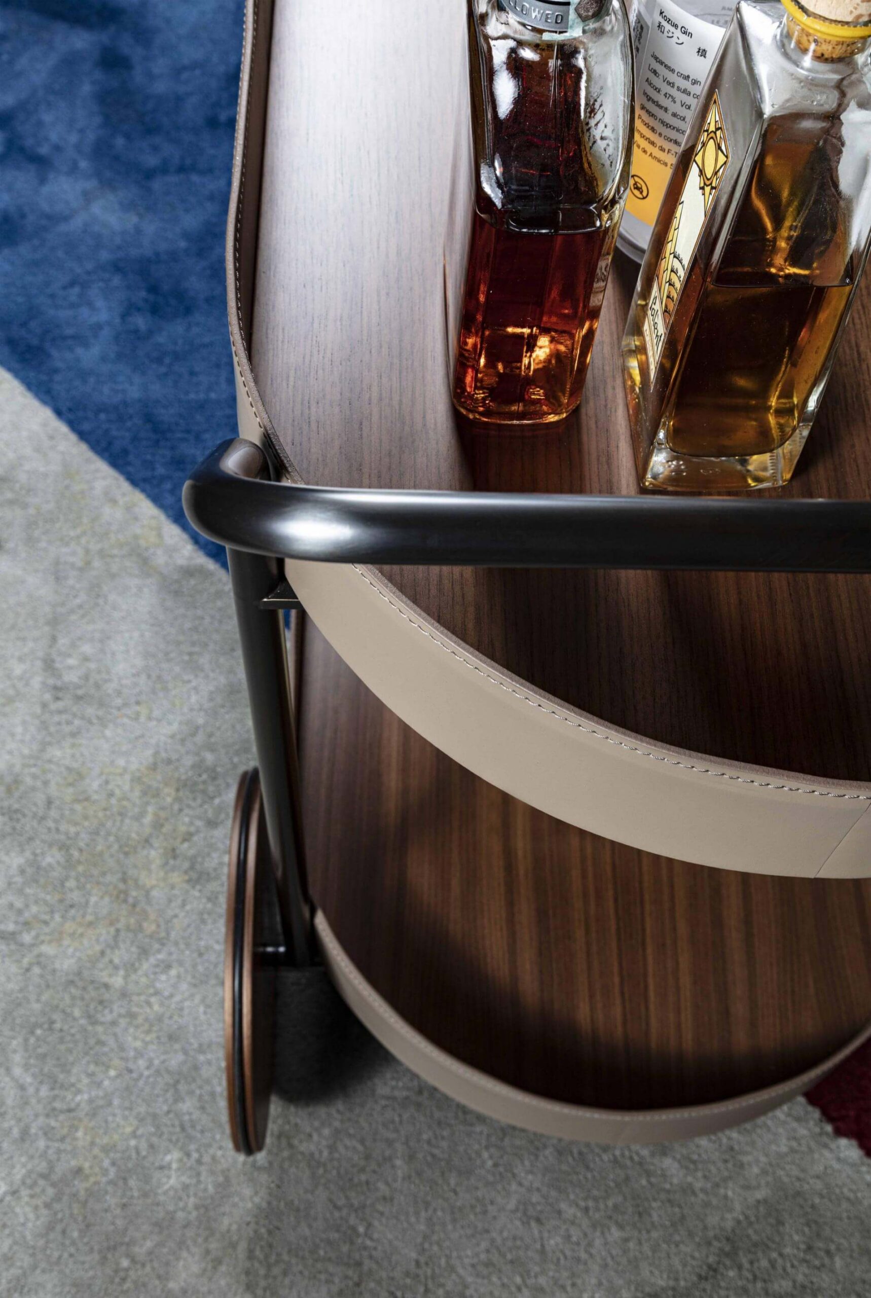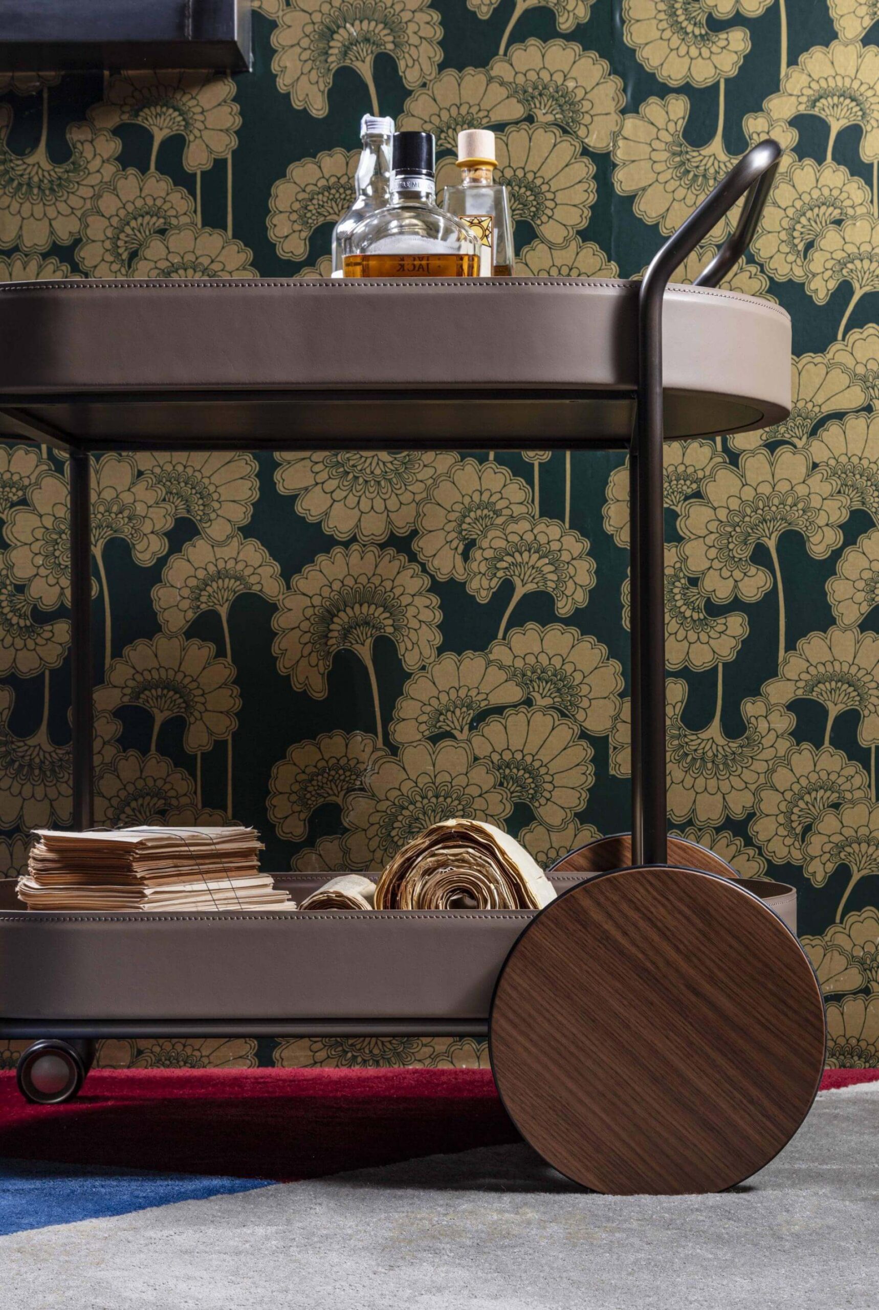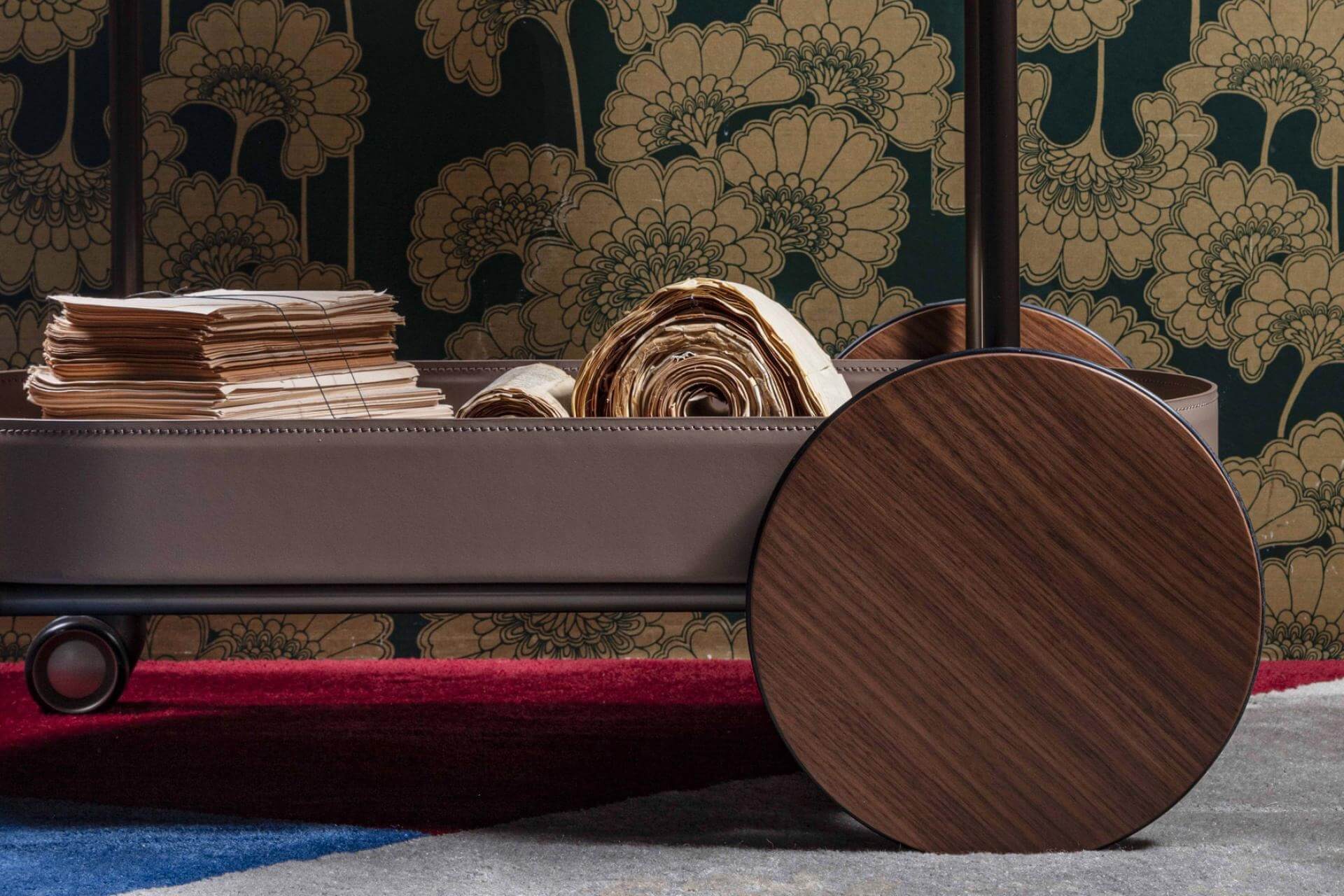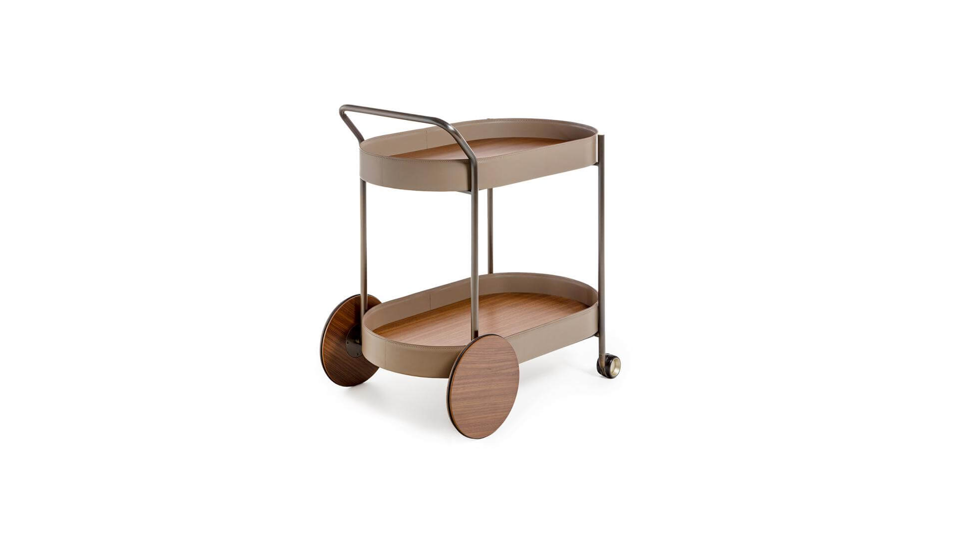 Cart with painted tubolar metal structure. Wheels and trays in wood, edge covered in leather.