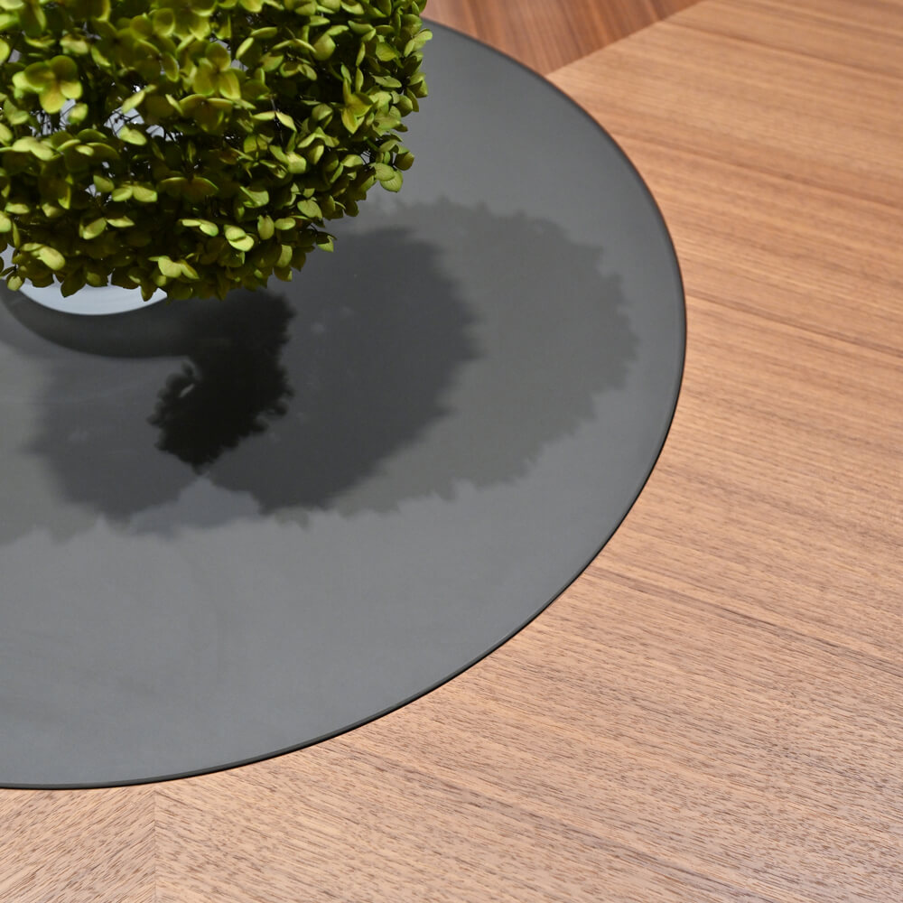 Designed to anchor the center of a space, the table becomes both gathering point and architectural presence. Generous round or elongated forms showcase precise veneer compositions and refined material contrasts, supported by a structural aluminum base that ensures stability at scale. An optional integrated tray adds function without compromising purity.
