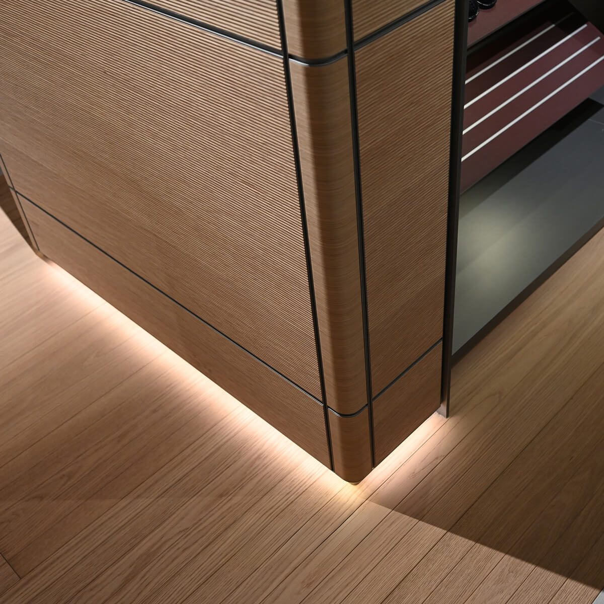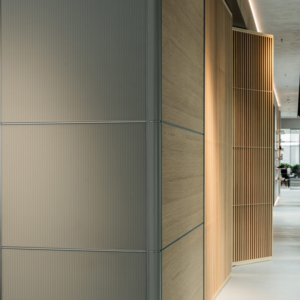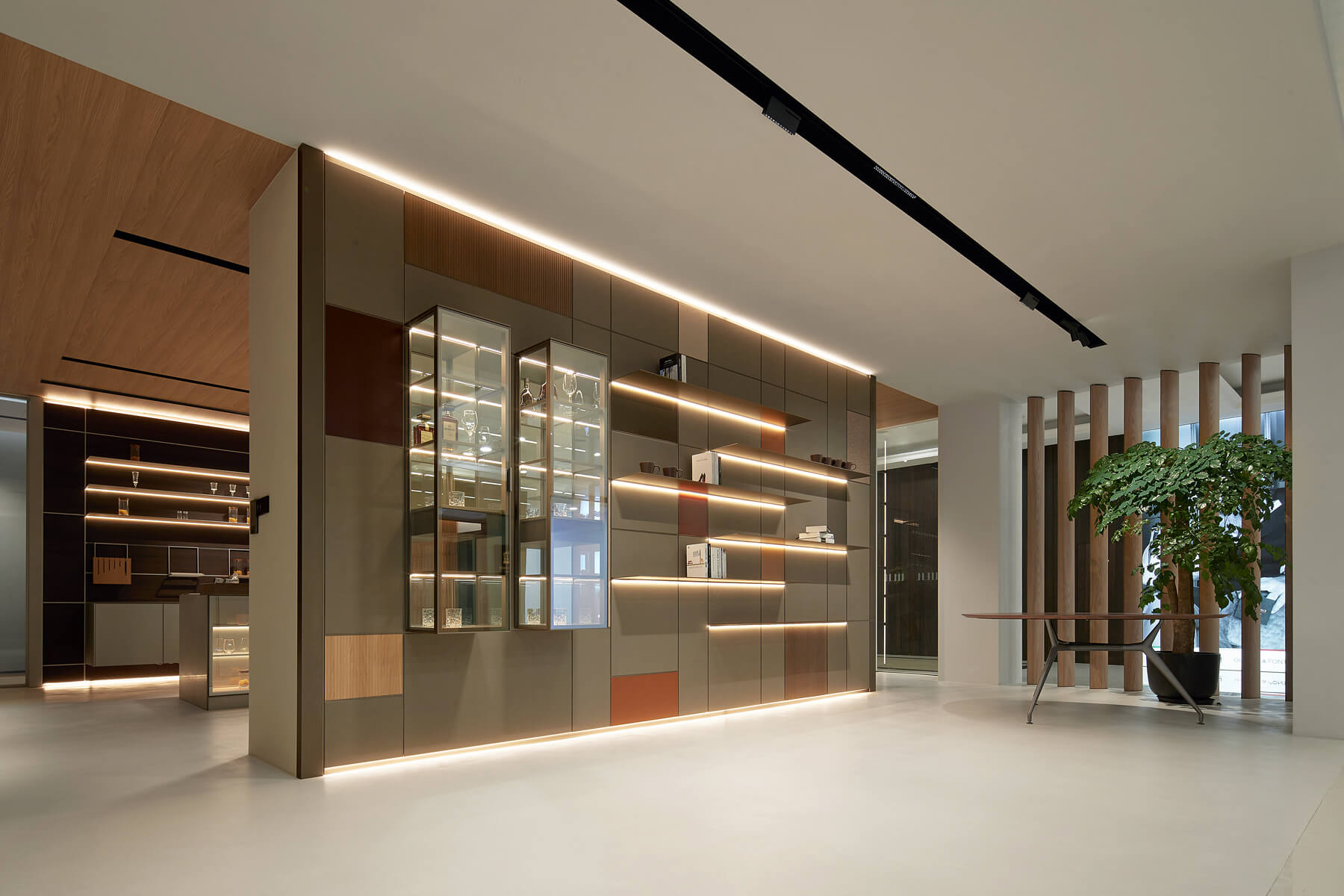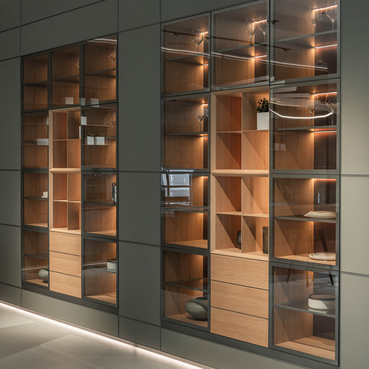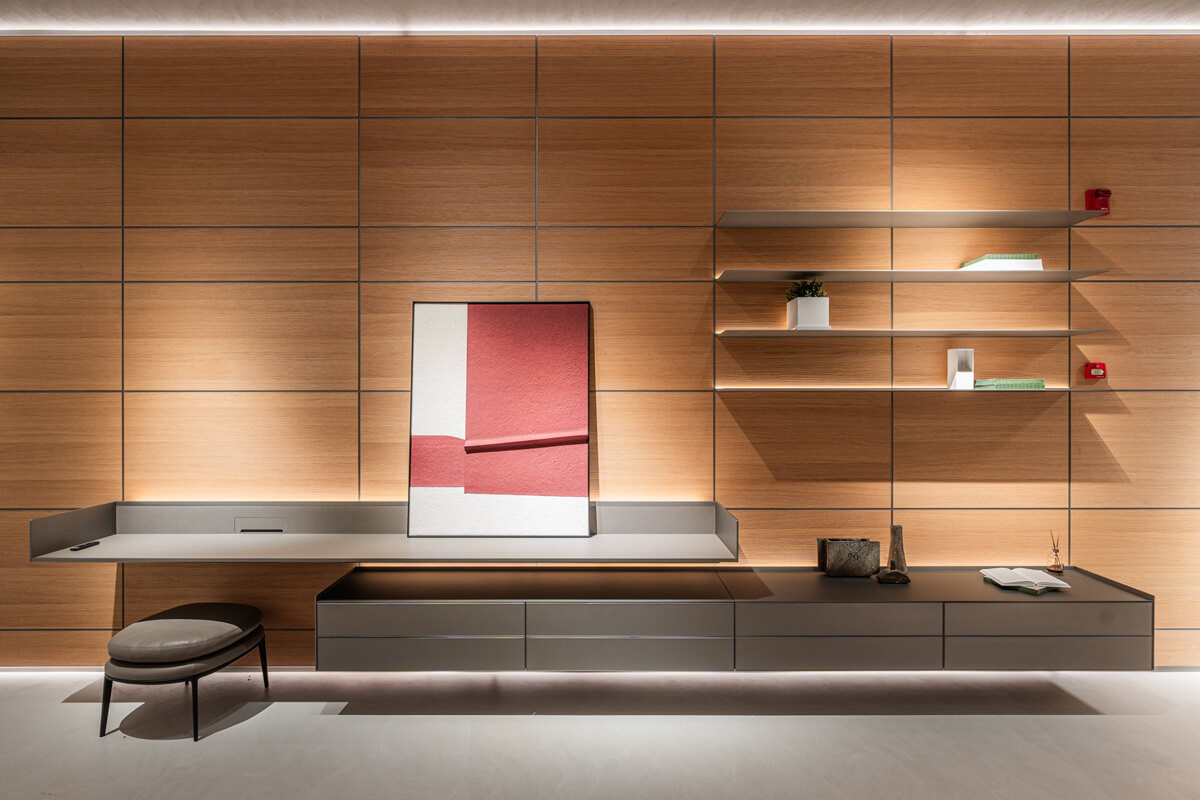 Crafted with precision and a modular mindset, the system enables a wide range of layouts, from open shelving to concealed storage. Patented structural innovations allow shelves, cabinets, and display elements to be freely arranged, adapting effortlessly to evolving needs.
