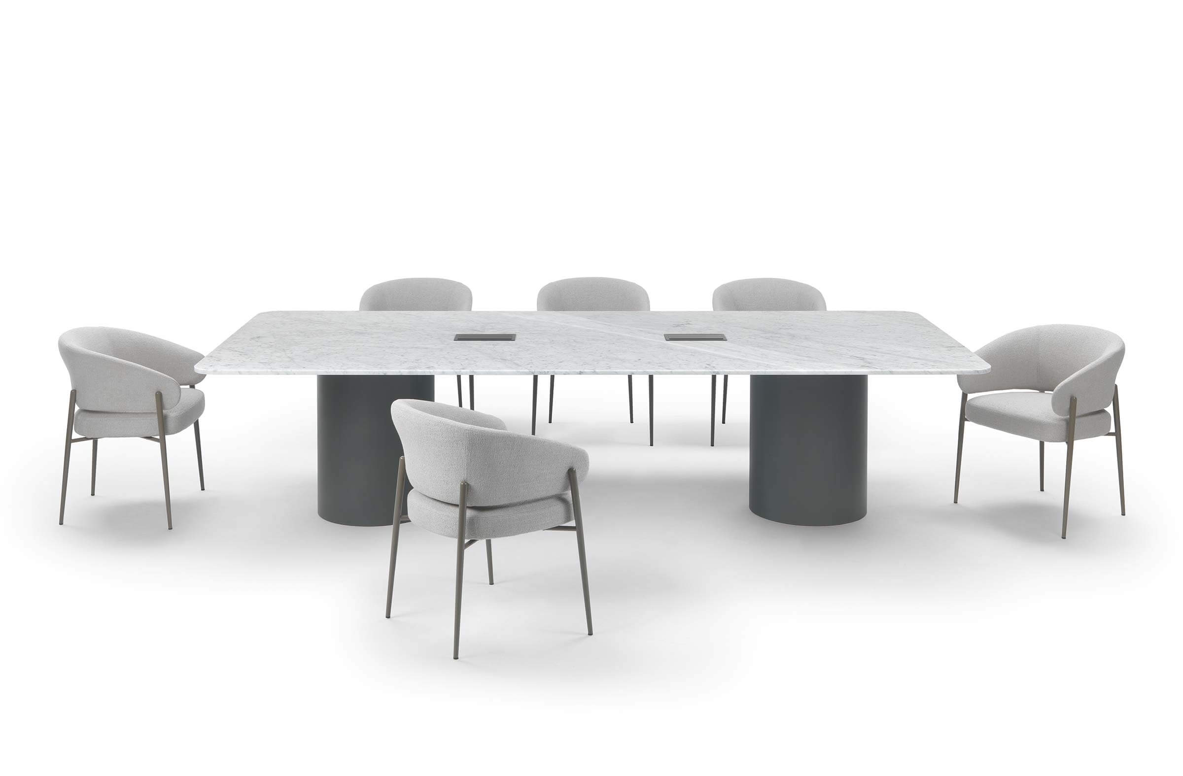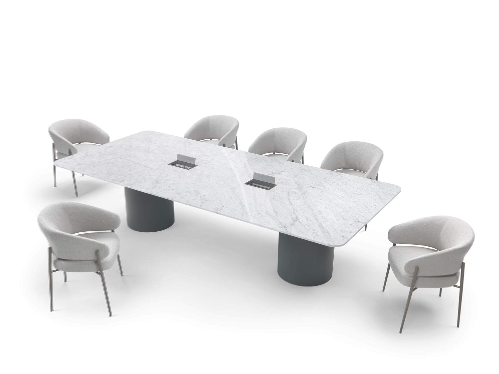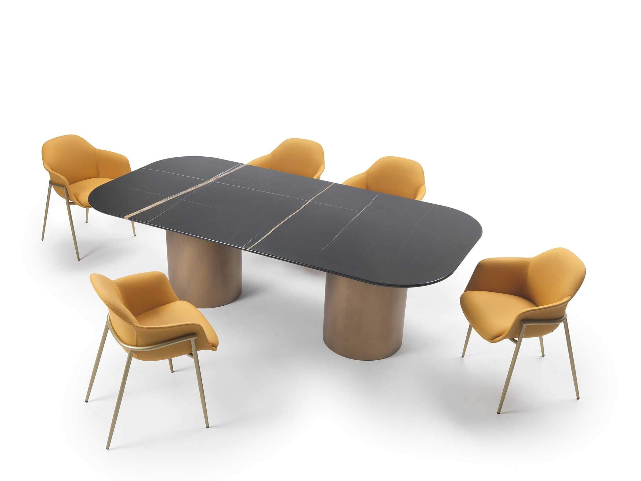 Arthur is a family of dining and coffee tables with sculptural lines and high visual impact. They consist of a metal cylinder base and a top available in marble or glass. This combination of materials gives the coffee tables an elegant and modern look.