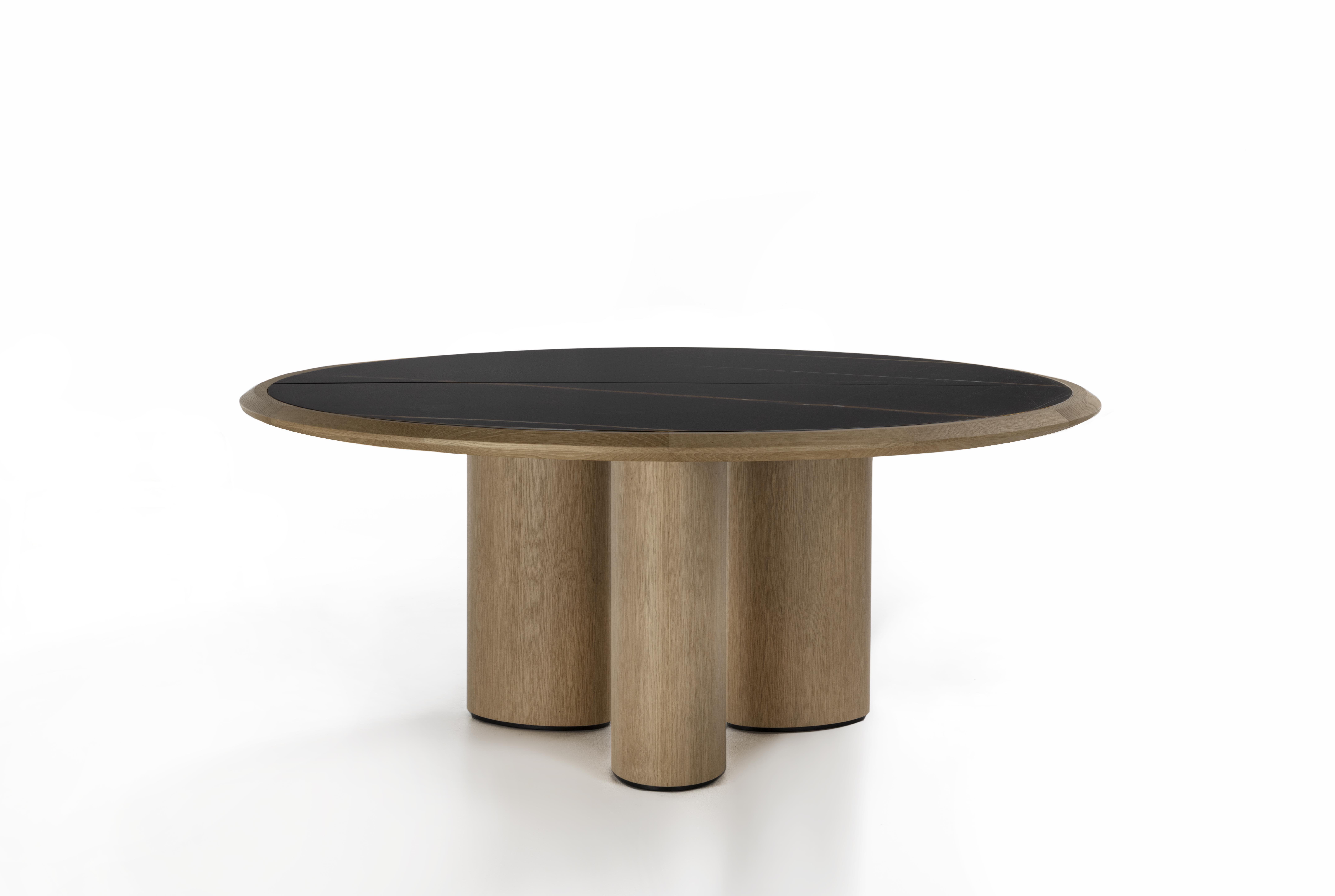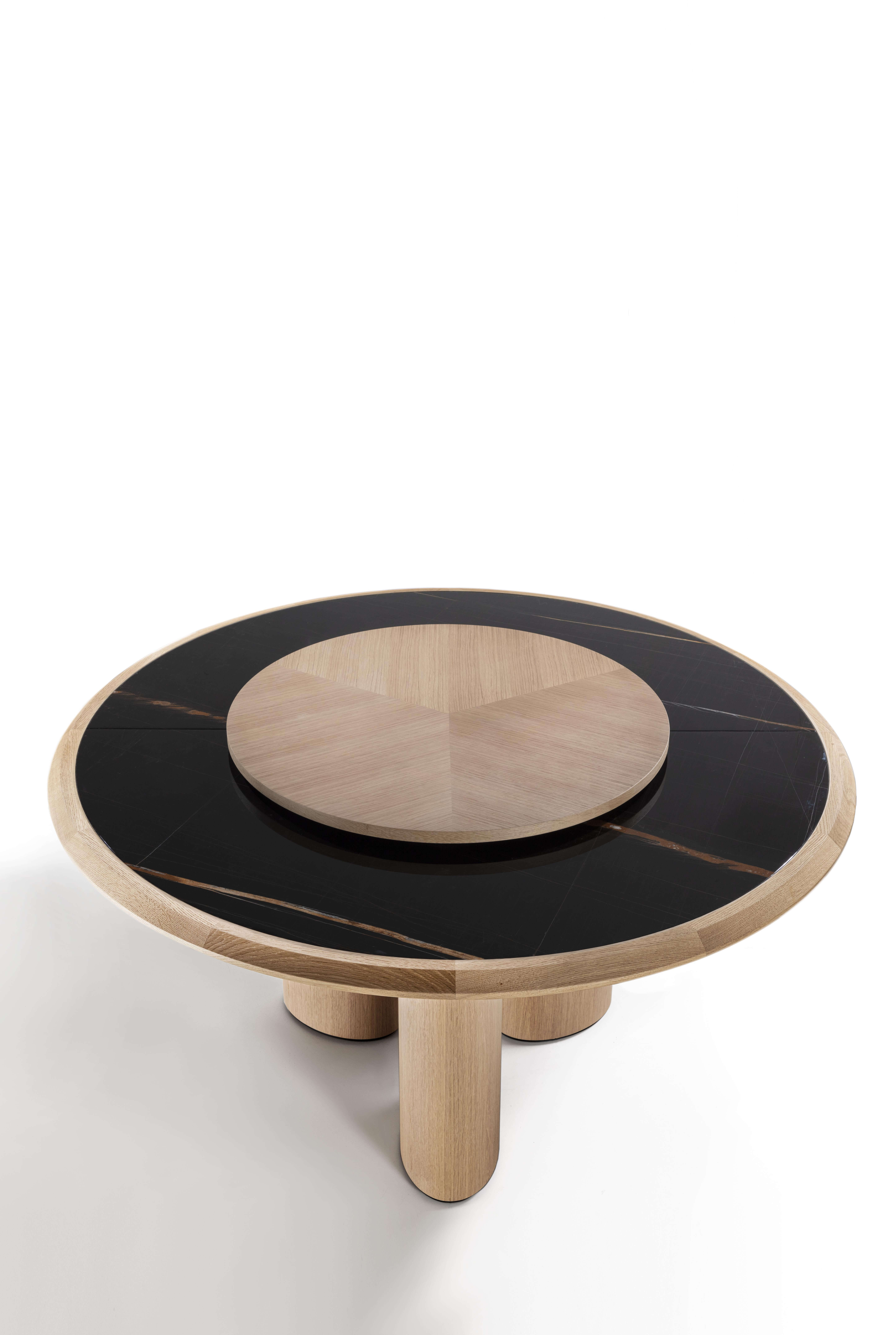 Round table with wooden structure and legs, with top characterized by a solid wood frame where the marble top is inserte.