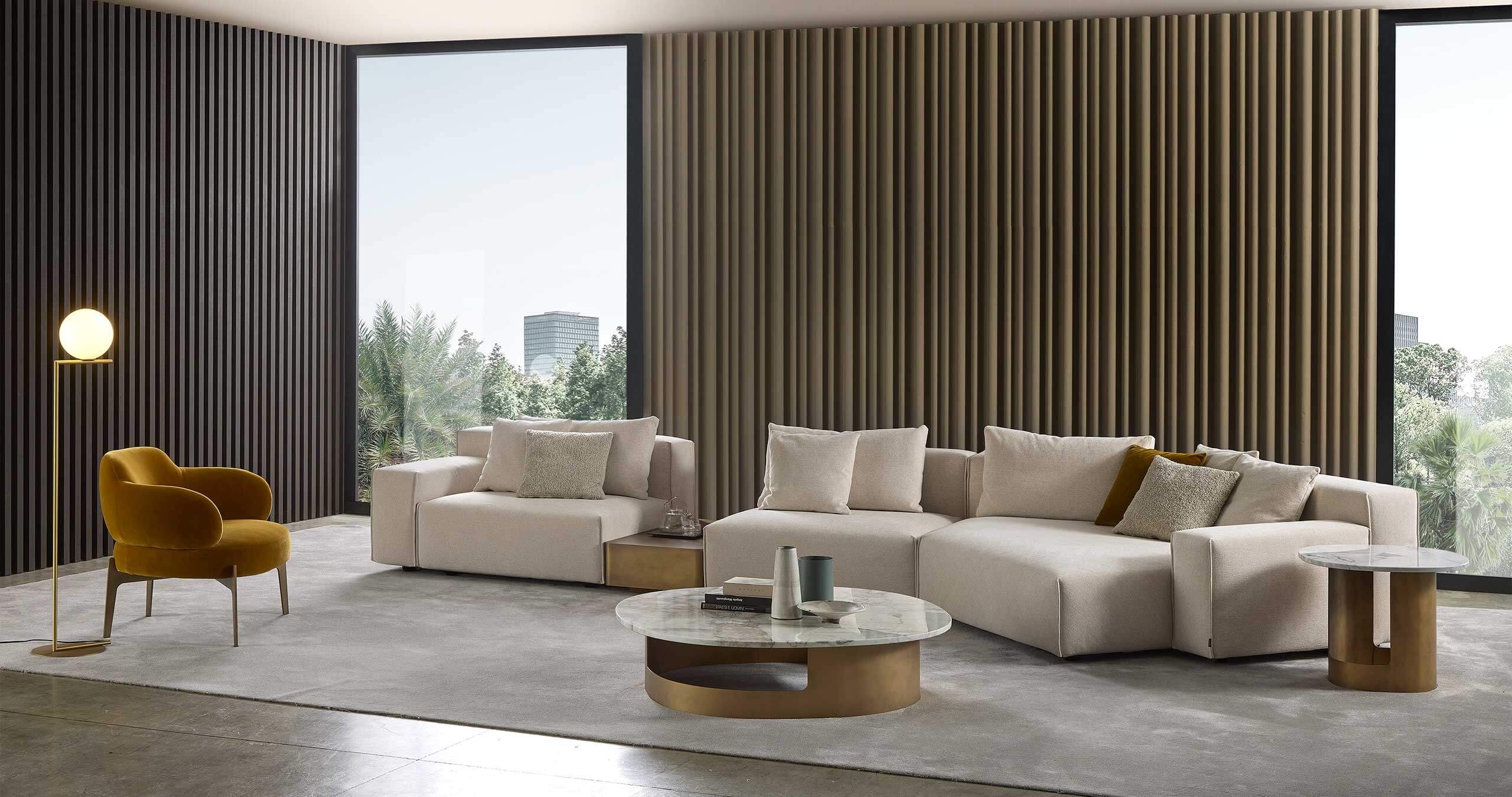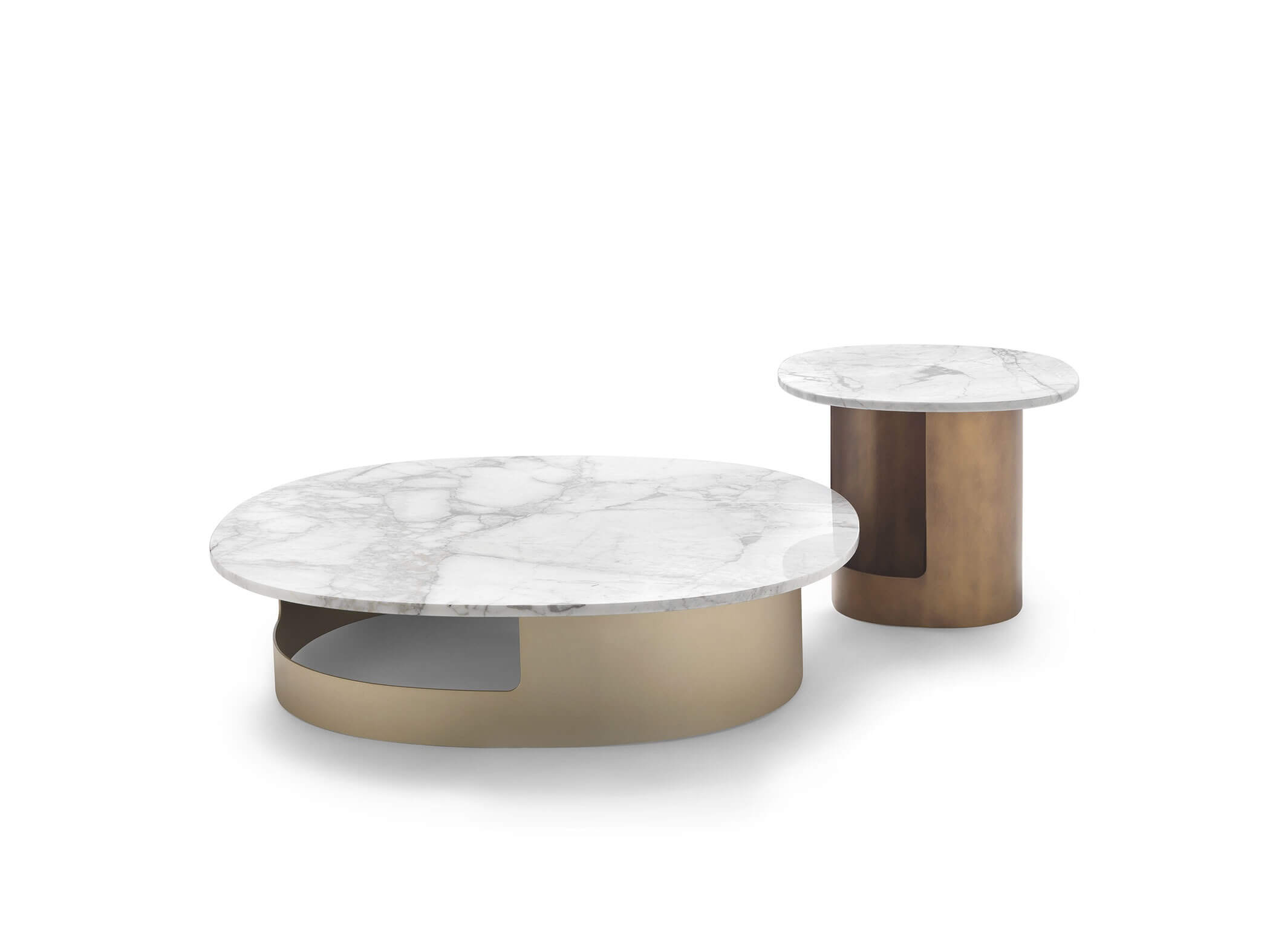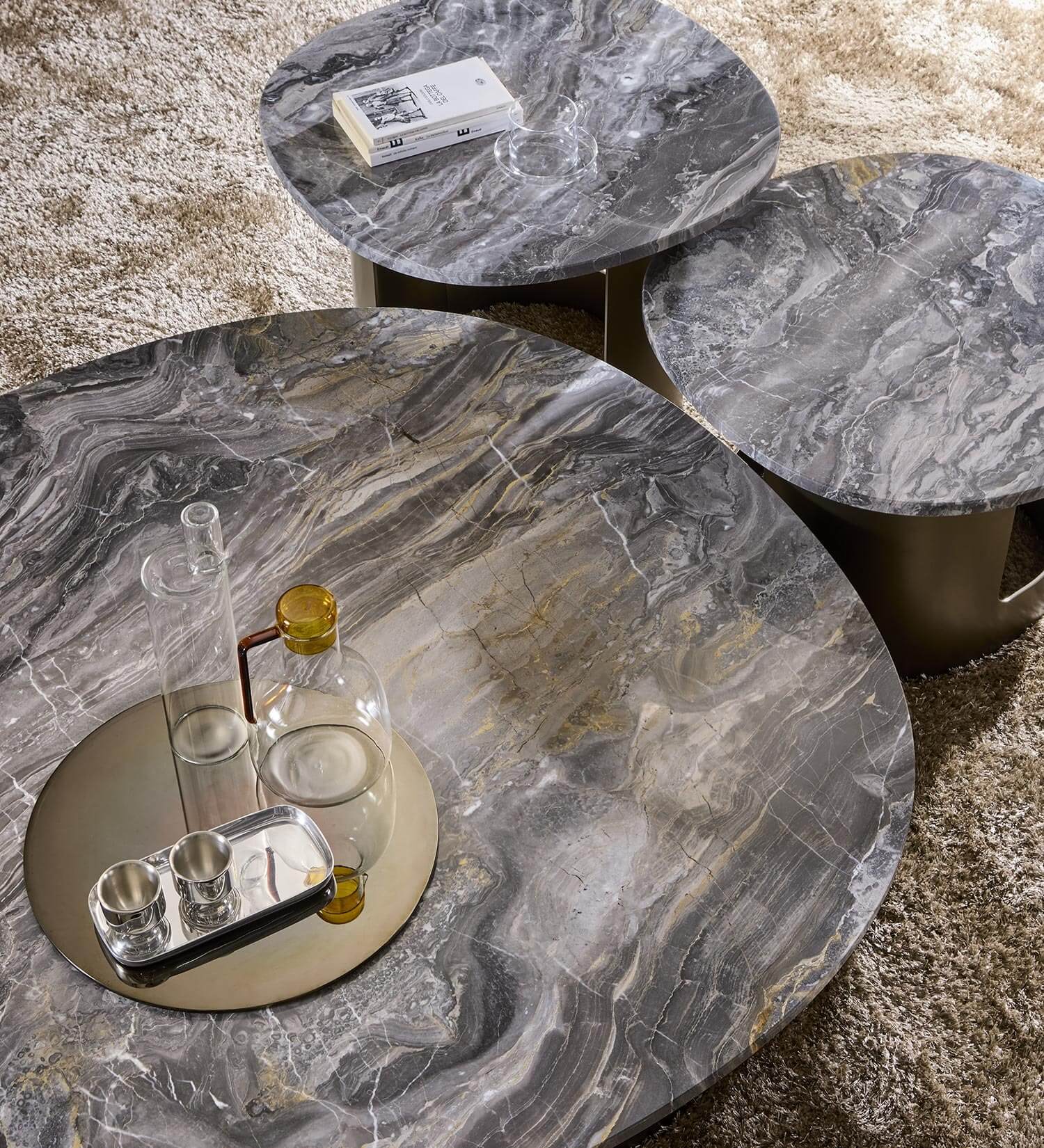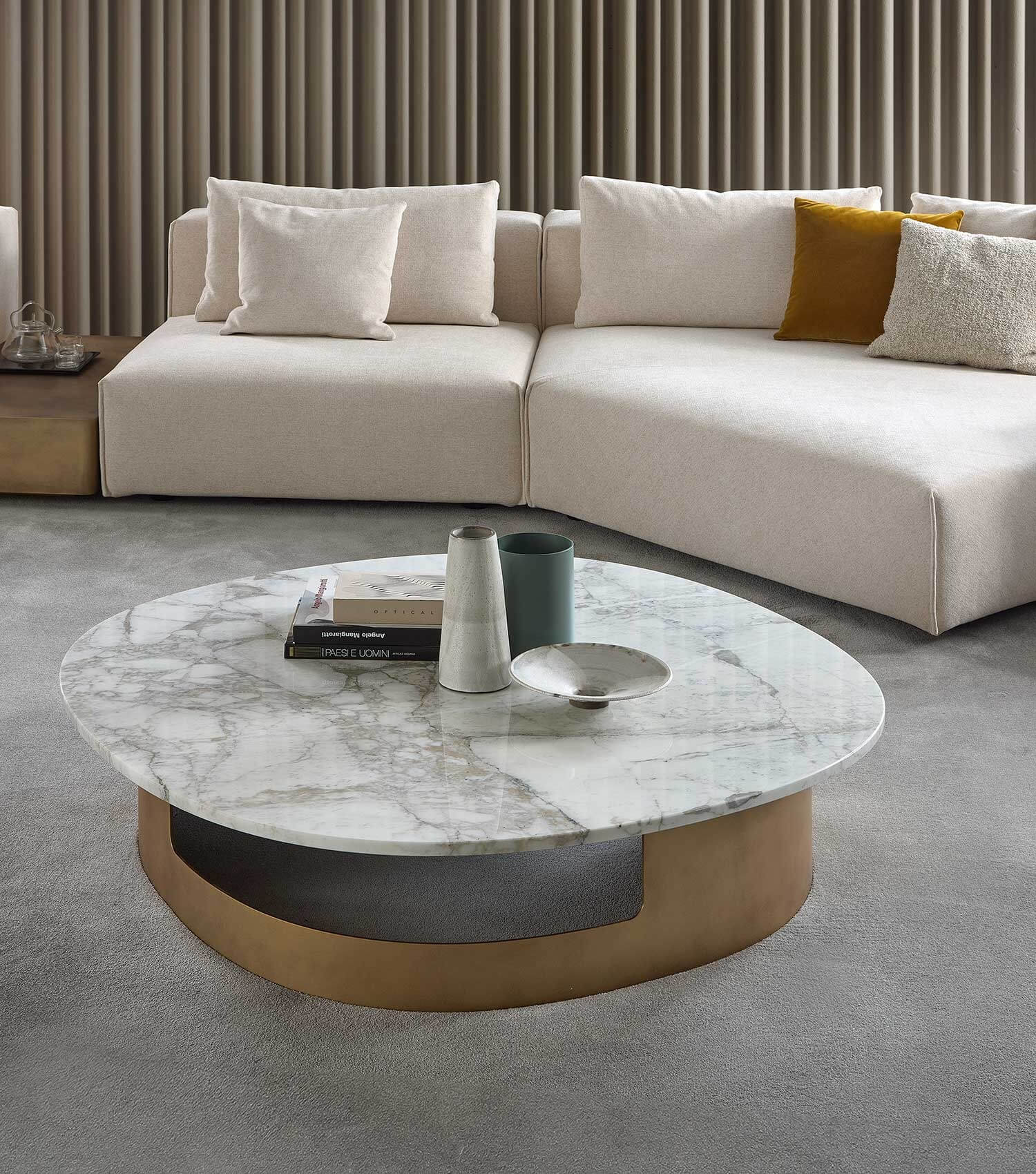 You can opt for a marble, porcelain stoneware or glass top. The base is made of metal, which can be customised with a wide range of finishes available in the catalogue. However, brushed finishes are not available for the base of the Kofi coffee tables.