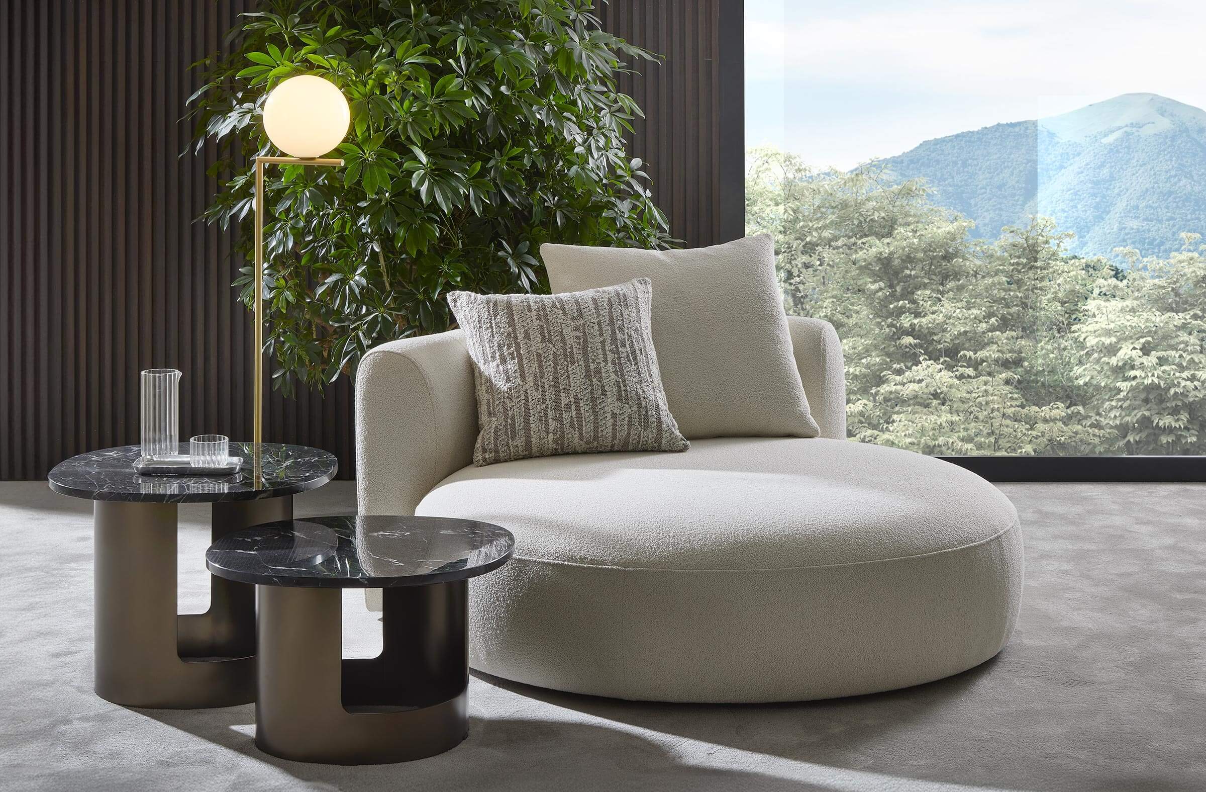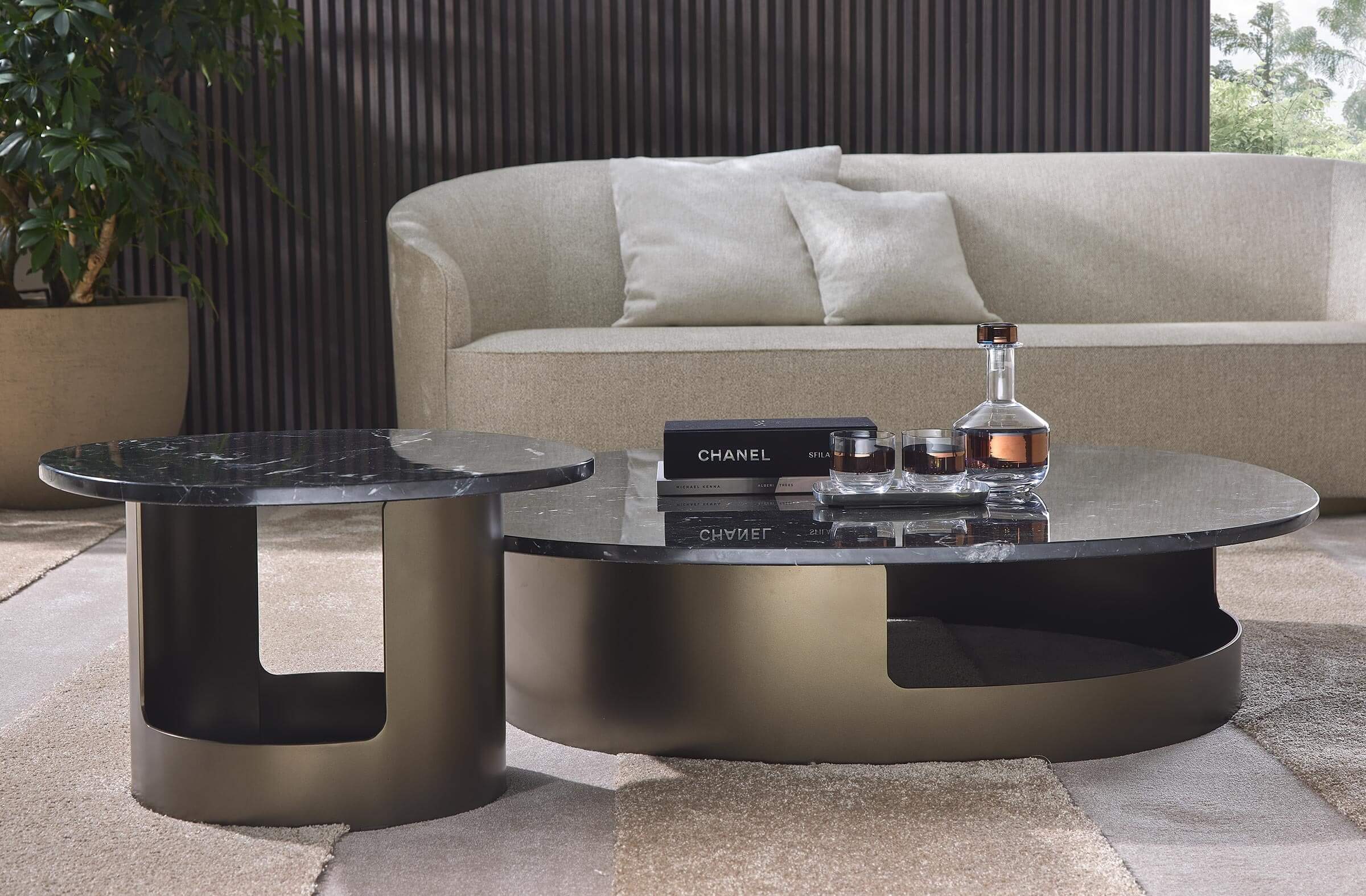 The Kofi side tables have been designed with particular attention to contract environments, such as hotels and lobbies, where their presence can enhance spaces and provide a focal point of design. However, thanks to their versatility and aesthetic appeal, they also fit perfectly in residential living rooms, adding a touch of elegance and sophistication.