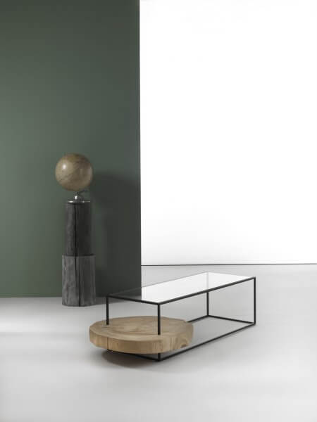 Side table formed by a painted metal structure, with a glass top and a cedar trunk section. A linear geometrical shape made of metal and glass catches a log wood section and blends with It to share their identities and functionalities.