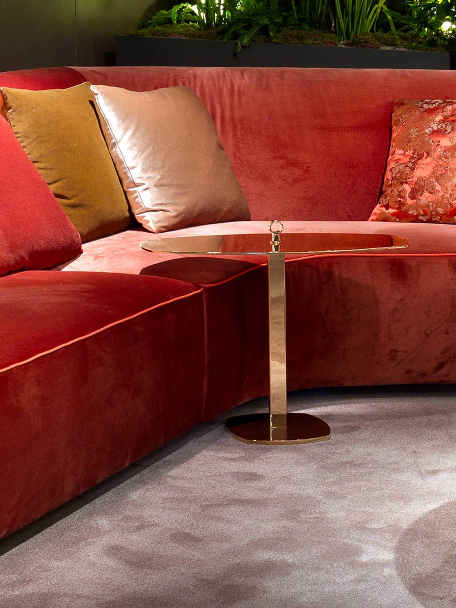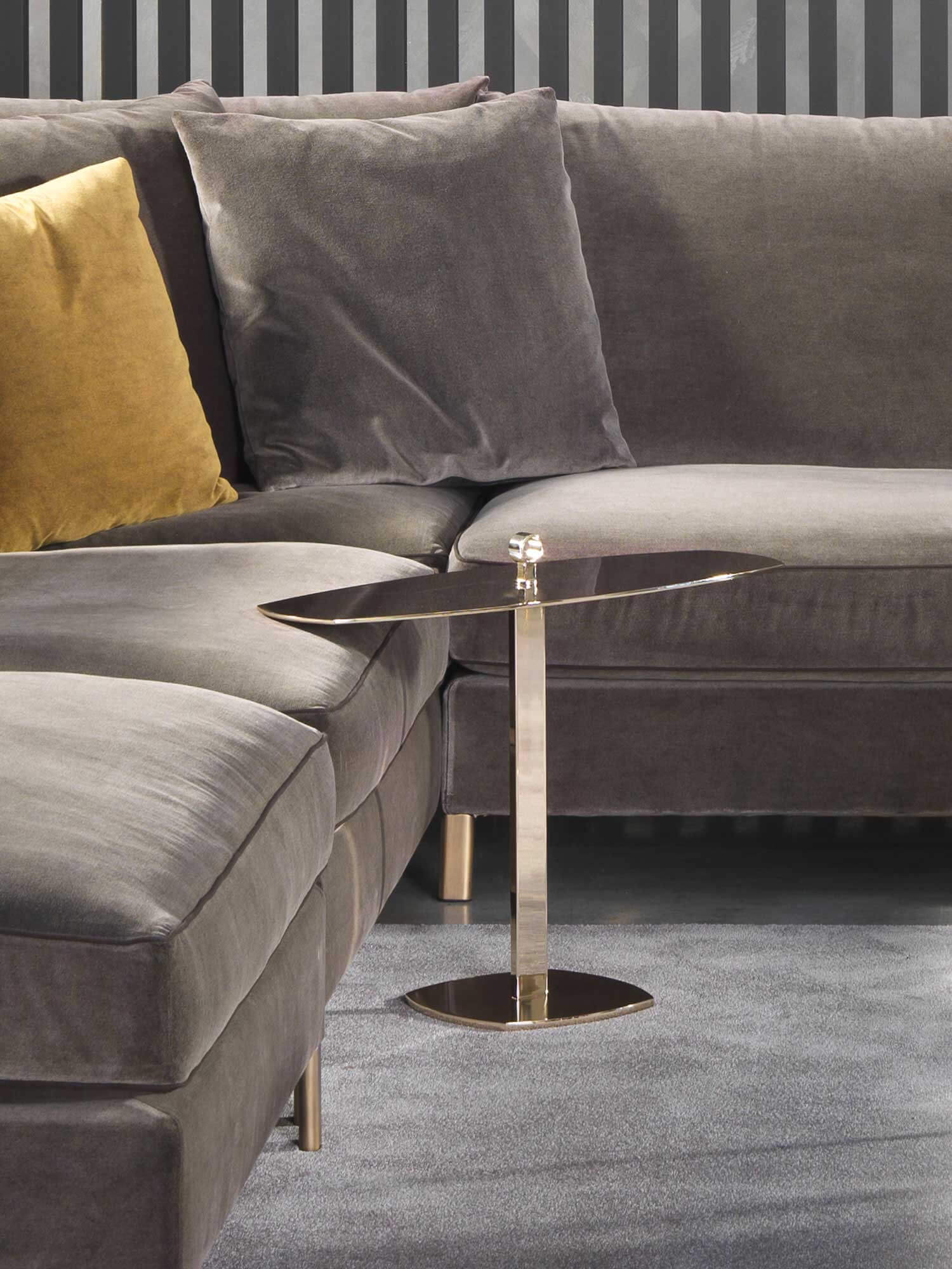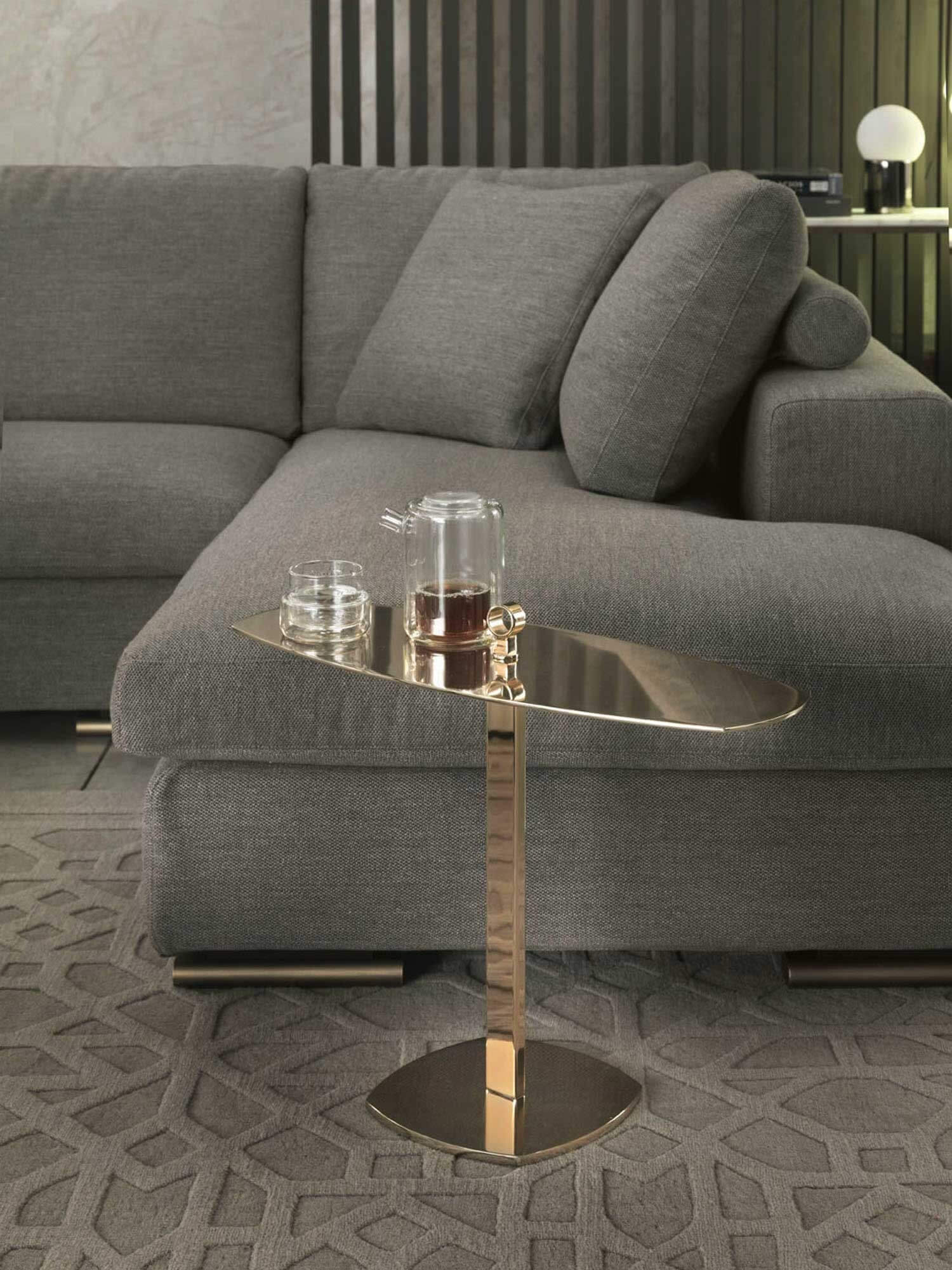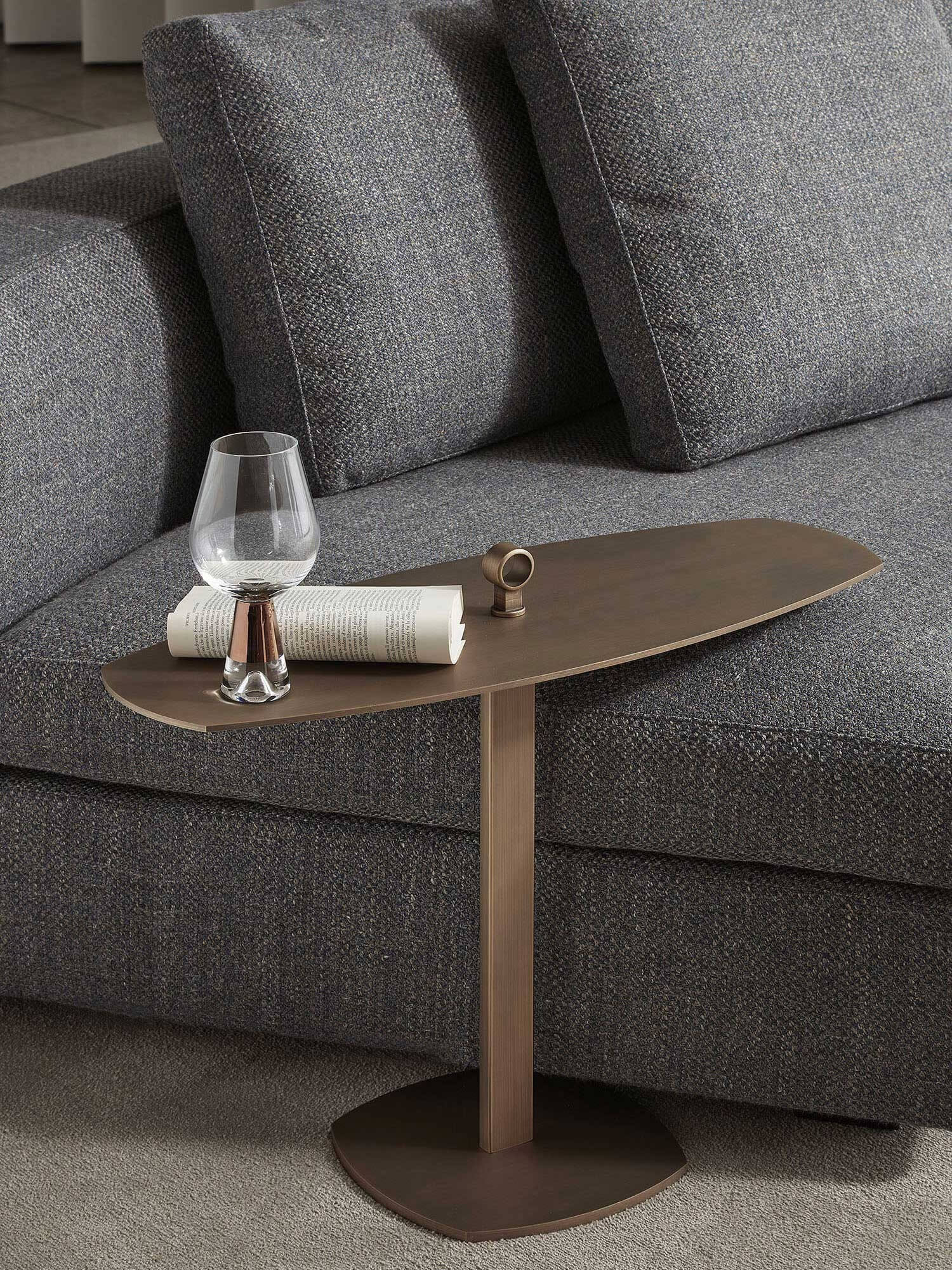 Leaf is an elliptical design server made of metal, designed to be placed next to the sofa so that you always have the items you need most at hand. Its elliptical shape fits well into the seat cushion of the sofa, providing a convenient holder for storing small items such as remote controls, glasses, smartphones or other accessories.