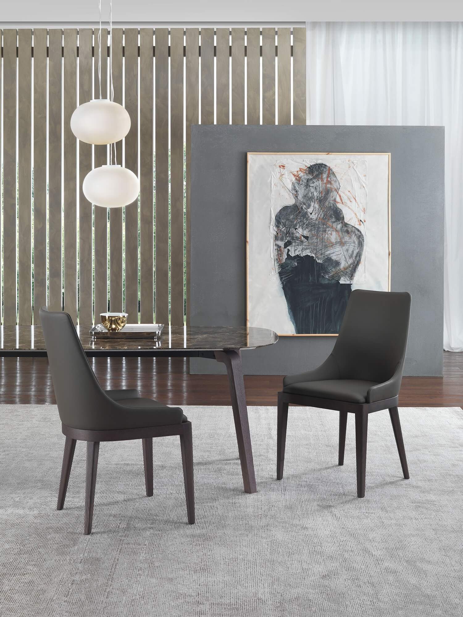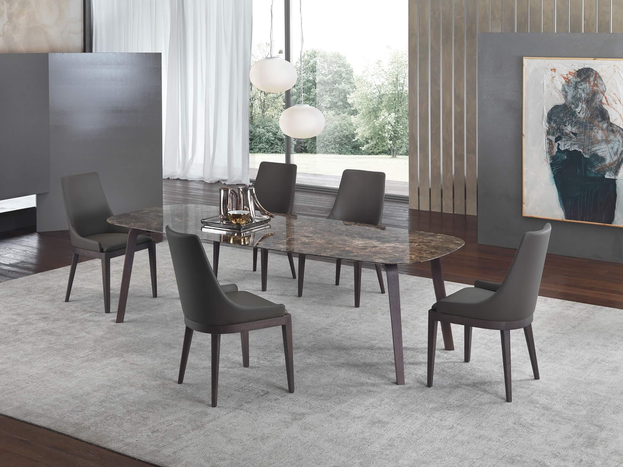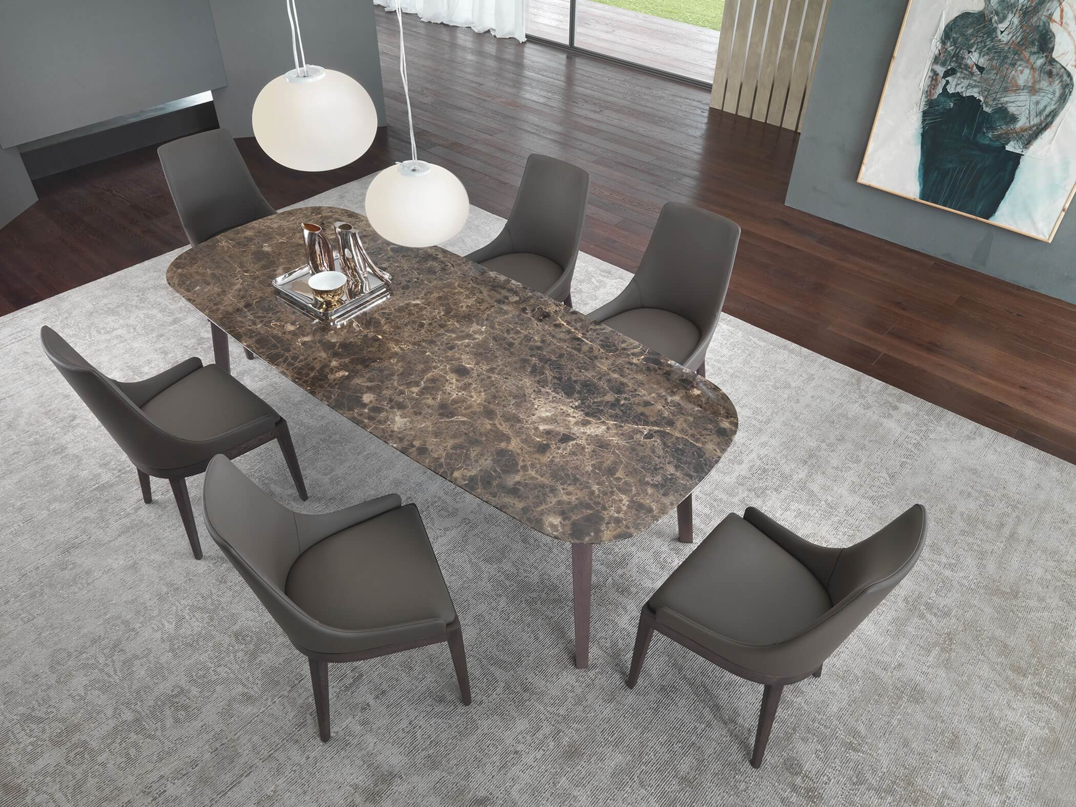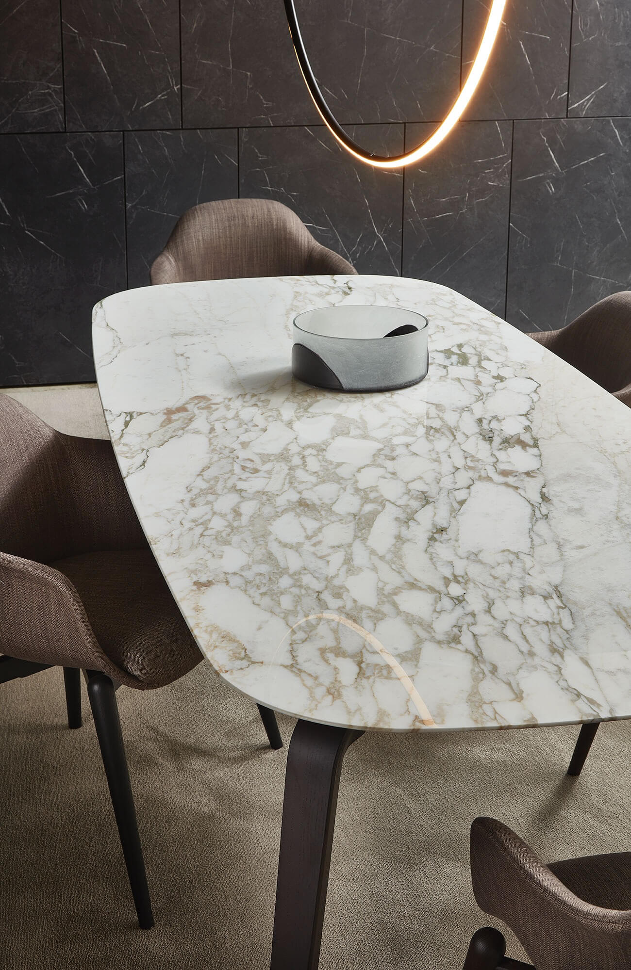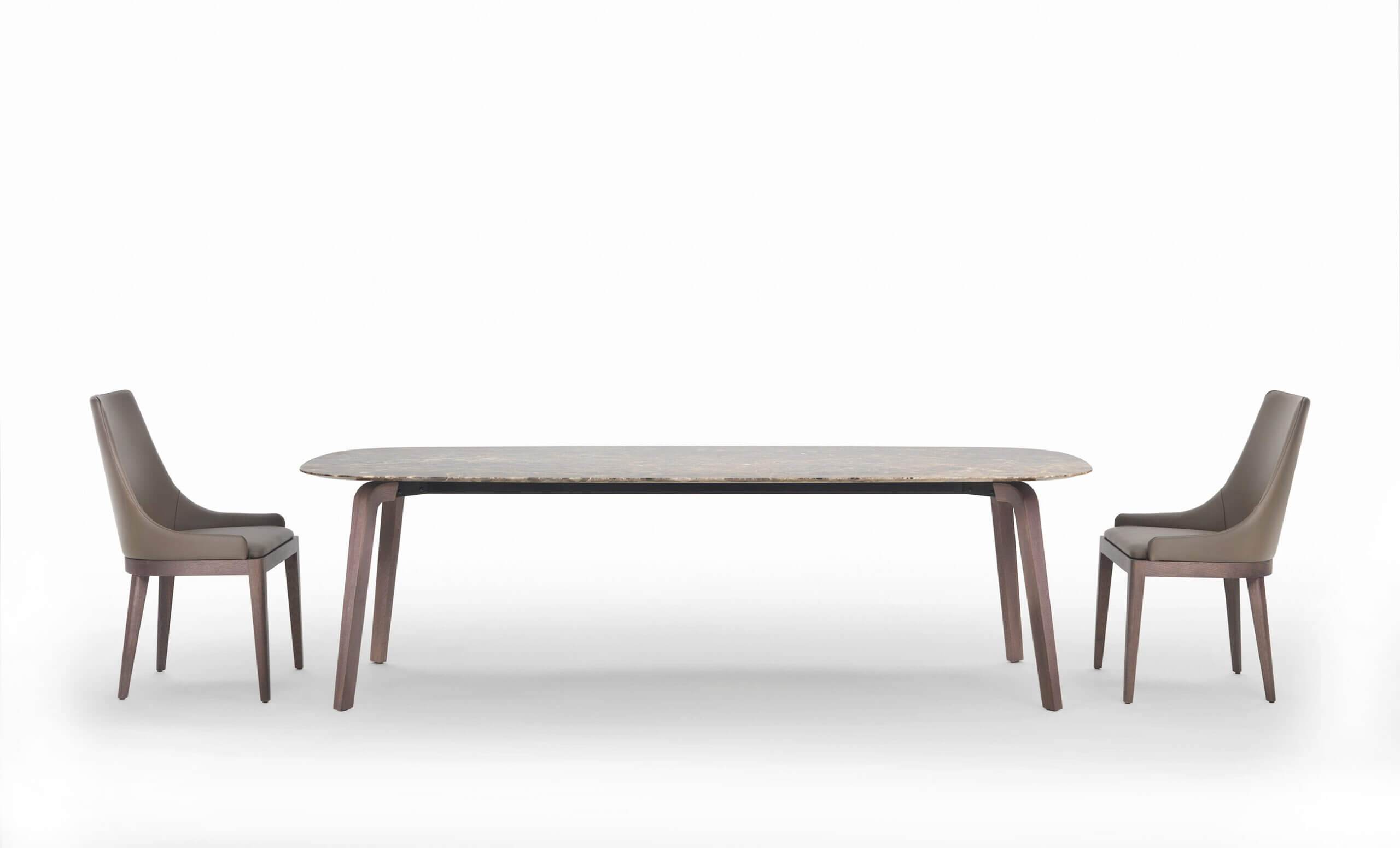 The rectangular top with rounded corners lends a touch of refined elegance without compromising functionality. The finishes are meticulously crafted and reflect high-quality craftsmanship. The table base is made of metal covered in solid wood and features precision craftsmanship. Additionally, you can choose from several tabletop options, including wood and marble, offering a wide selection of finishes.