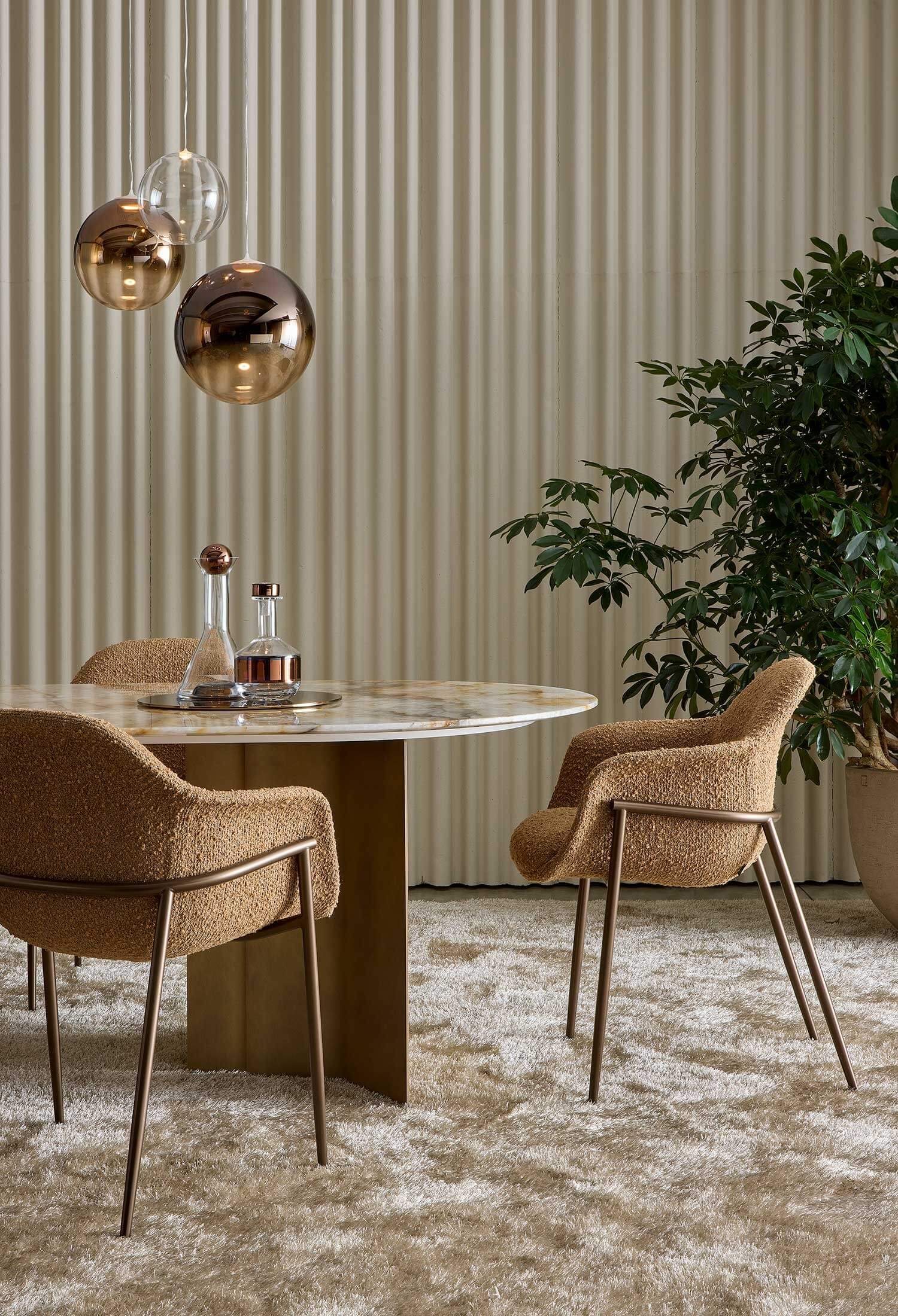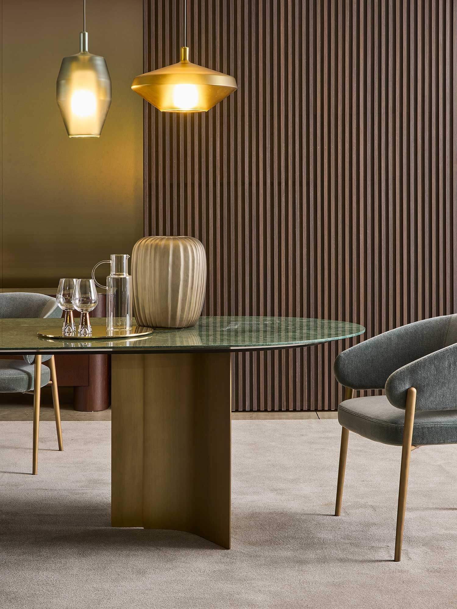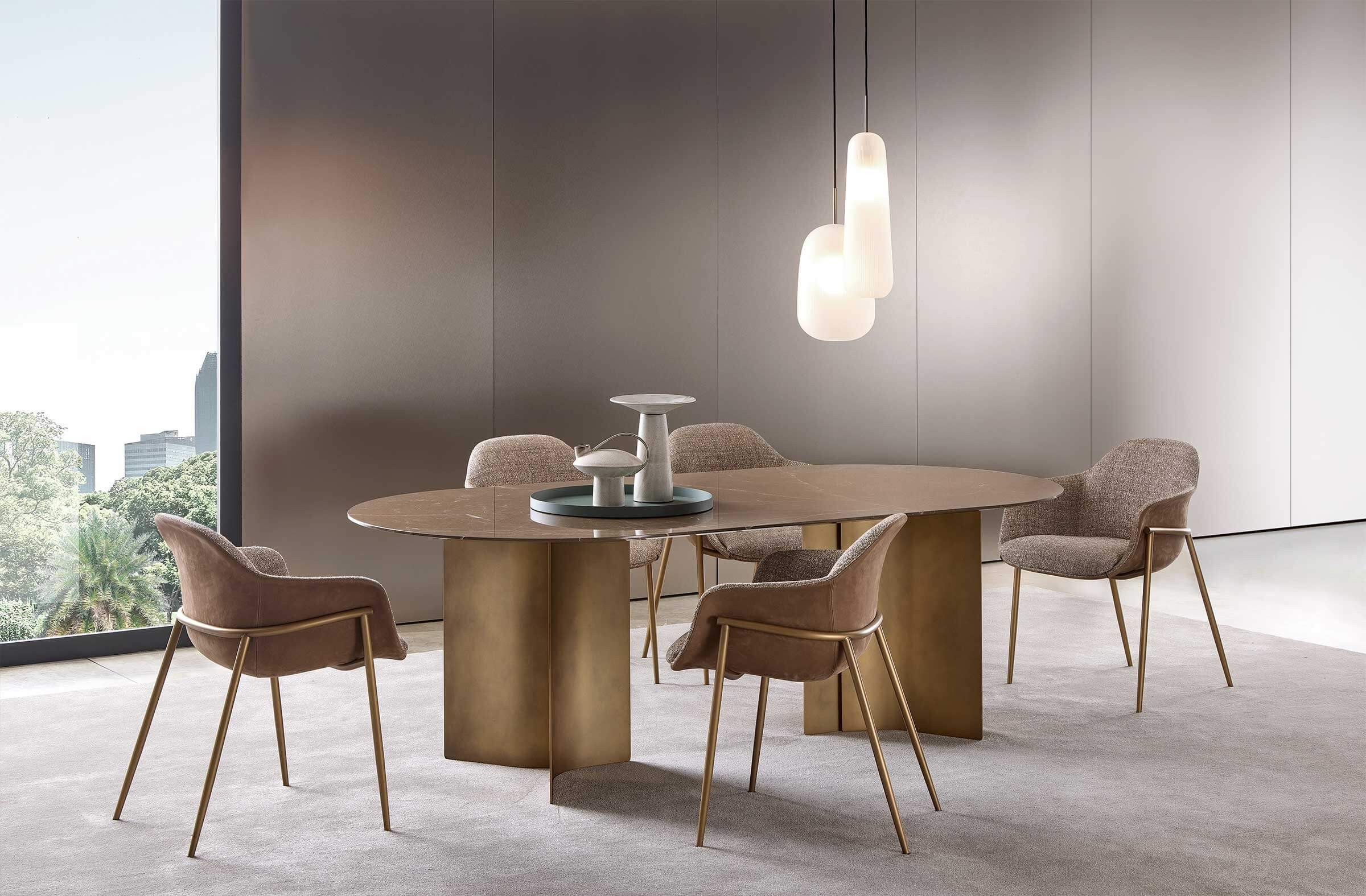 The steel bases, available in the new sophisticated Delabrè or Pewter metallic finishes, add further refinement and ensure structural solidity without compromising the overall aesthetic.