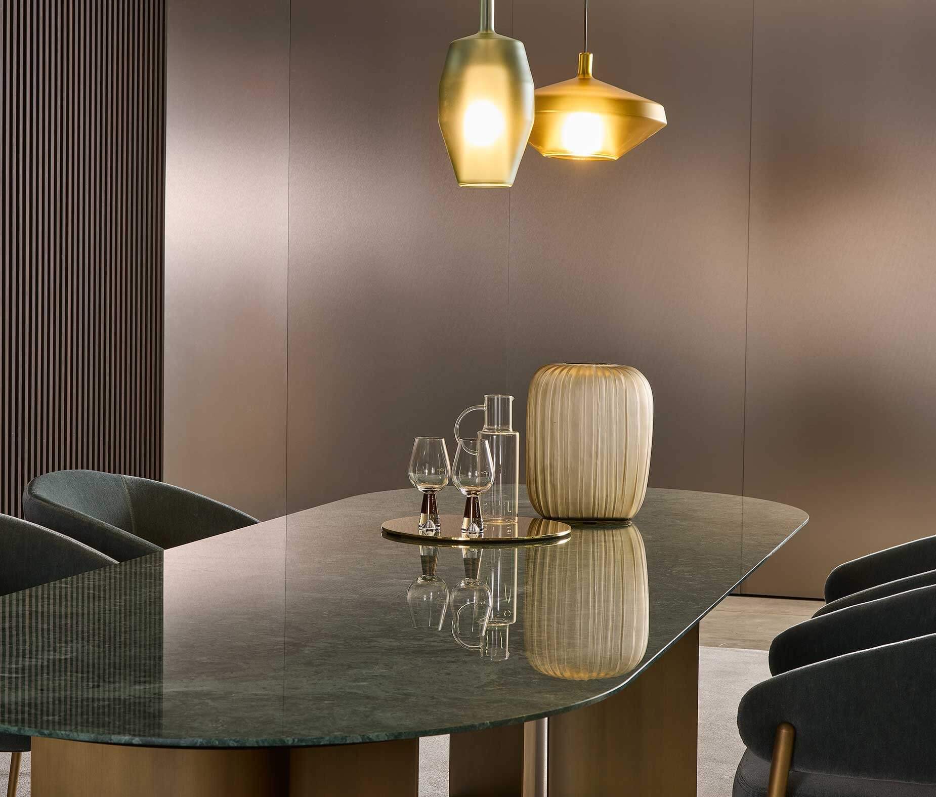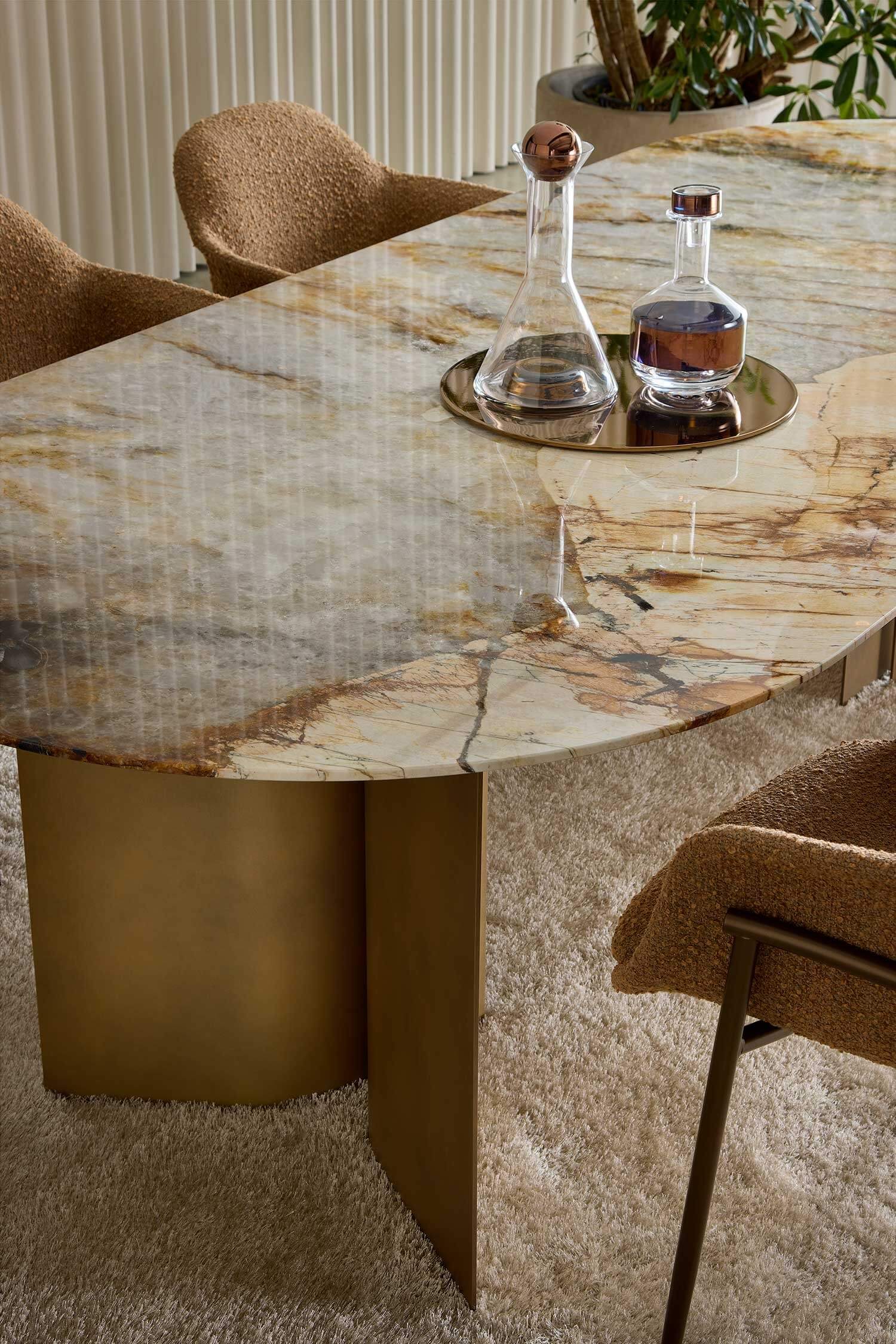 The tops are available in 18 precious marbles, in rectangular or round shapes, offering a wide range of customisation possibilities to suit different stylistic contexts. The choice of marble enhances the sophistication of the collection and gives it a timeless elegance.